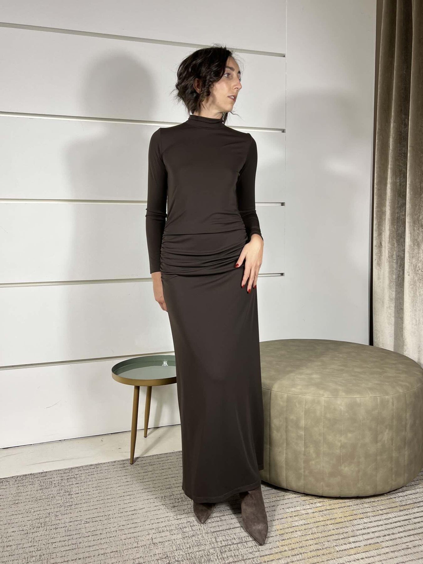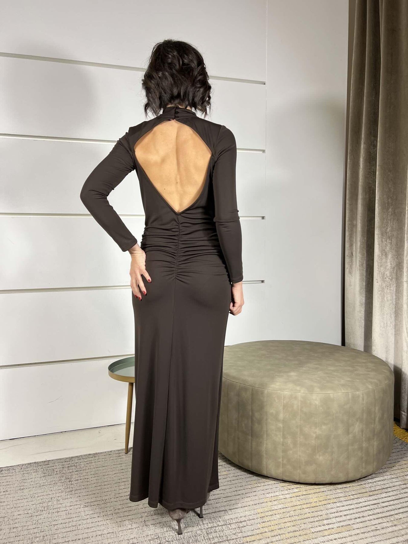 abito Vicolo moro lungo manica lunga con apertura nel retro e arricciatura. La modella è una 40 ed è alta 172cm. Composizione 95%pl 5%ea