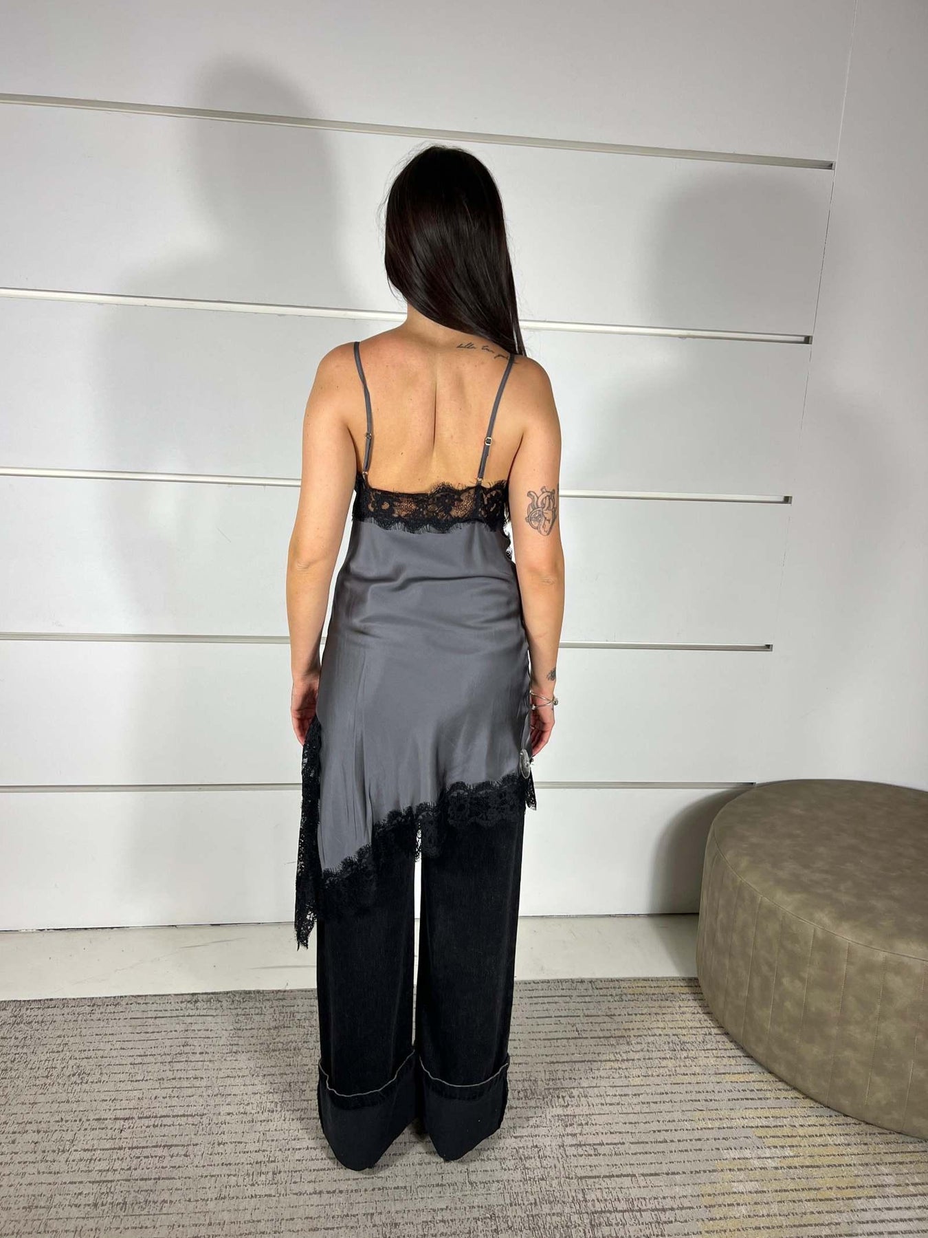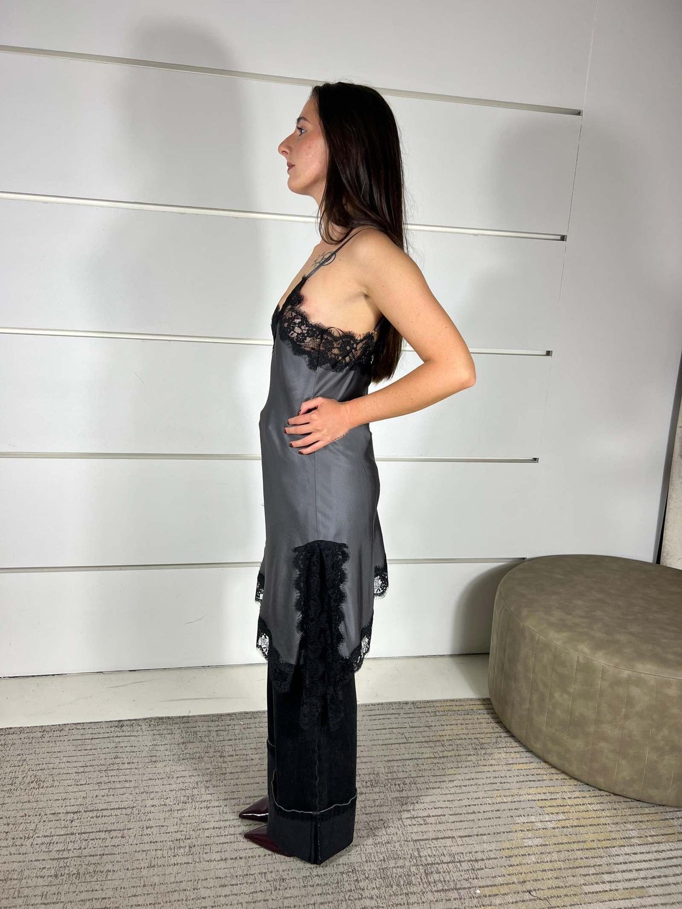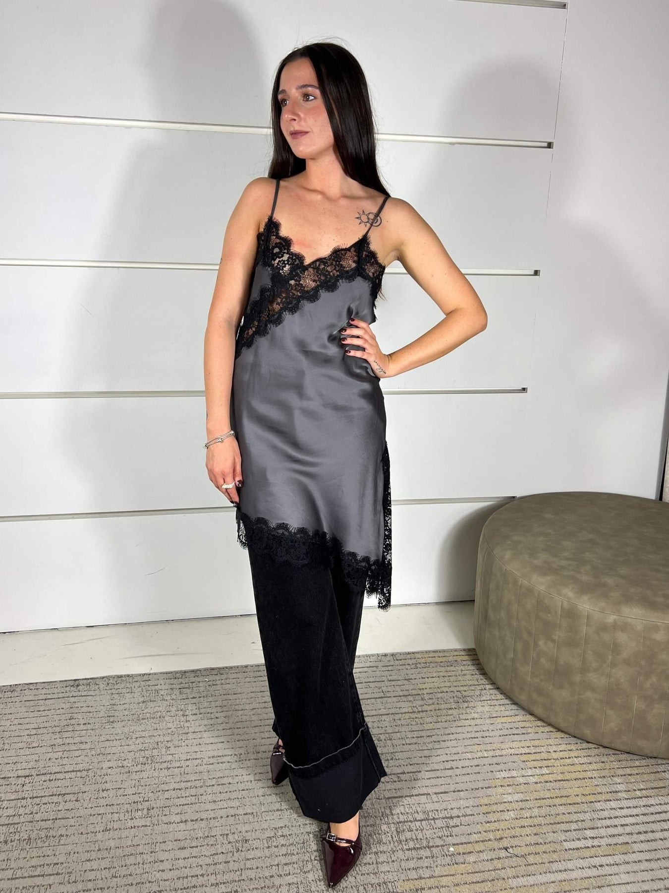 abito Vicolo grgio con fondo asimmetrico in pizzo nero, in viscosa, la modella indossa la m ed è una 42 ed è alta 175cm. Composizione100%vi