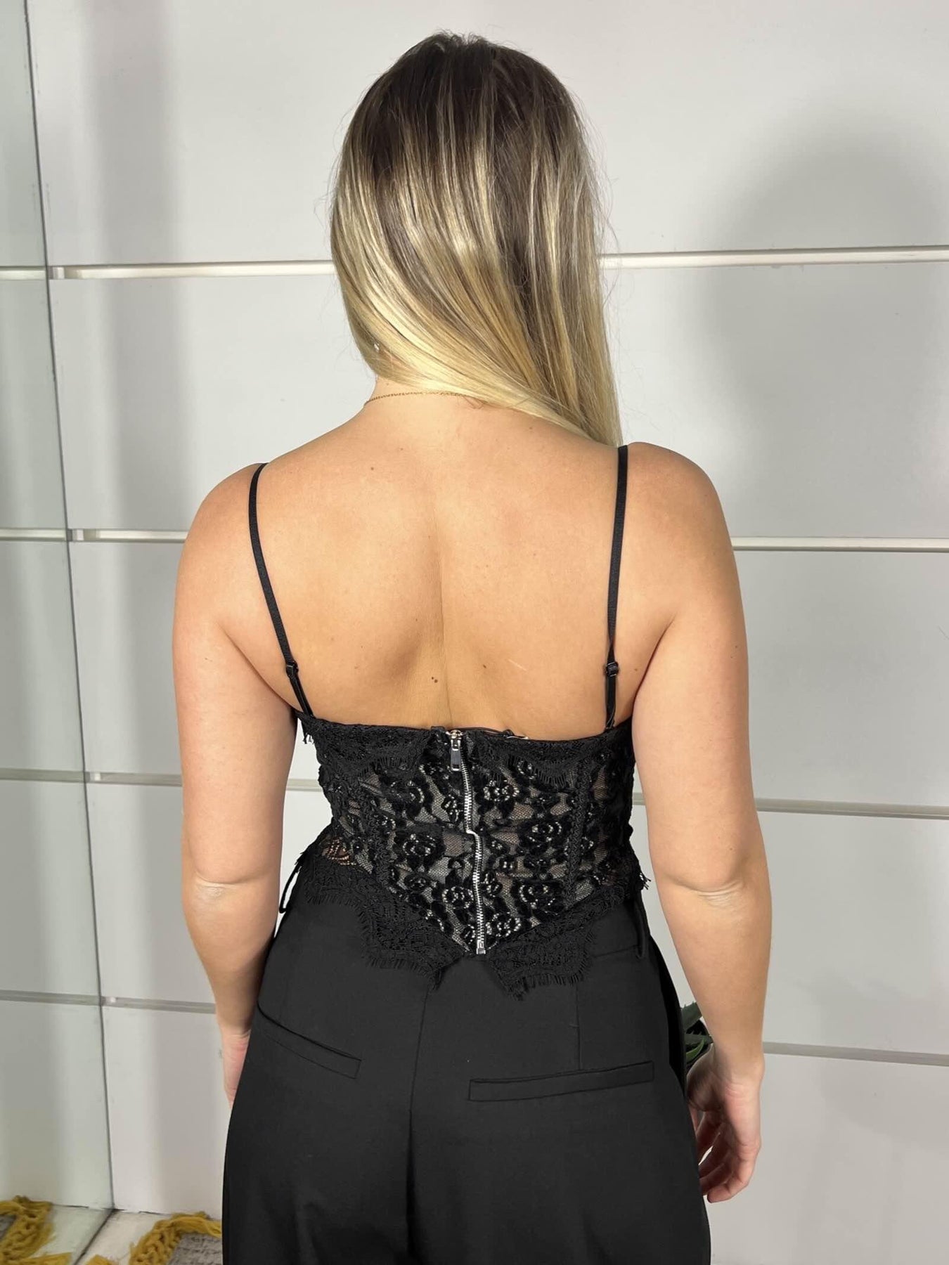 Corpetto Femme Selection nero in pizzo, chiusura dietro con zip , la modella è una 40 ed è alta 172cm, veste da una 38 a una 44, misto viscosa