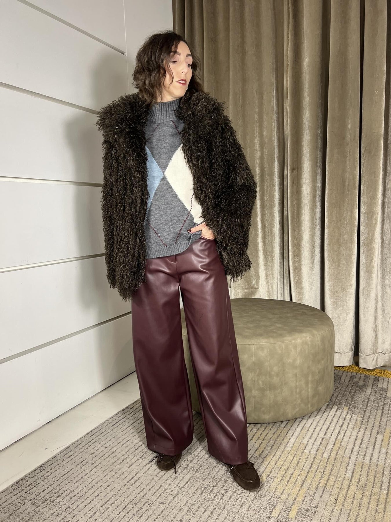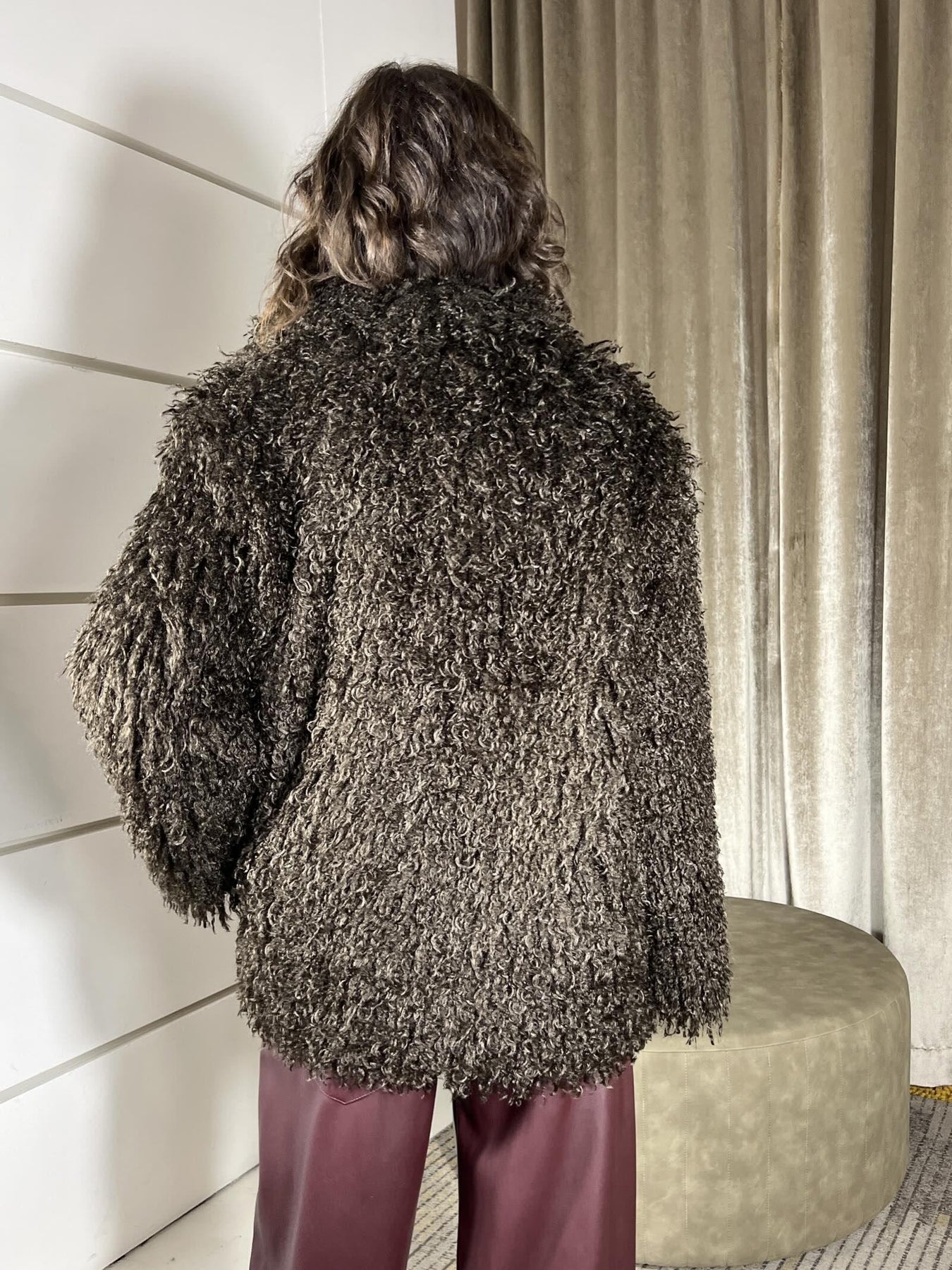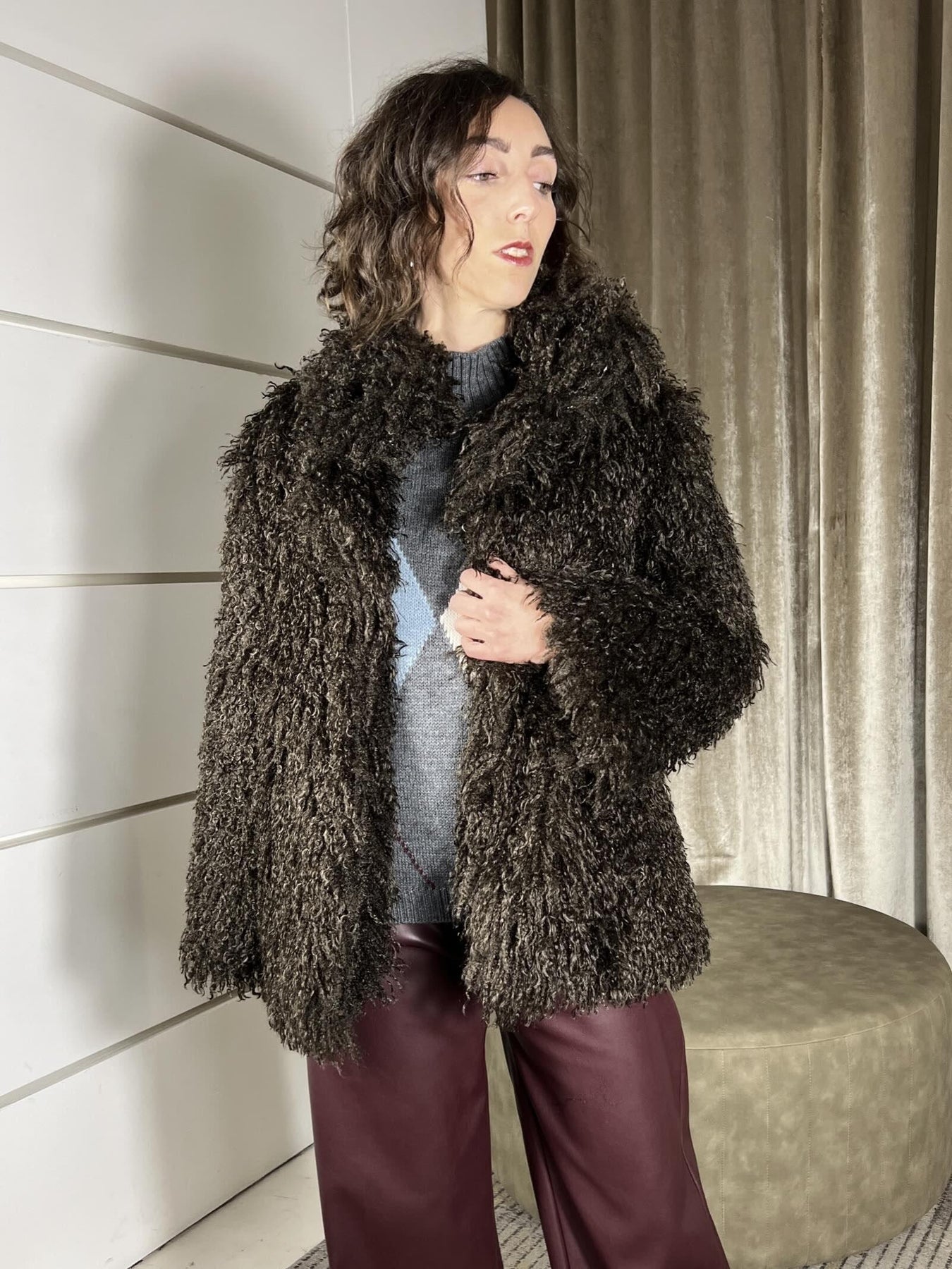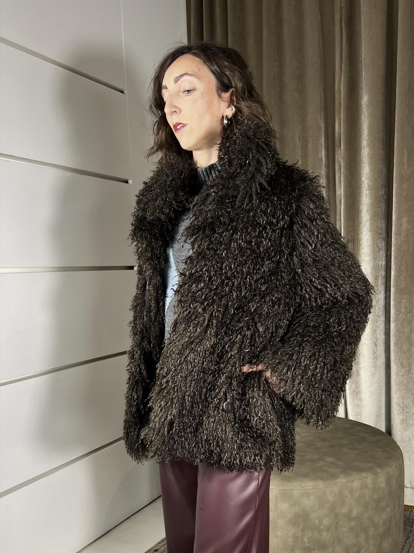 eco pelliccia mongolia HaveOne moro, over con collo a giacca, la m odella è una 40 ed è alta 172cm. Composizione 100%pl-100%pl