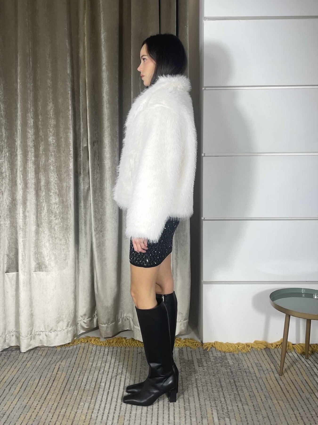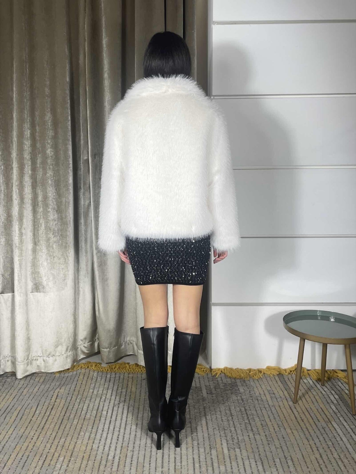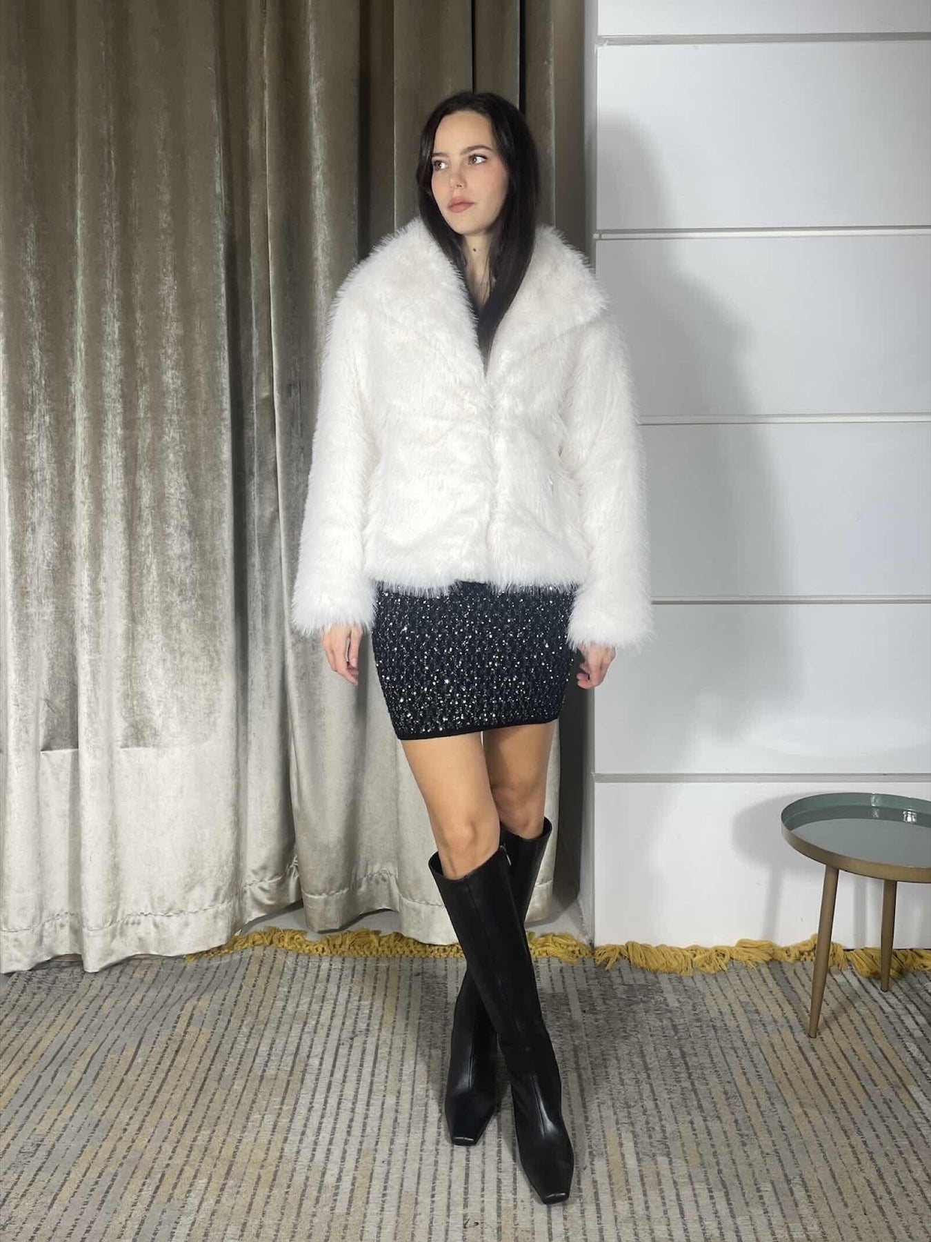 Ecopelliccia Carla G corta vanilla, la modella indossa la 40 ed è alta 174cm. Composizione 100% poliestere