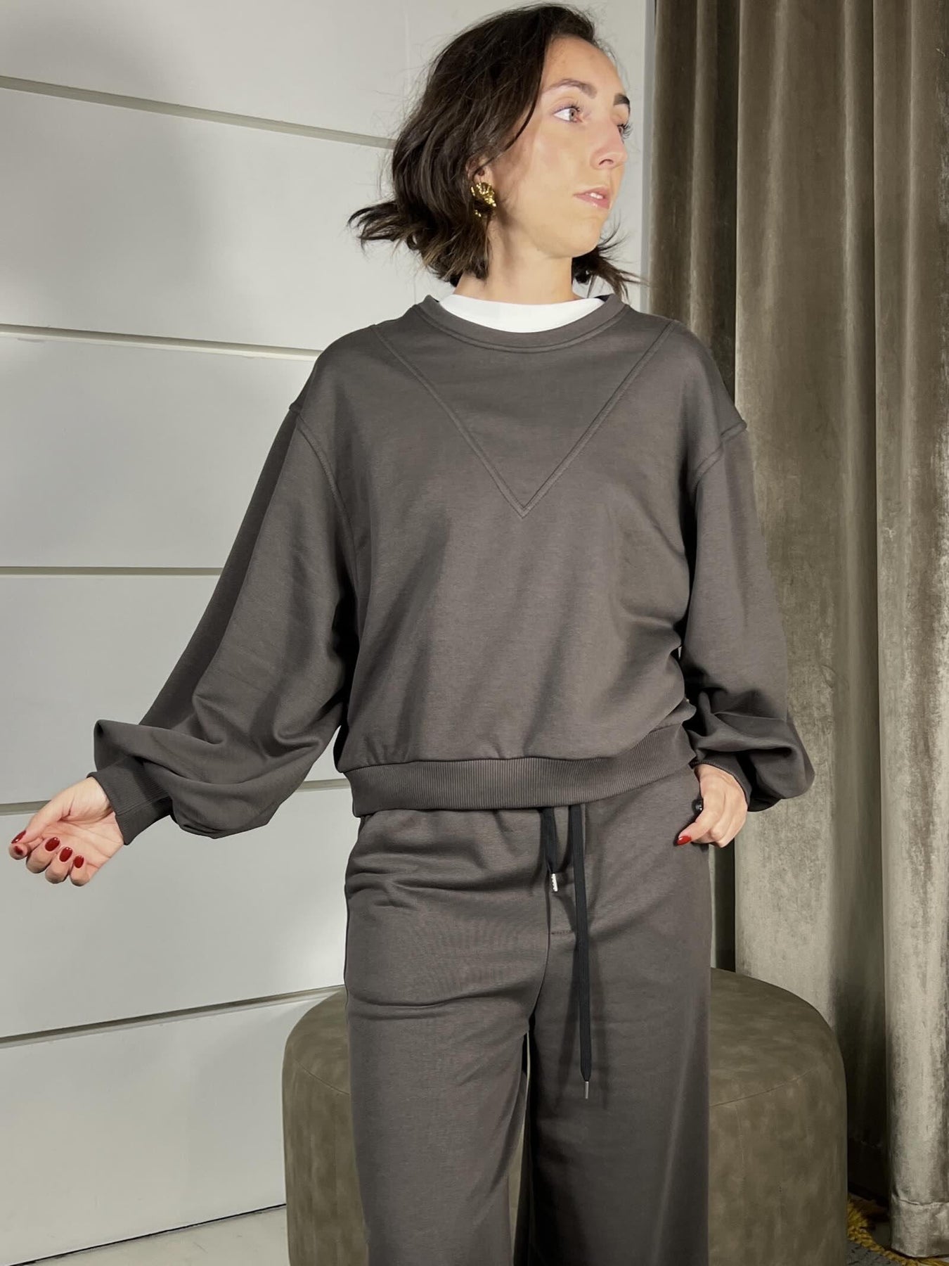 Felpa Vicolo moro over garzata girocollo. La modella è una 40 ed è alta 172cm. Composizione 65%co 35%pl 95%co 5%ea