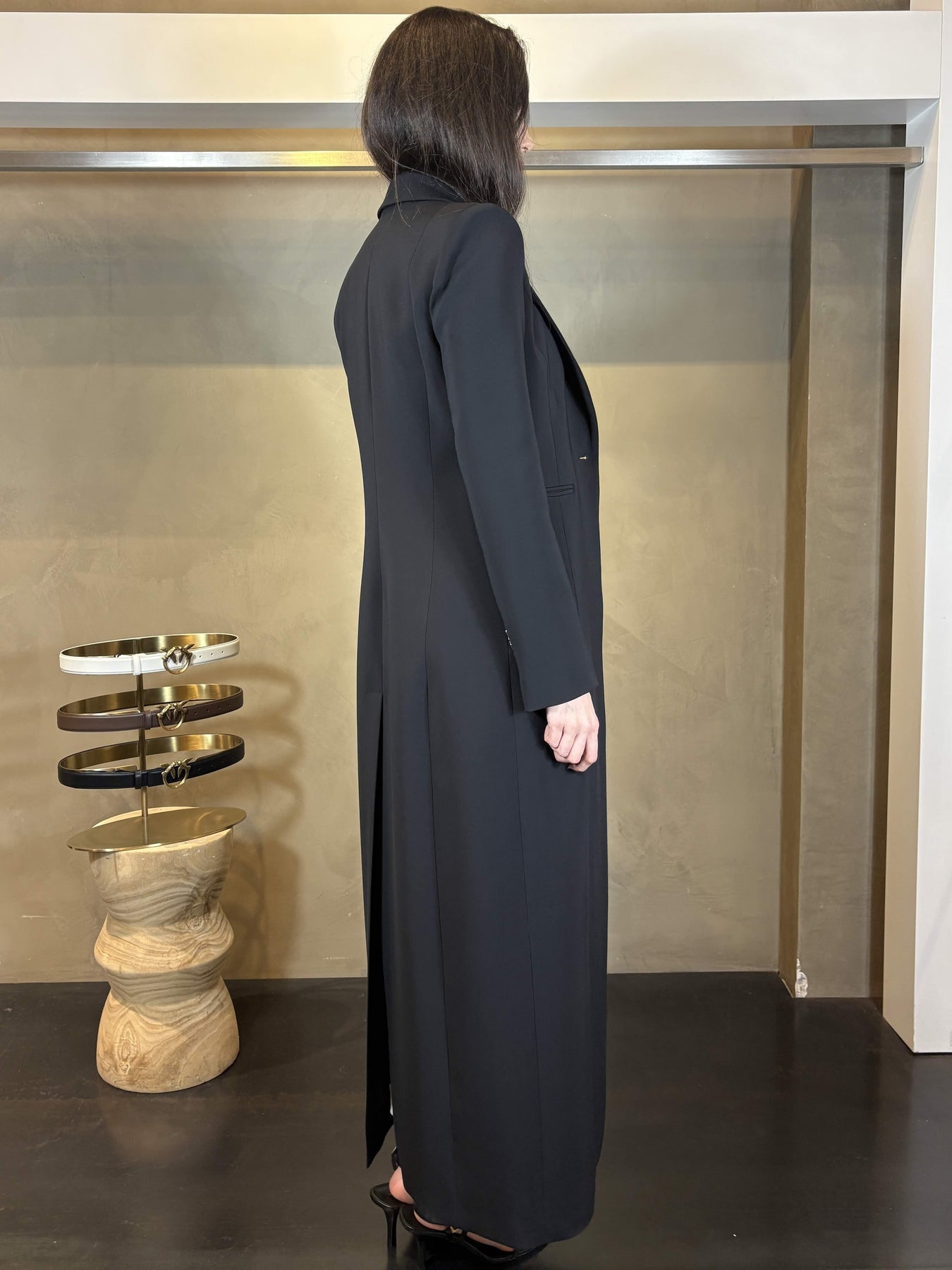 Giacca lunga Patrizia Pepe, nera, modello in crepe stretch foderato, dal taglio sartoriale sfiancato che scolpisce la silhouette. Maniche lunghe con spacchi e dettaglio Fly, rever a lancia e spacco importante sul retro. Il capo si può portare sia come giacca lunga, sia come cappotto o come abito. Capo super versatile. Vestibilità regolare, la modella è alta 175 cm e indossa la taglia 40. Composizione: Tessuto principale: 97%PL 3%EA Fodera: 100%PL.