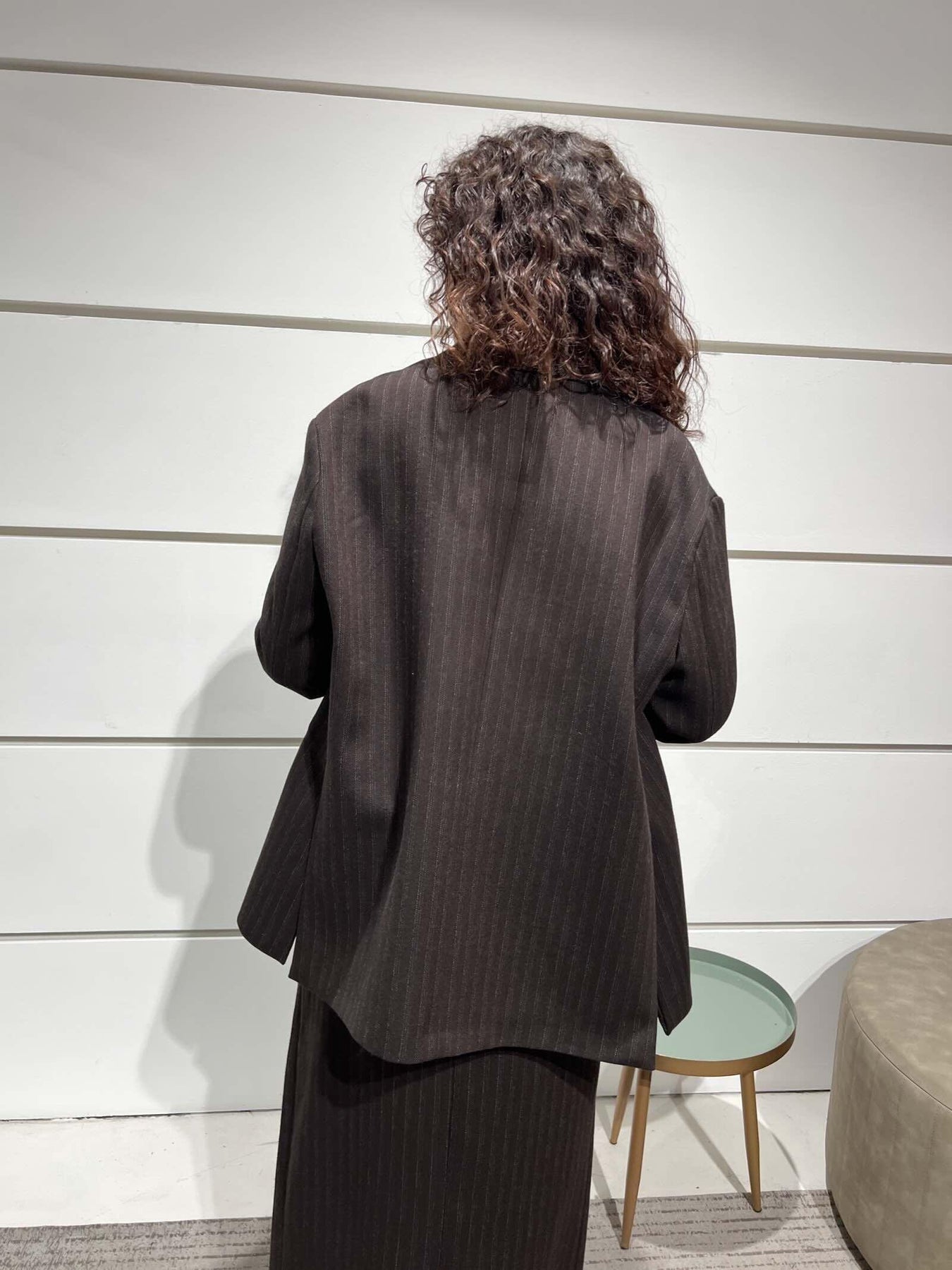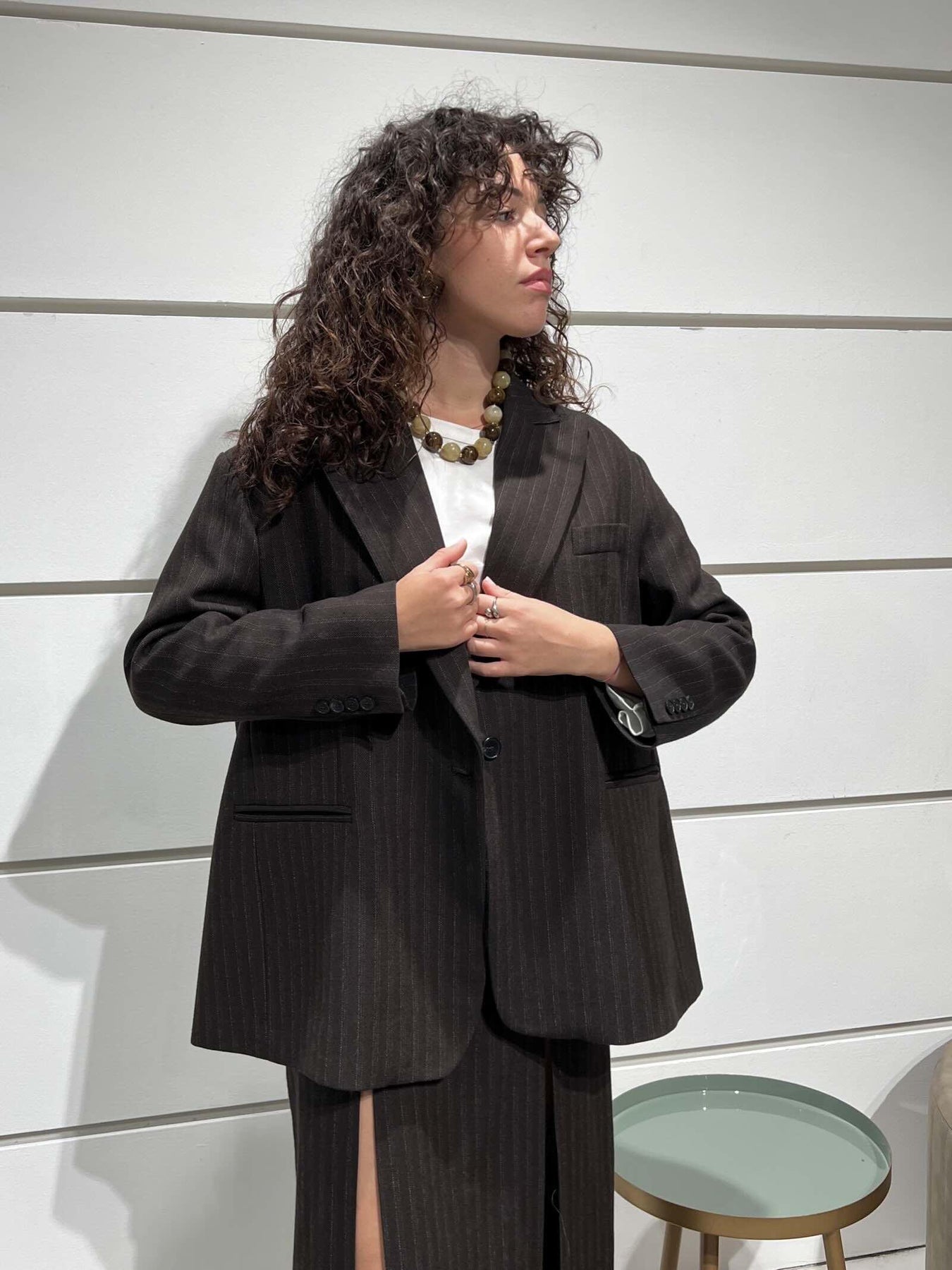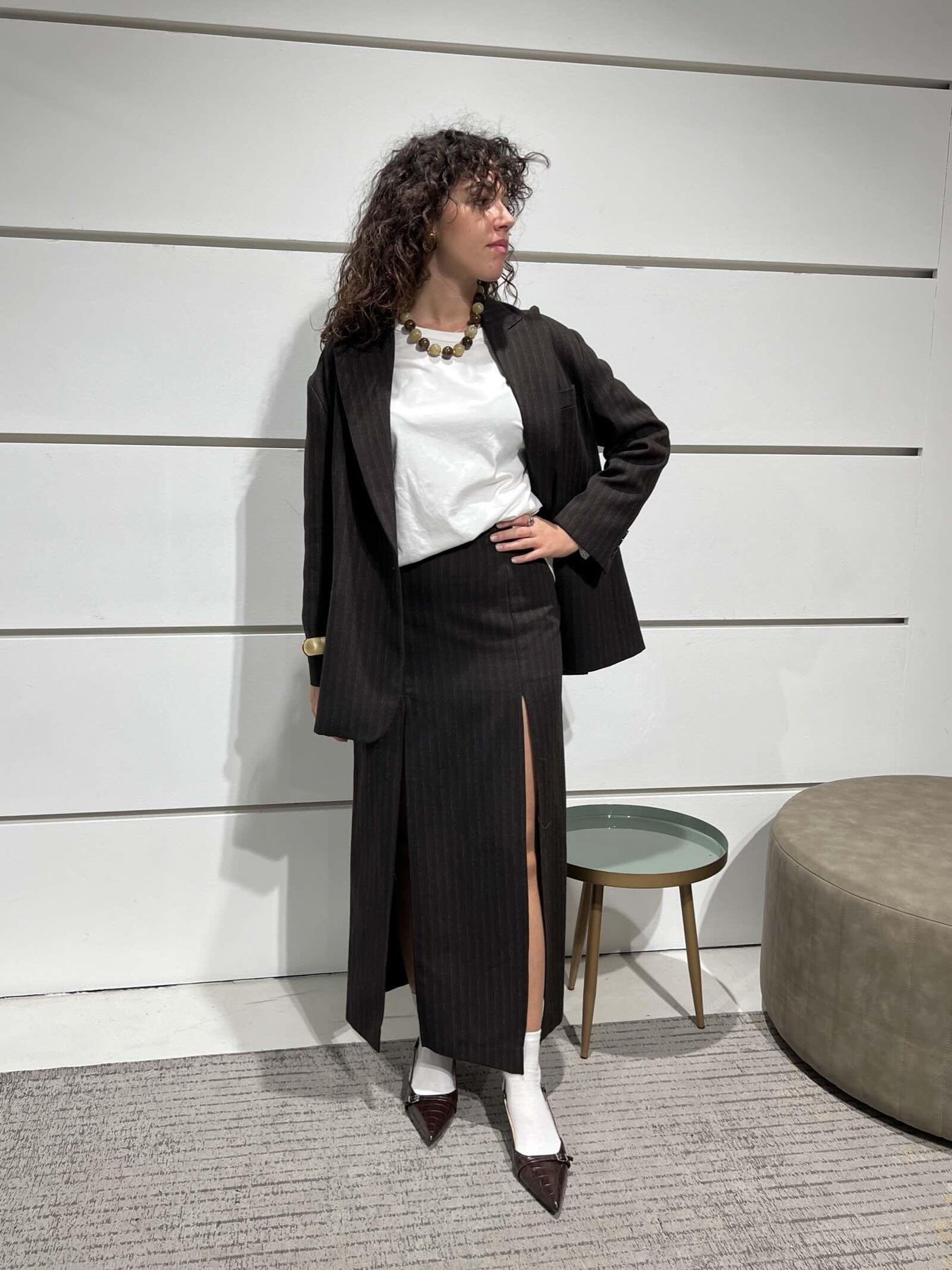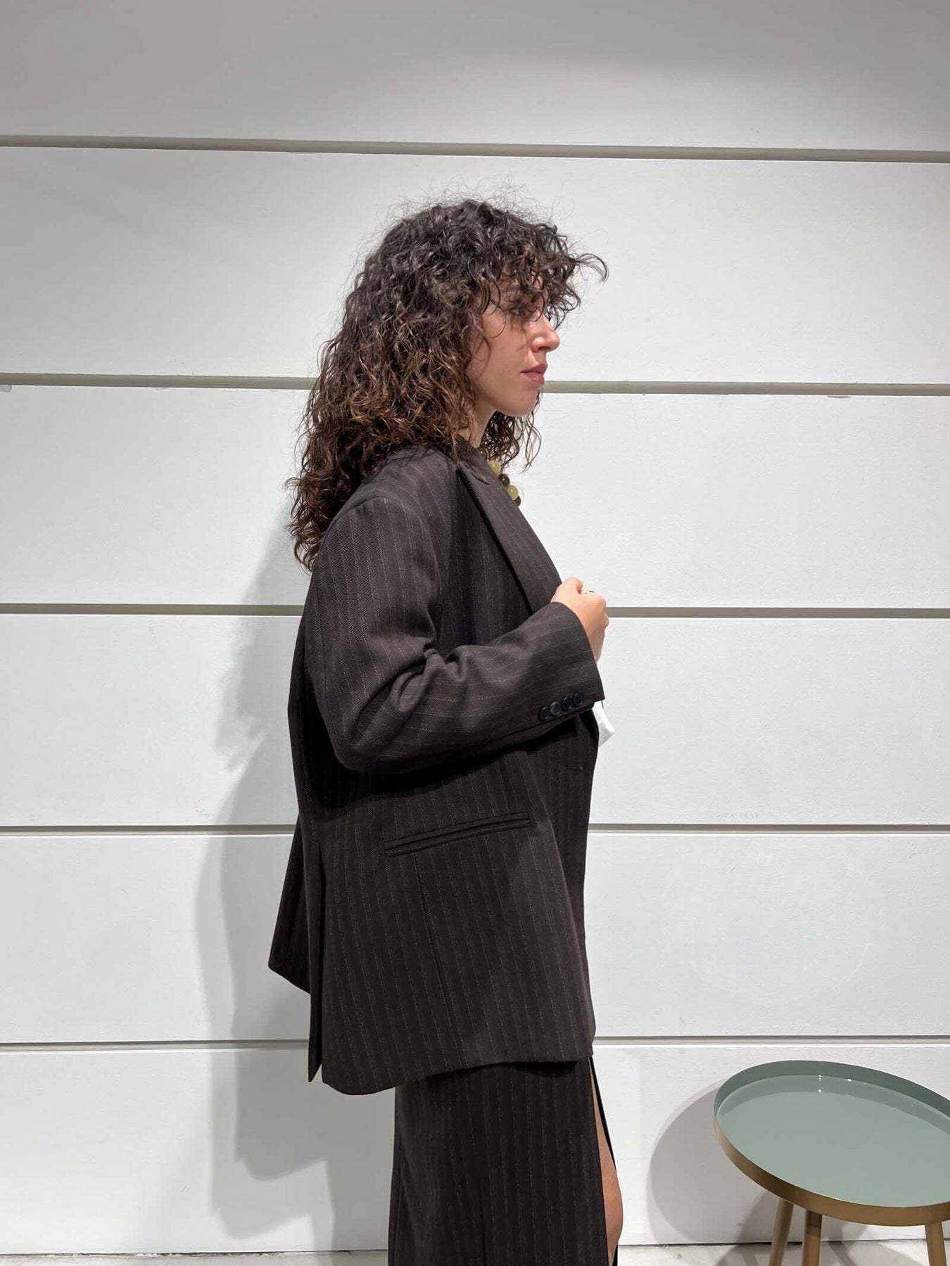 giacca Vicolo moro over gessata, con spacchi nel retro, volendo si abbina alla gonna. La modella è una 42 ed è alta 172cm. Composizione 36% vi 36%co 28%pl 62%ac 38%vi