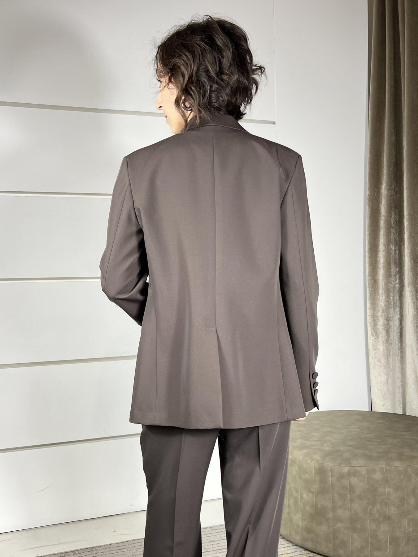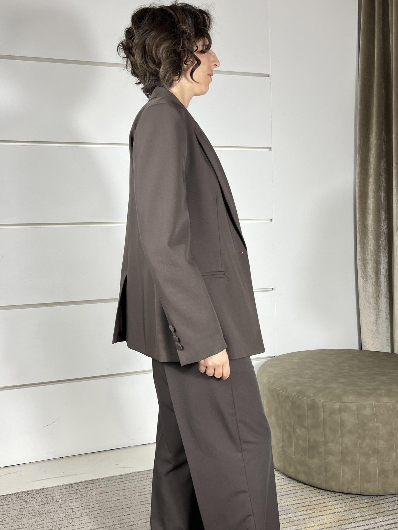 giacca Vicolo moro regolare un bottone bordeaux, volendo si abbina al pantalone e al gilet. La modella indossa la s e dè alta 172cm. Composizione 70%pl 23%vi 7%ea 62%ac 38%vi