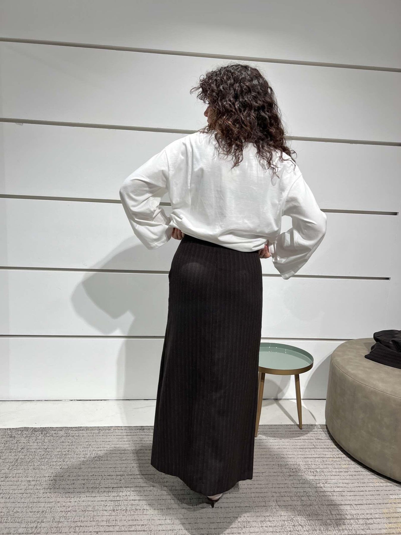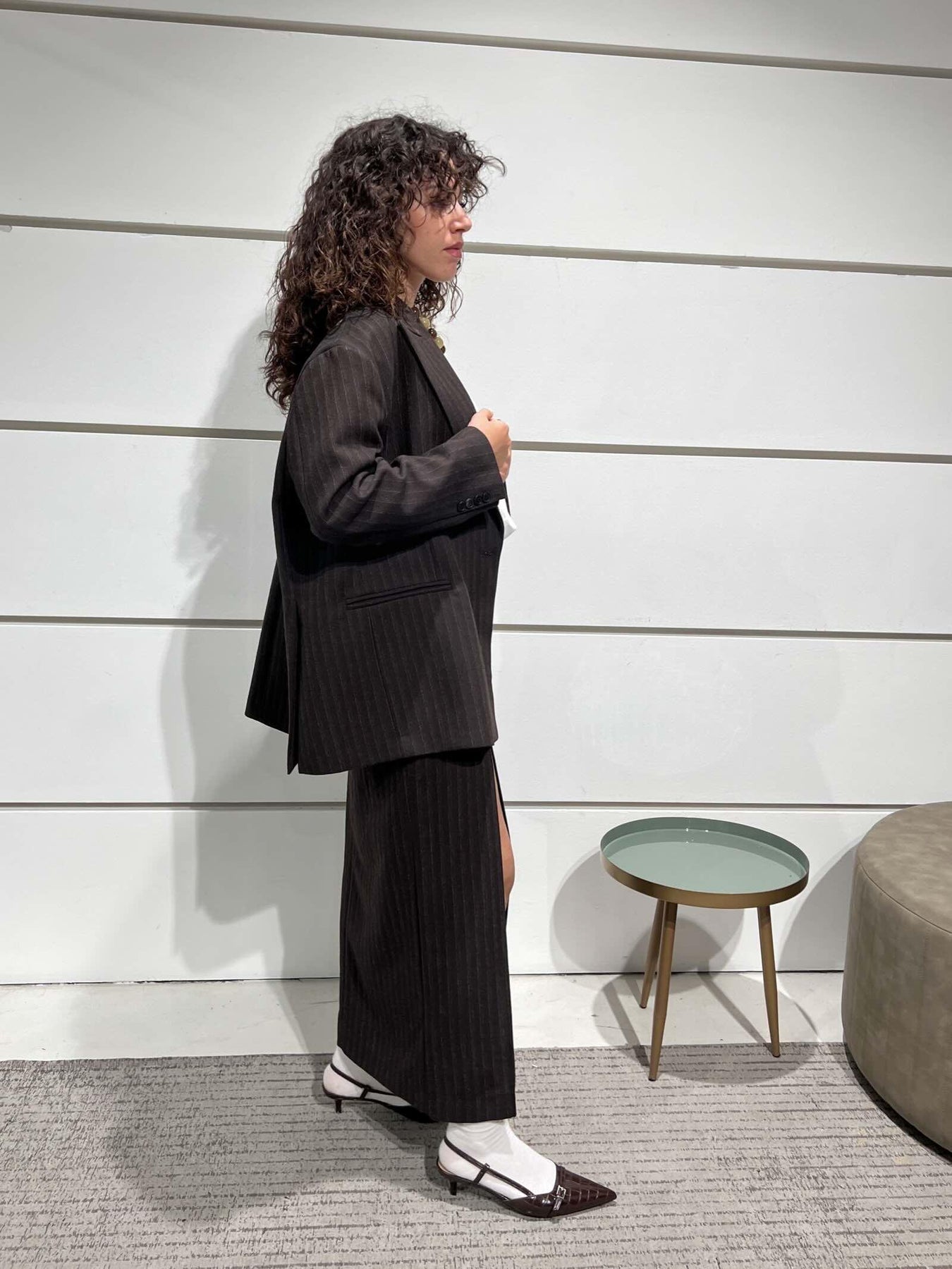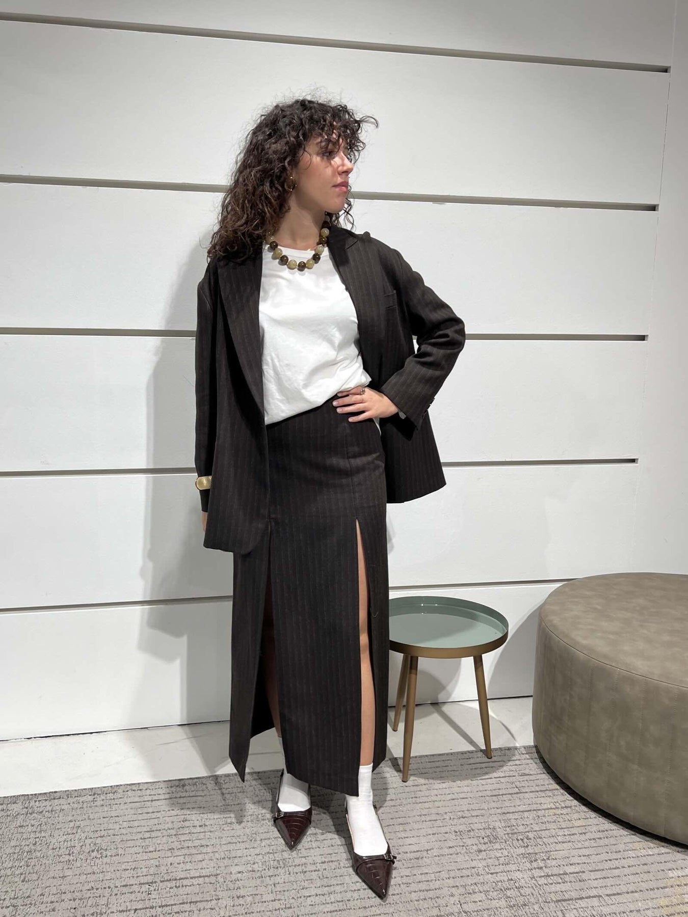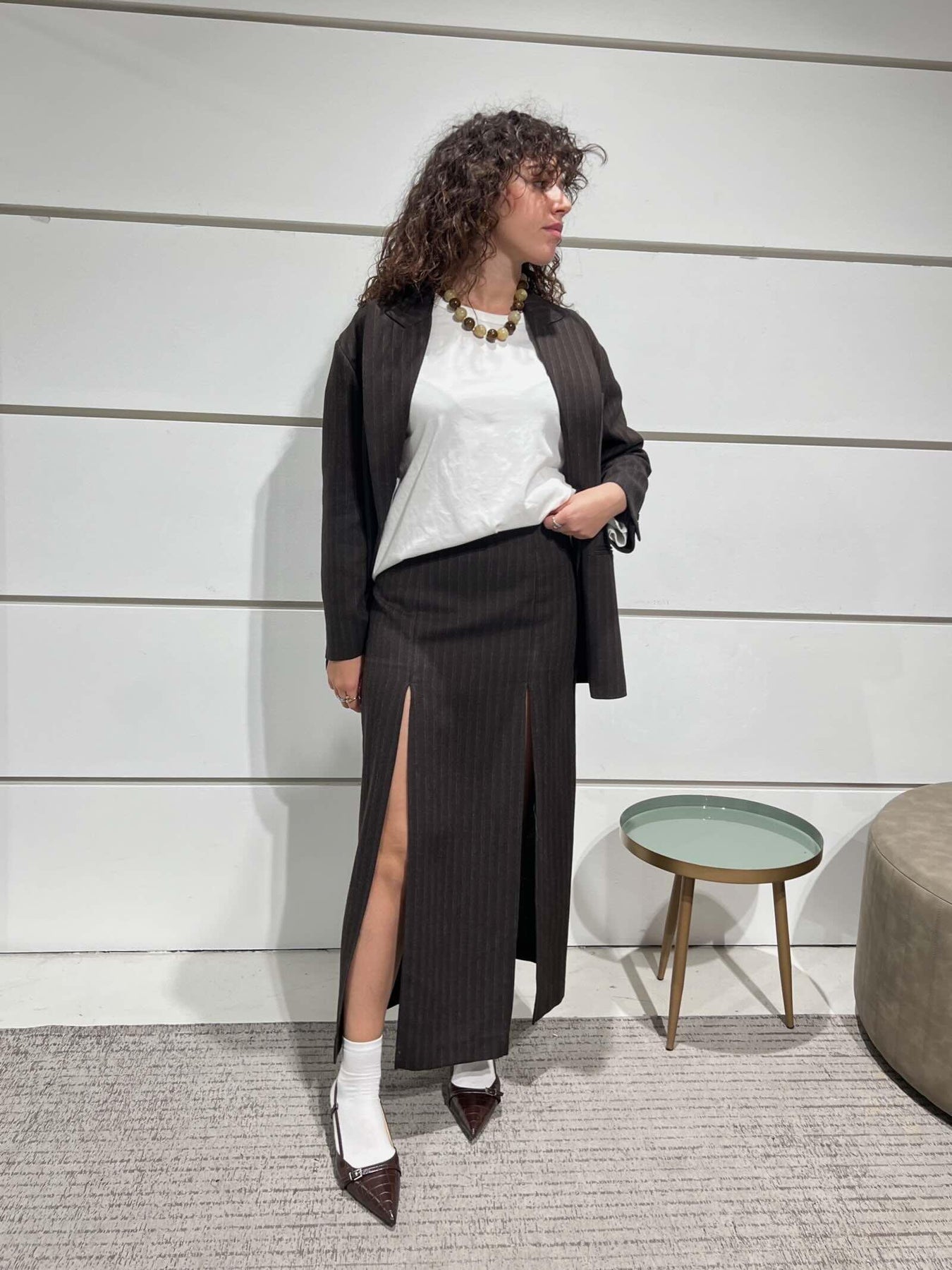 gonna Vicolomoro gessata lunga a matita con spacchi, voledno si abbina alla giacca. La modella indossa la m ed è una 42 ed è alta 172cm. Composizione 36%vi 36%co 28%pl 62%ac 38%vi