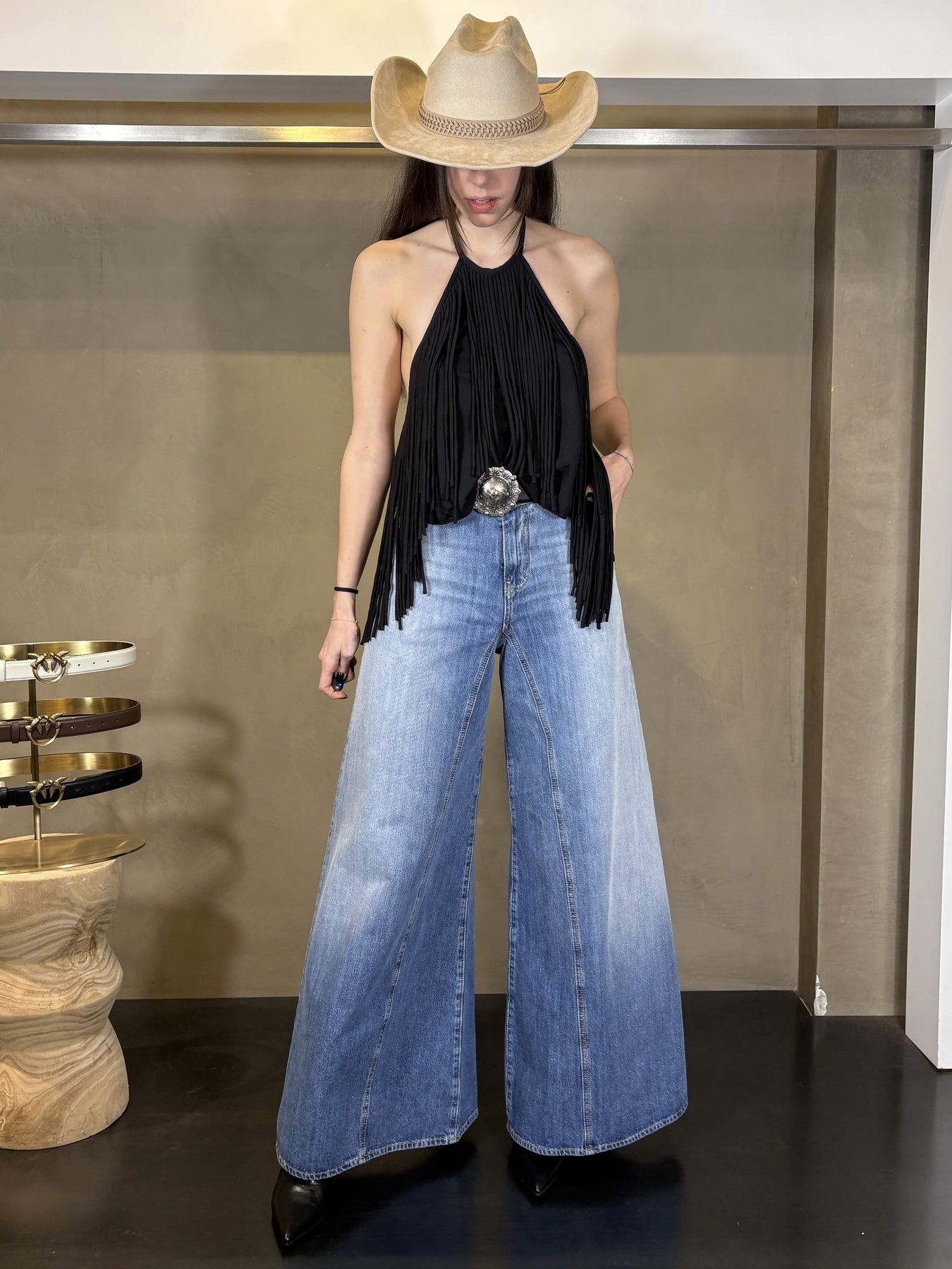 Jeans denim medio con schiariture bianche Pinko, modello wide leg, gamba extra ampia grazie a degli spicchi di tessuto nella parte inferiore della gamba. Realizzato in puro cotone, effetto vintage, tasca posteriore logo ricamato tono su tono. Chiusura zip e bottone. La modella è alta 175 cm e indossa la taglia 25. Composizione: Tessuto Esterno: 100%CO Fodera: 65%PL 35%CO.