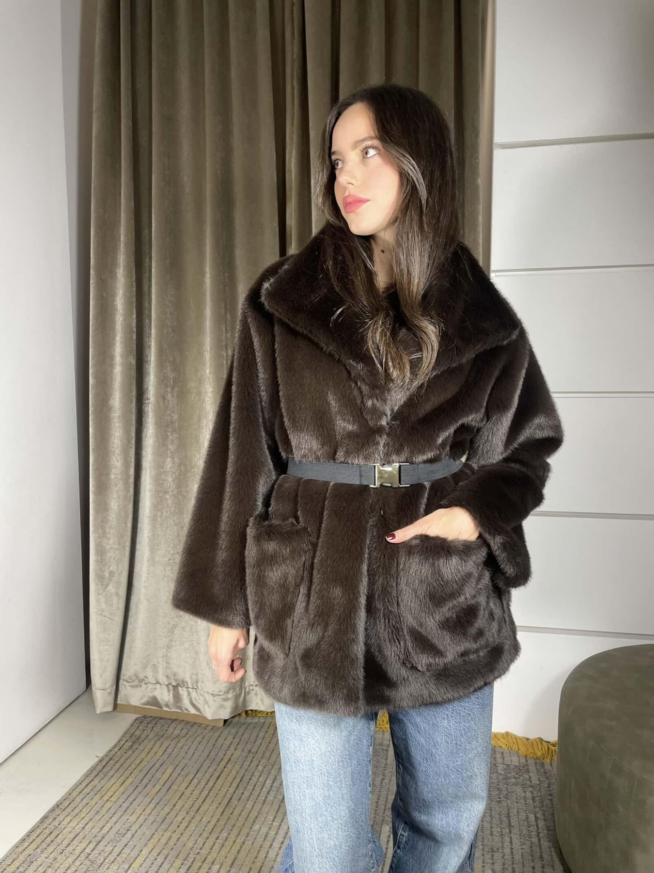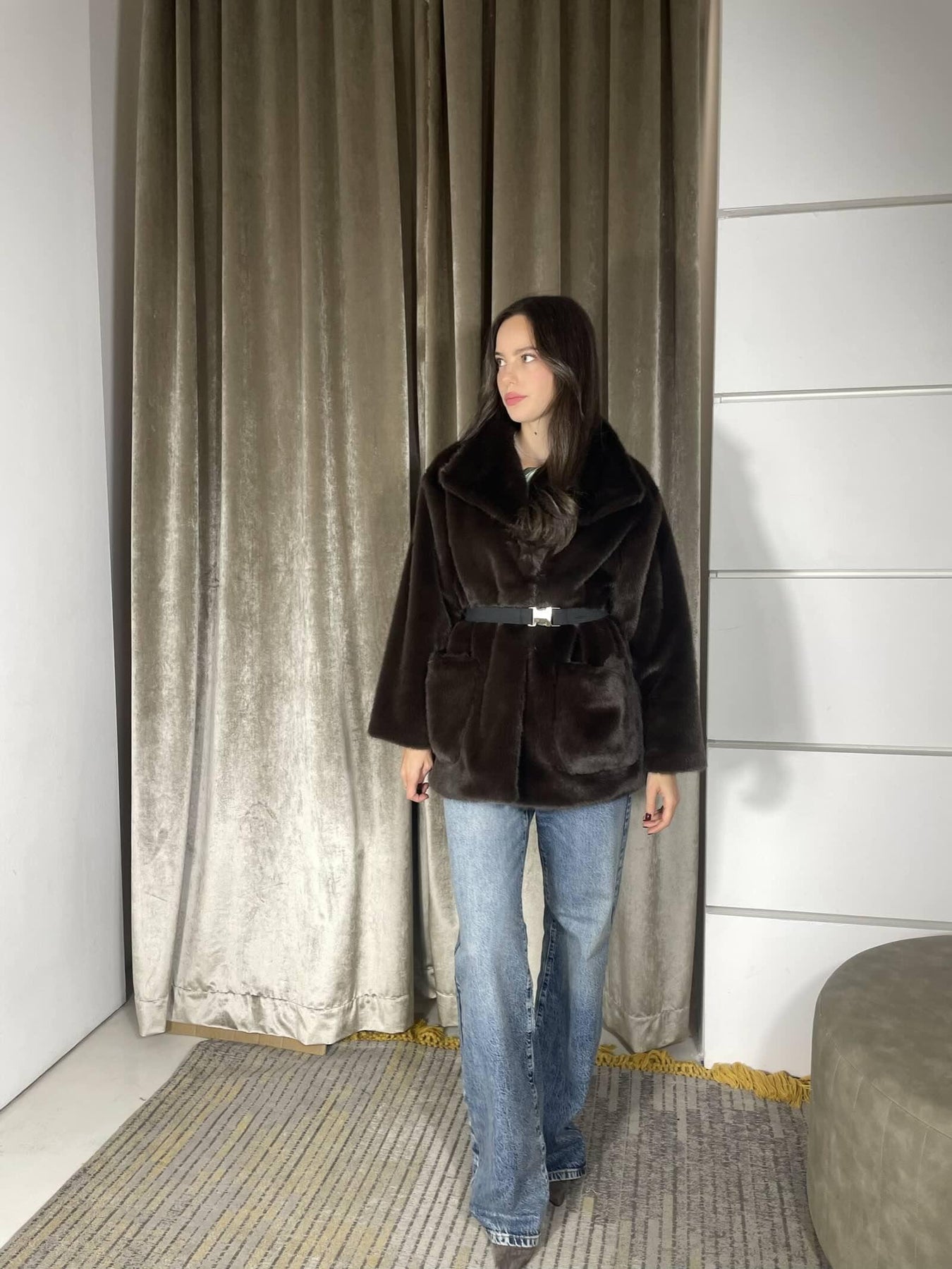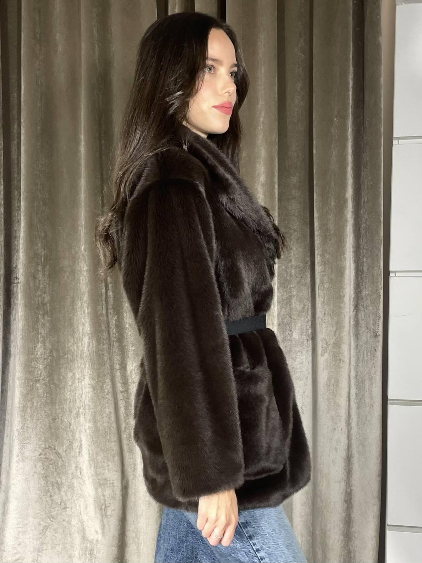 Pelliccia in ecovisone di Carla G. marrone, medio lunga con ganci ricoperti e cintura nera elastica, con fibbia color oro, in vita. Tasche a toppa e collo a vela. La modella indossa la tg.40 ed è alta 1,72m. Composizione: 100% pl