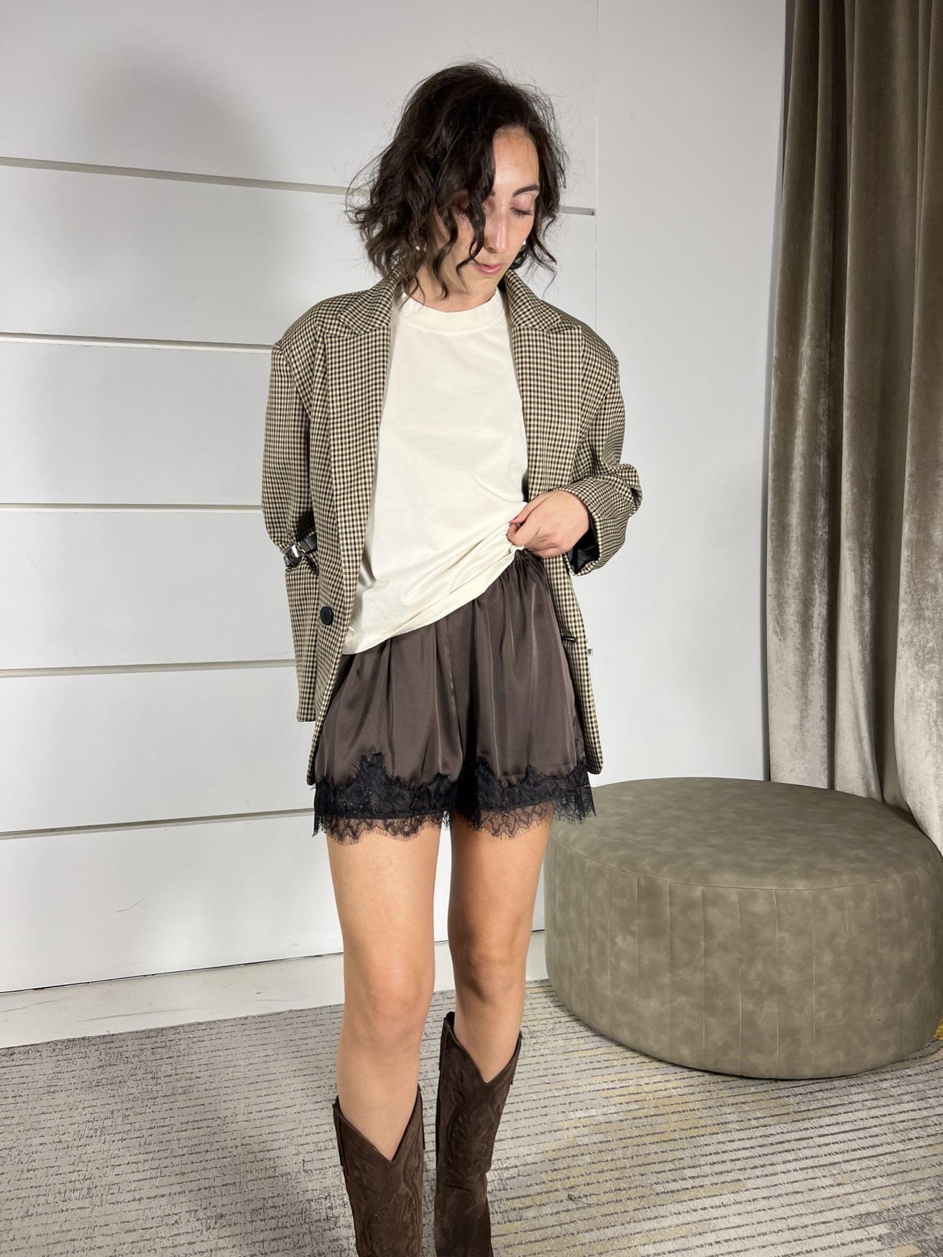 Short Vicolo moro satin con pizzo nero, con elastico in vita. LA MODELLA è UNA 40 ED è ALTA 172CM, VESTE DA UNA 38 A UNA 44. cOMPOSIZIONE 97%pl 3%ea
