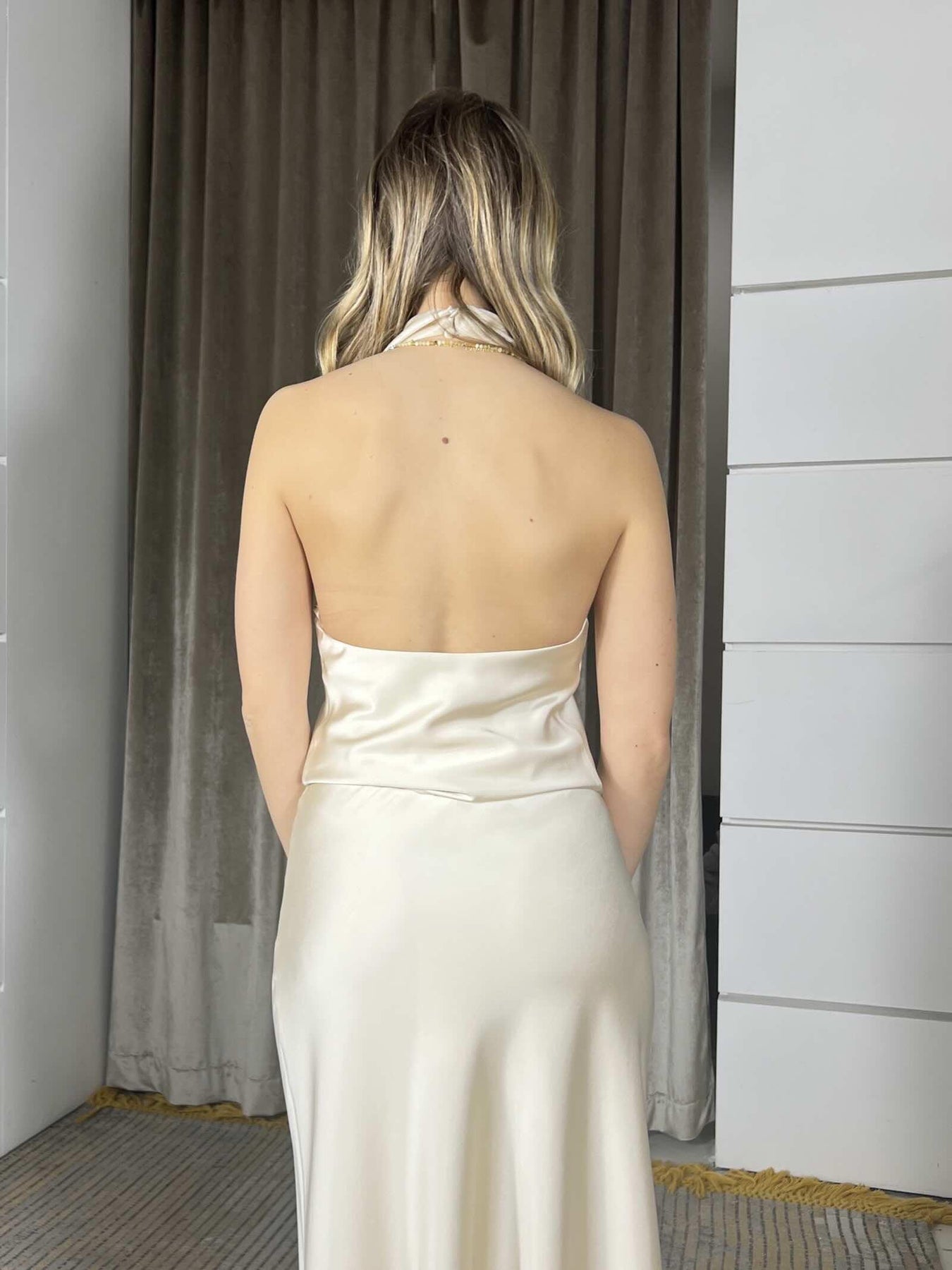 Top Imperial con scollo morbido e spalline sottili regolabili zinco, la modella indossa la s ed è alta 170cm. Composizione 100%PL
