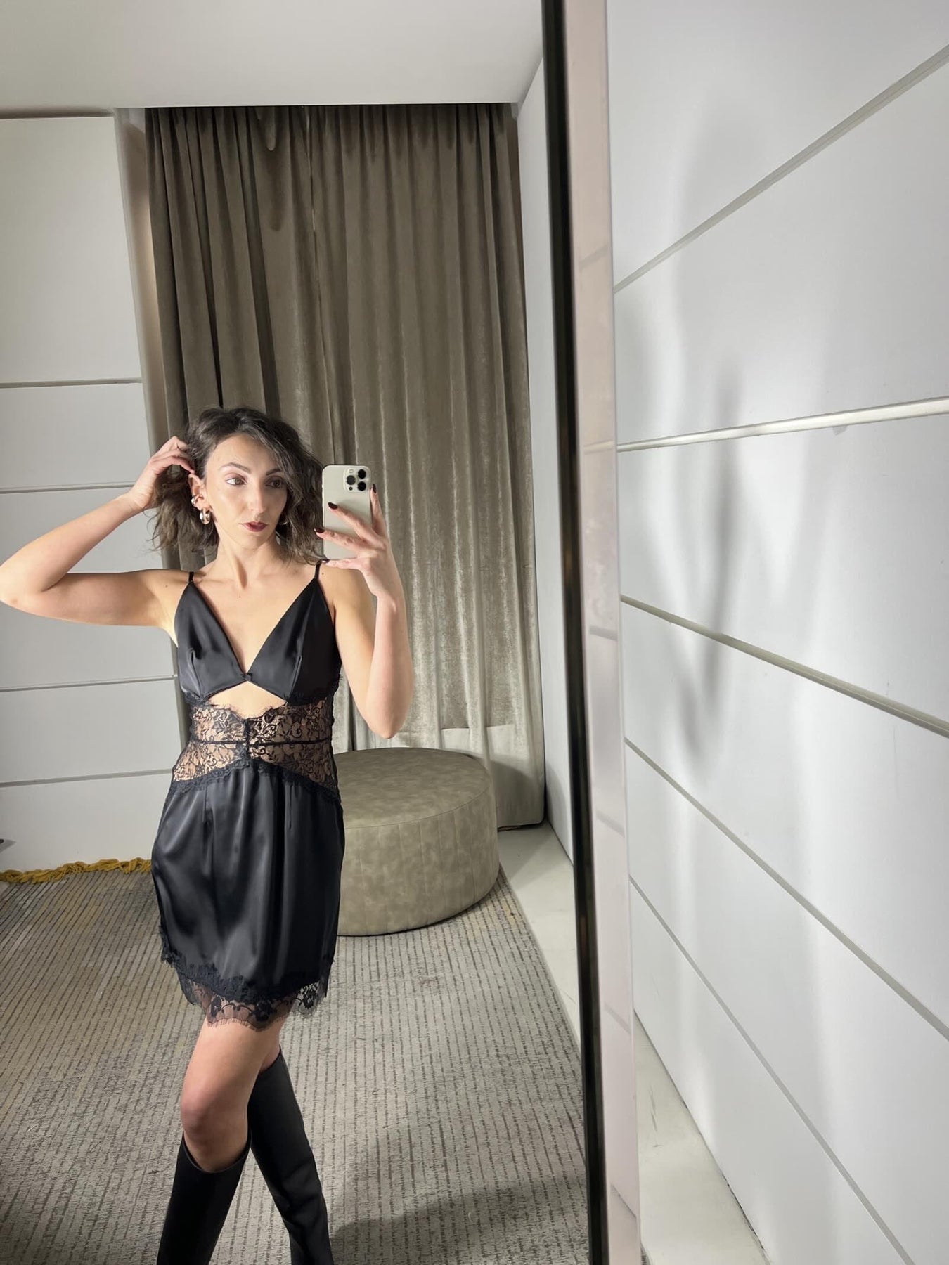 abito HaveOne nero lingerie corto con scollo a v e spalline sottili, inserto in pizzo sotto il seno, la modella indossa la s ed è alta 172cm. Composizione 100%pl