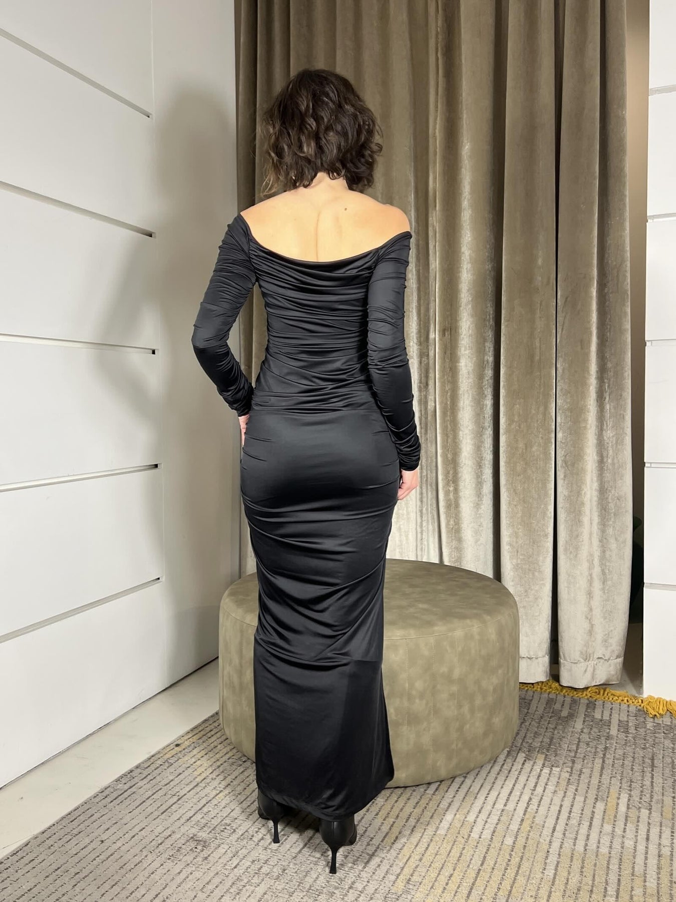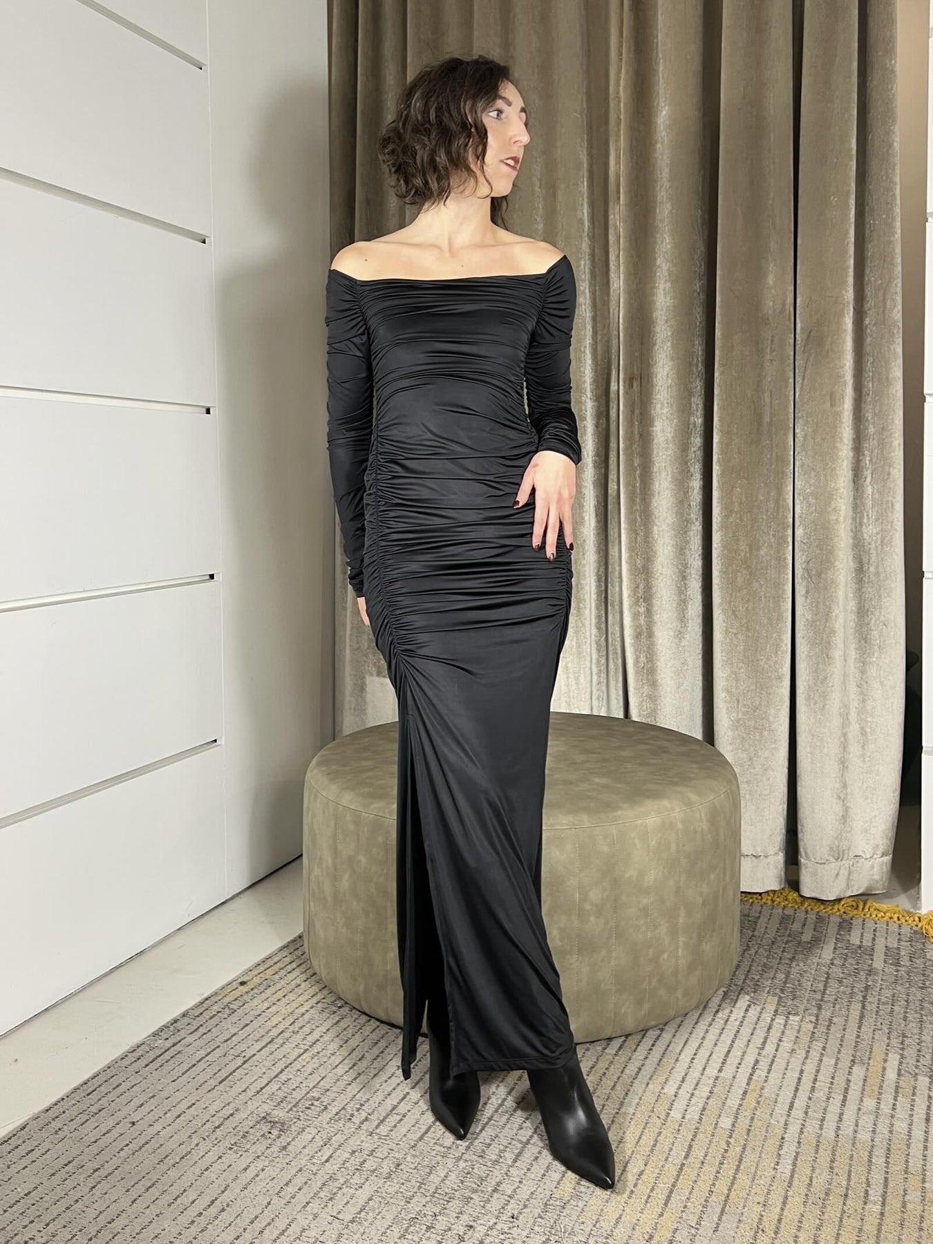 abito Susy Mix nero con arricciature lungo, la modella indossa la s ed è alta 172cm. Composizione 88%pl 12%pa