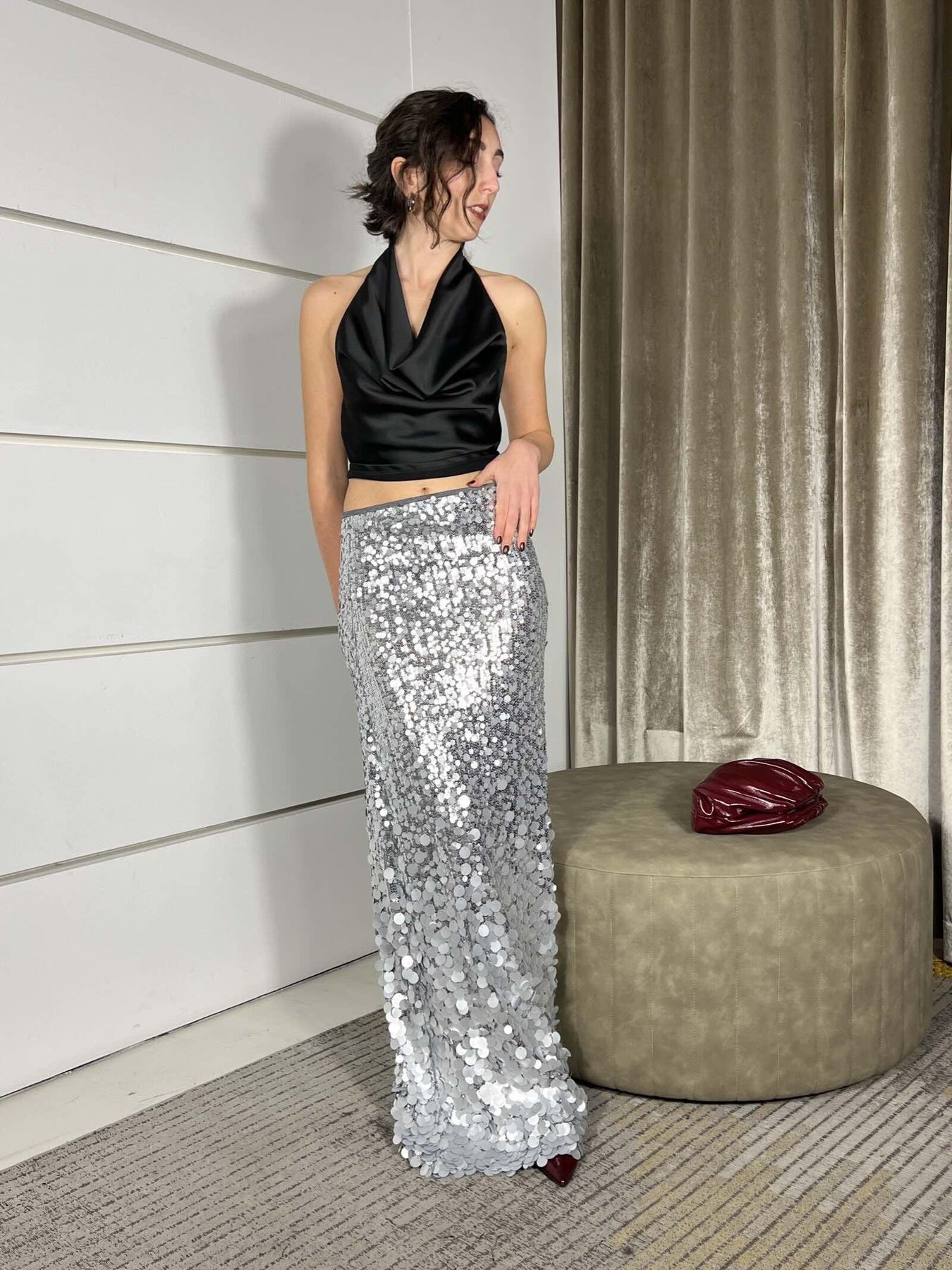 abito gonna midi svasato Carla G in paillettes degrade'.la modella indossa la 42 ed è alta 172cm composizione 99%pl 1%ea