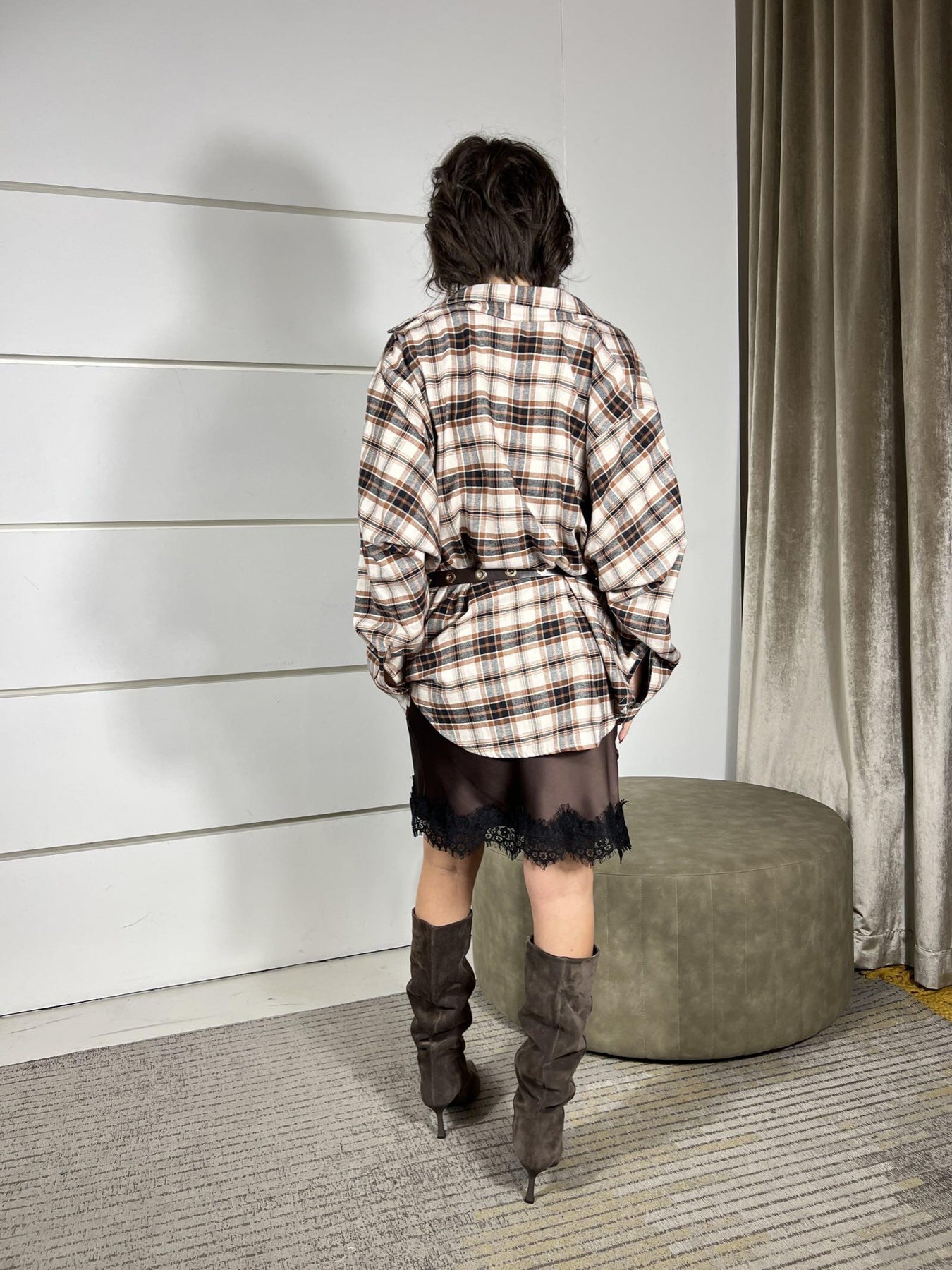 abito satin con pizzo e abito chemisier check con cinta Tensione In moro e burro, la modella è alta 172cm ed è una 40