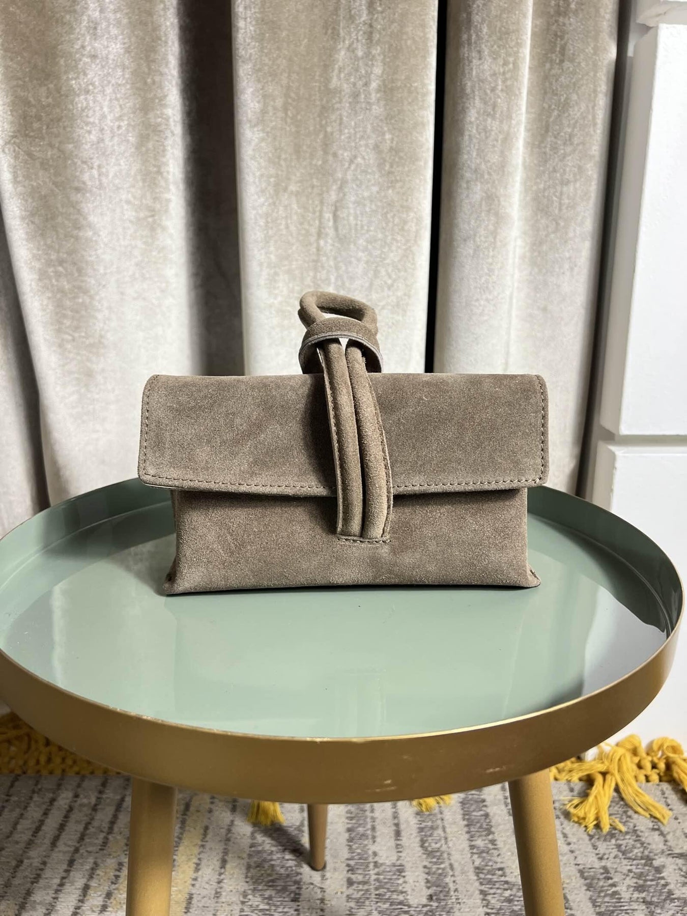 Borsa Femme Cafe selection tortora scuro in camoscio, modello a nodo, tracolla regolabile in camoscio.
