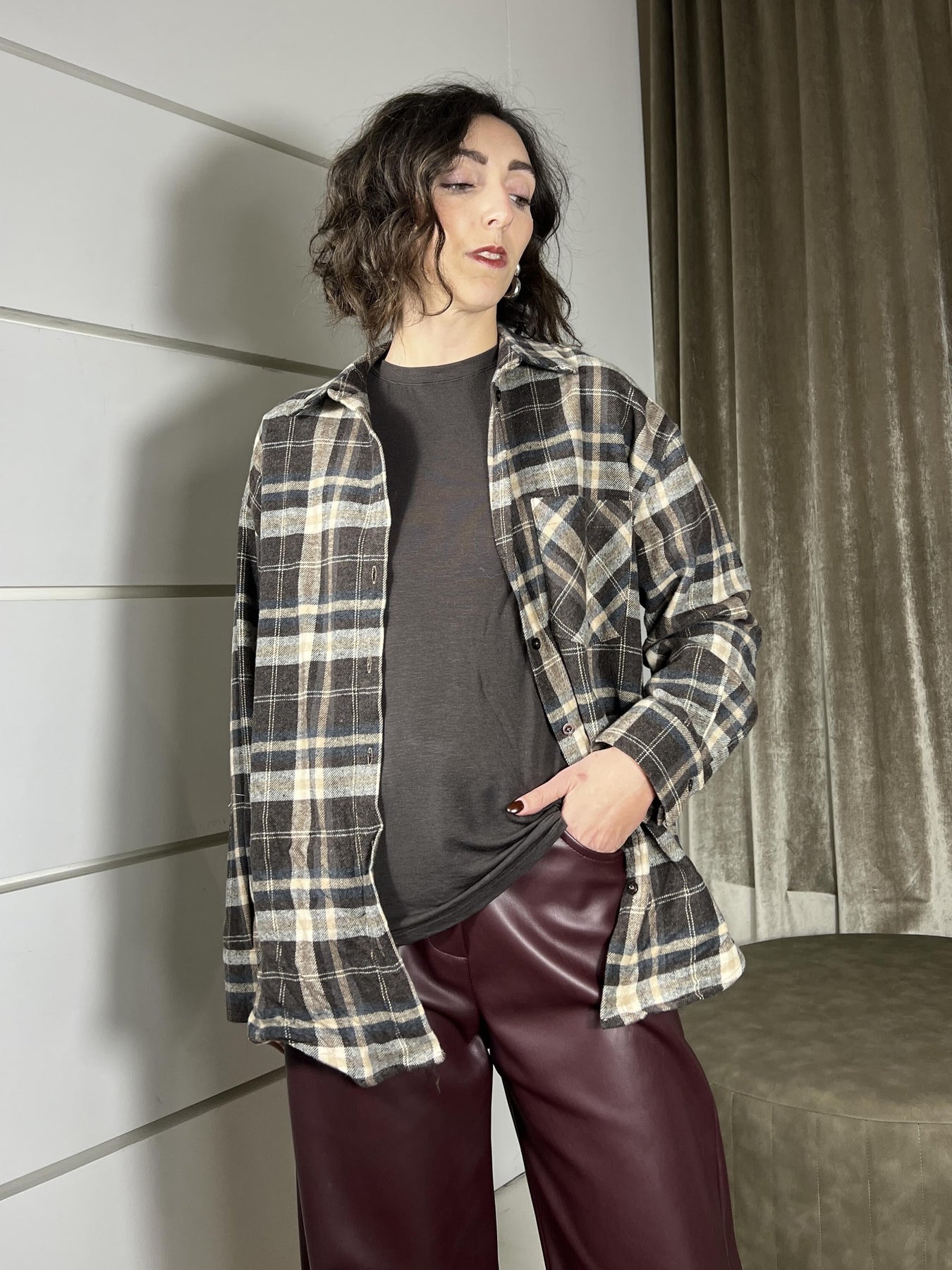 camicia Susy Mix a quadri over blu, la modella è una 40 ed è alta 172cm. Composizione 80%co 20%pl