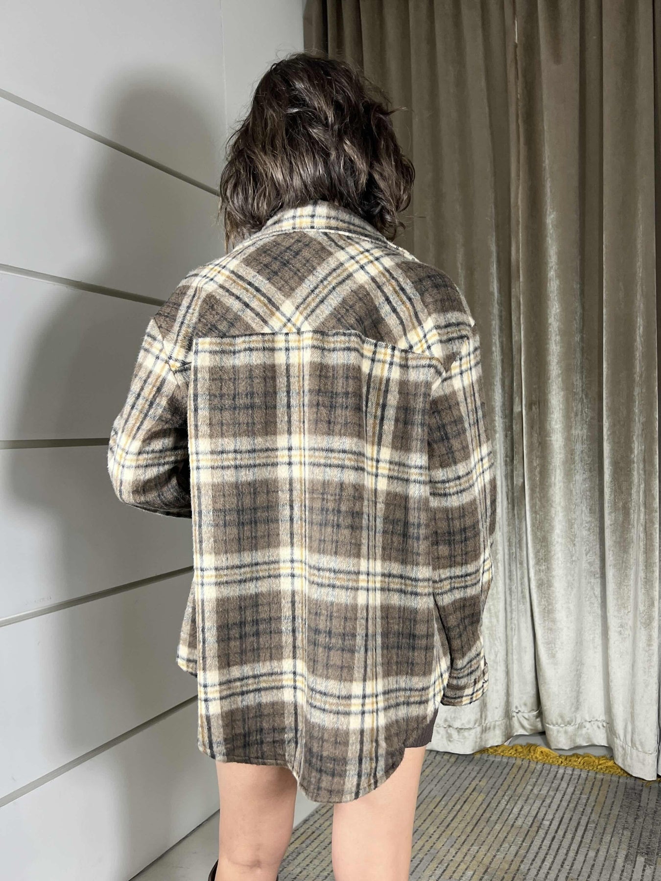 camicia Susy Mix check, tessuto pesante, moro, modello over, la modella è una 40 ed è alta 172cm, veste da una 38 a una 44. Composizione 95%co 5%pl