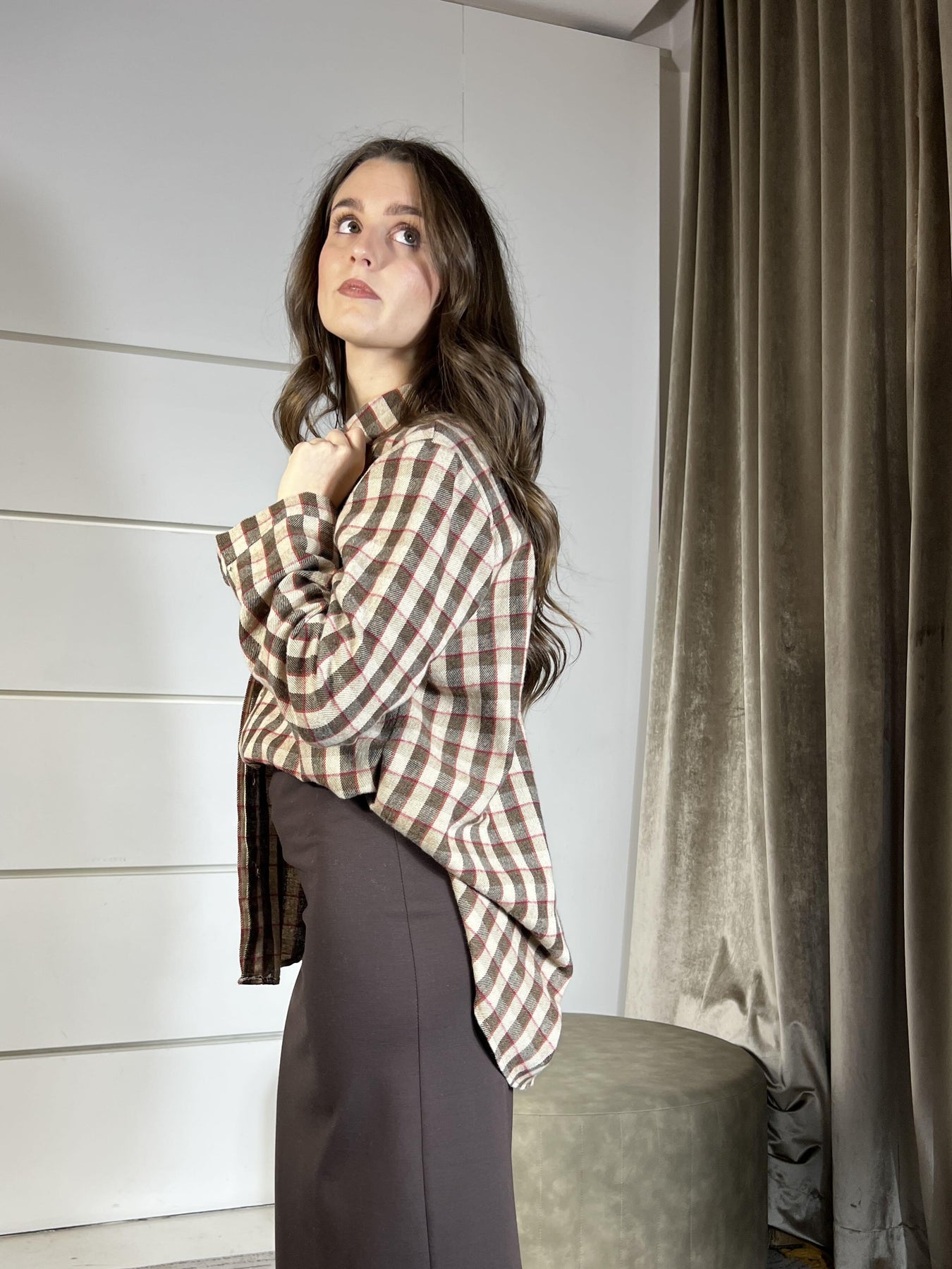camicia HaveOne check over con dettaglio bottoni a scomparsa, moro cammello e rossa, la modella è una 40 ed è alta 165cm, veste da una 38 a una 44. Composizione 80%pl 20%co