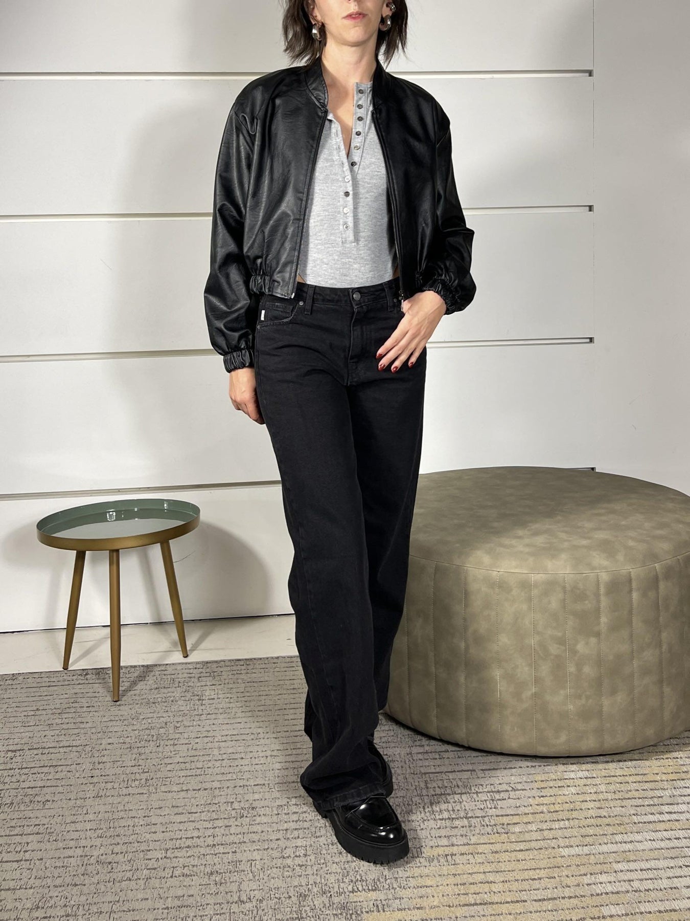 bomber Susy Mix in ecopelle, la modella indossa la s ed è alta 172cm. Composizione 100%pl+50%vi 50%pu