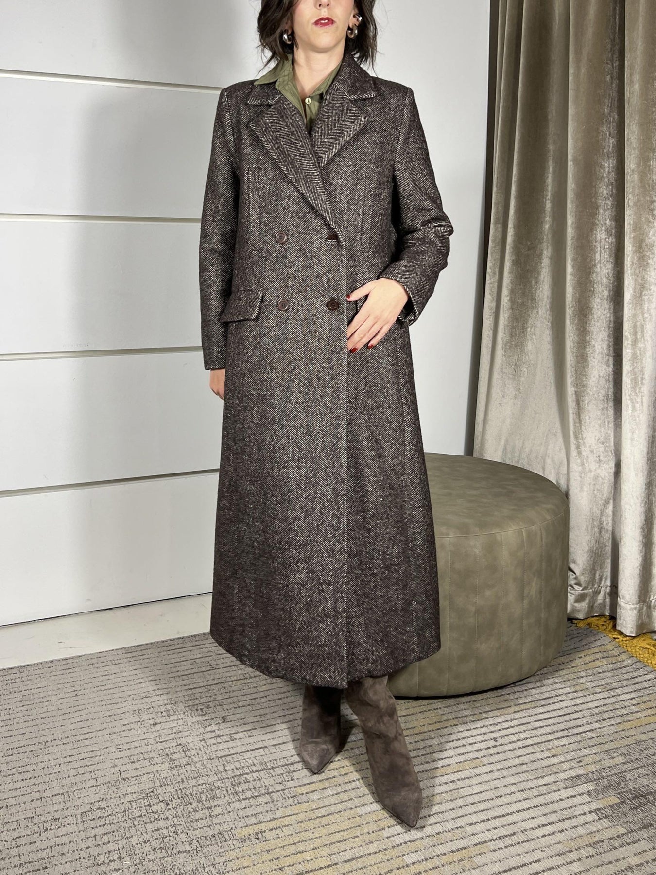 cappotto imperila moro, modello over ,lungo spinato , spacco posteriore, la modella indossa la s ed è alta 172cm. Composizione 70%pl n20%wo 4%vi 4%pa 2%af 55%pl 45%vi