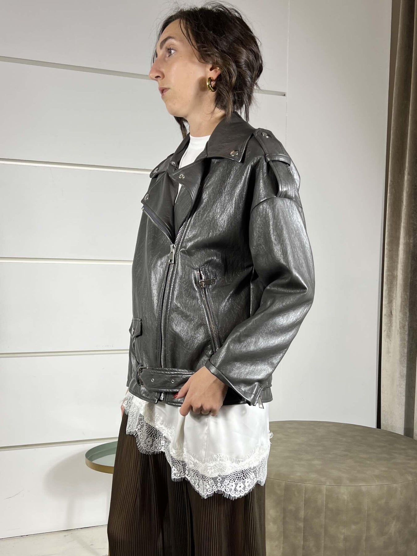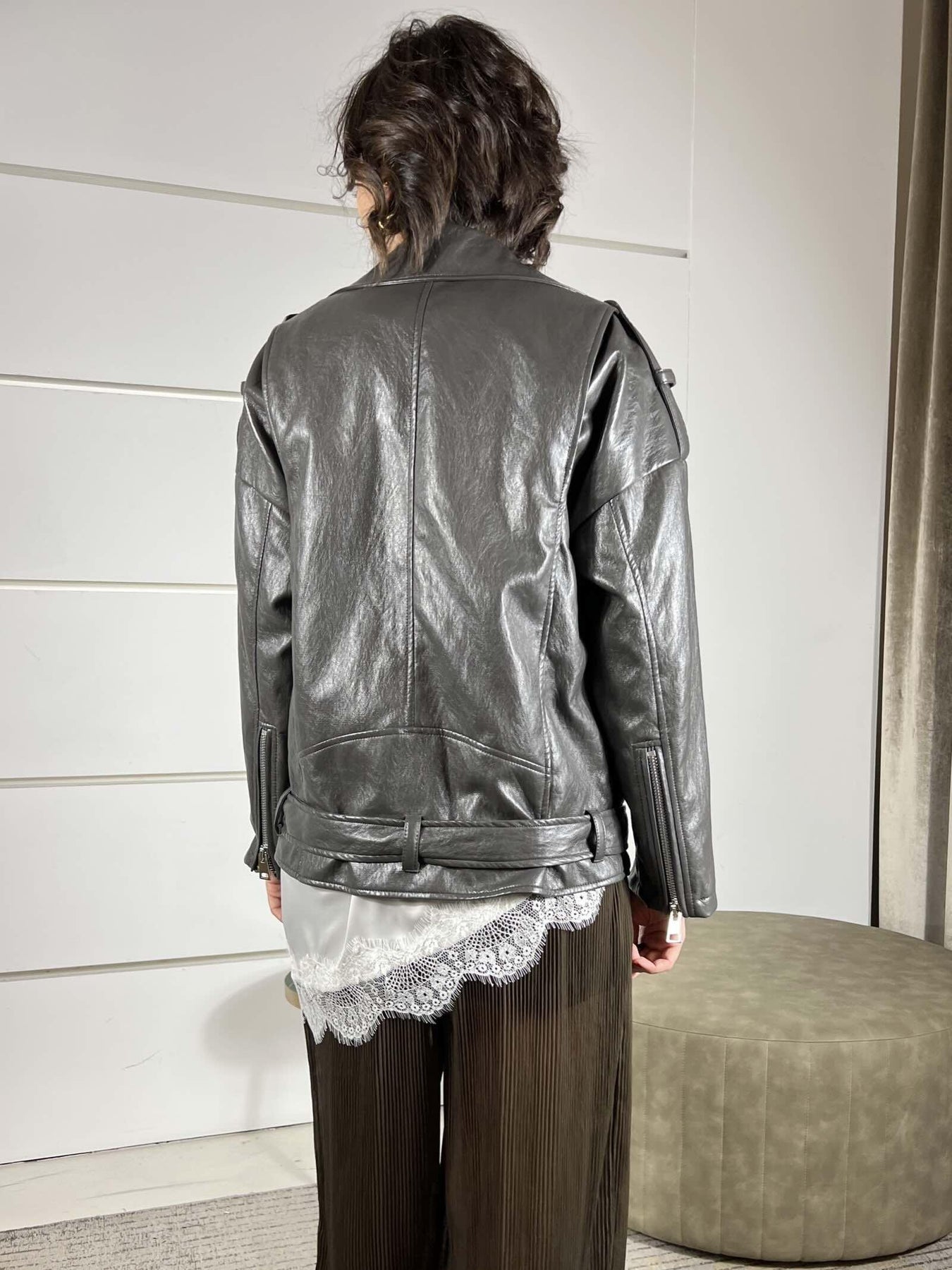 chiodo Vicolo grigio over in ecopelle effetto stropicciato, la modella indossa la s ed è alta 172cm. Composizione 50%pl 50%pu 62%ac 38% vi