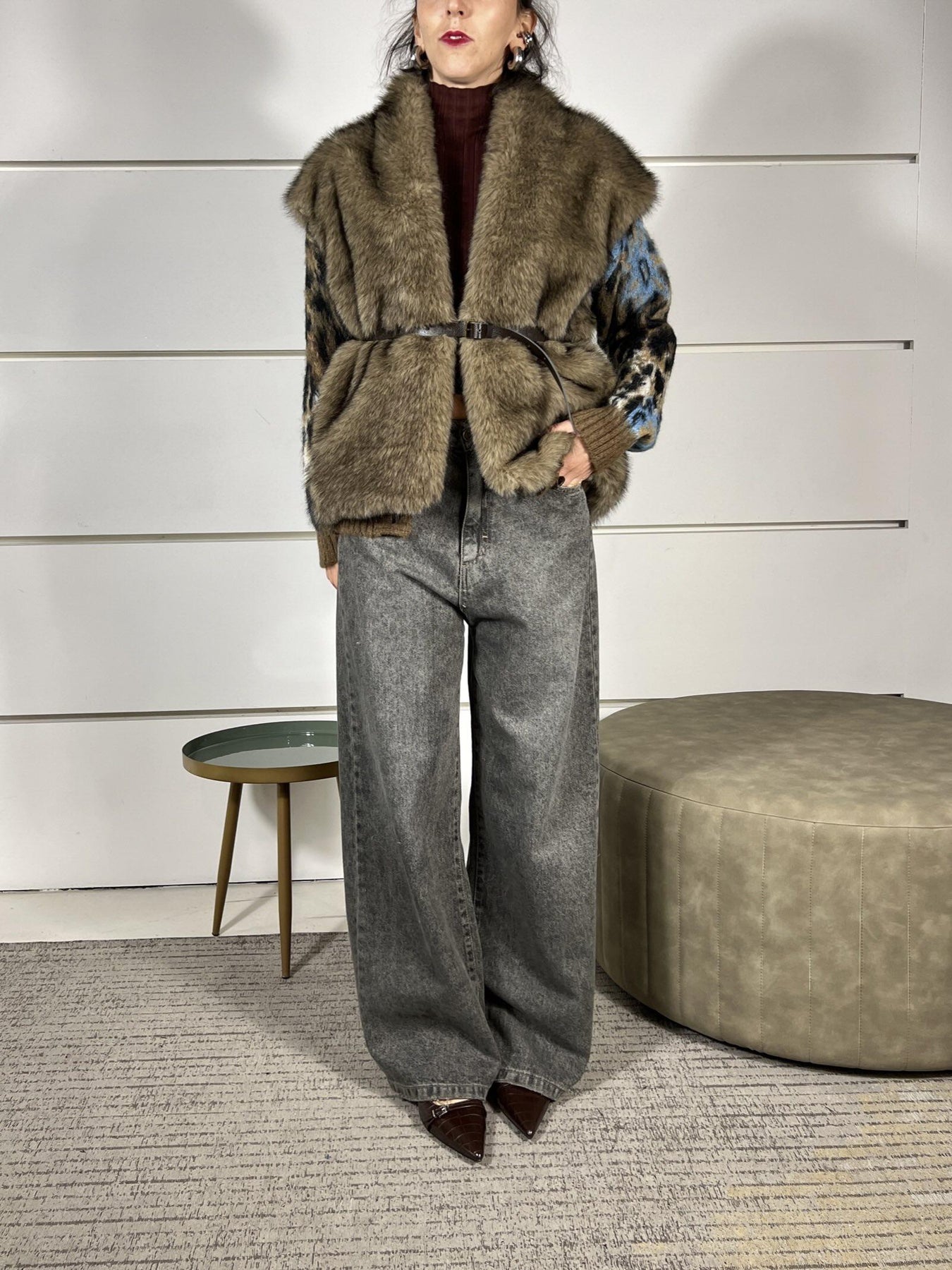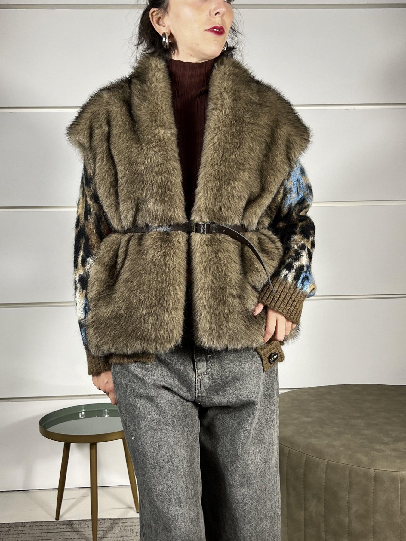 gilet Susy Mix cammello in ecopelliccia , con cinta, la modella indossa la s ed è alta 172cm. Composizione 100%pl+100%pl