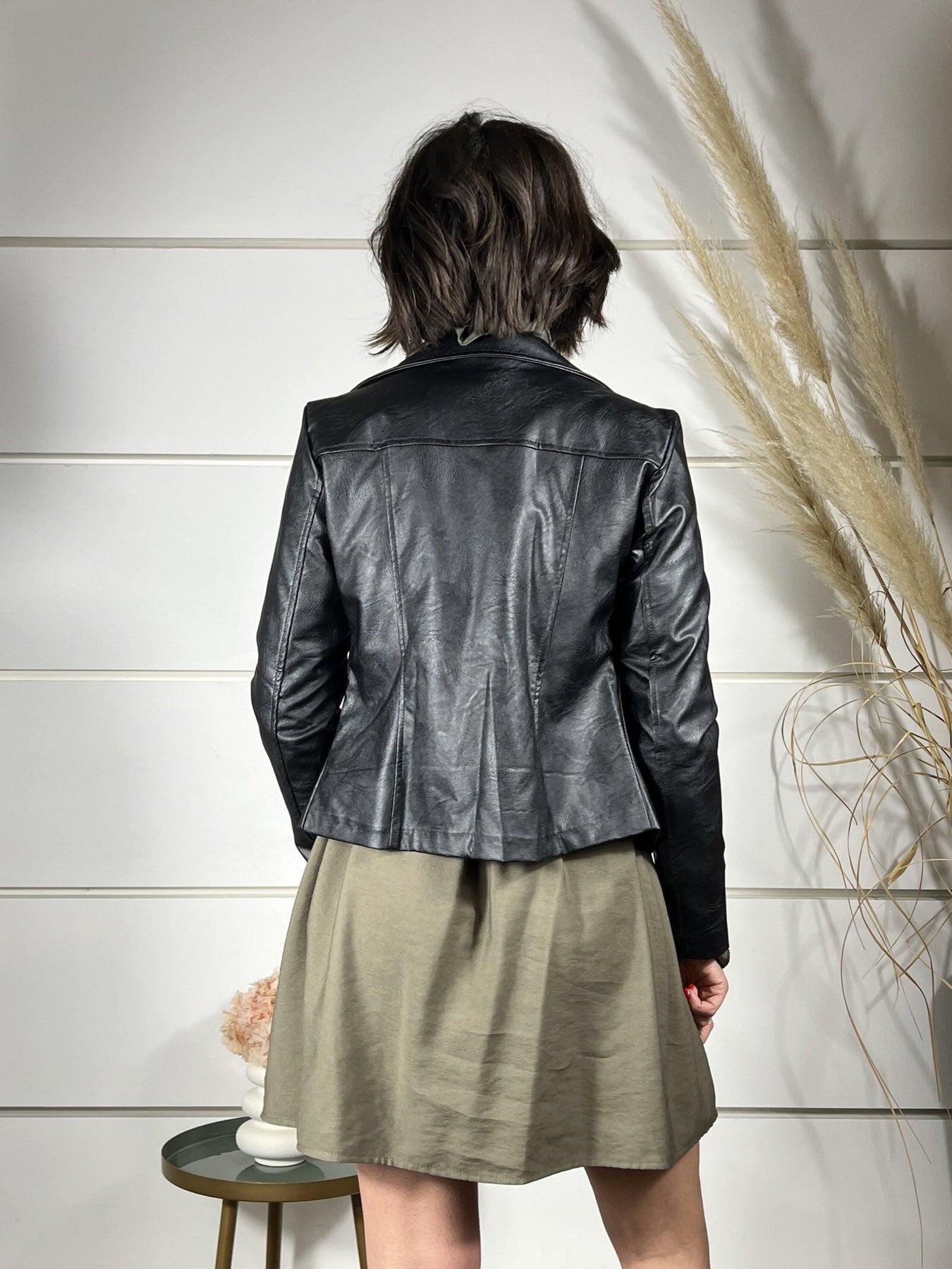Chiodo Susy Mix in ecopelle con zip nero. la modella indossa la s ed è alta 172cm. Composizione 55%pu 45%vi