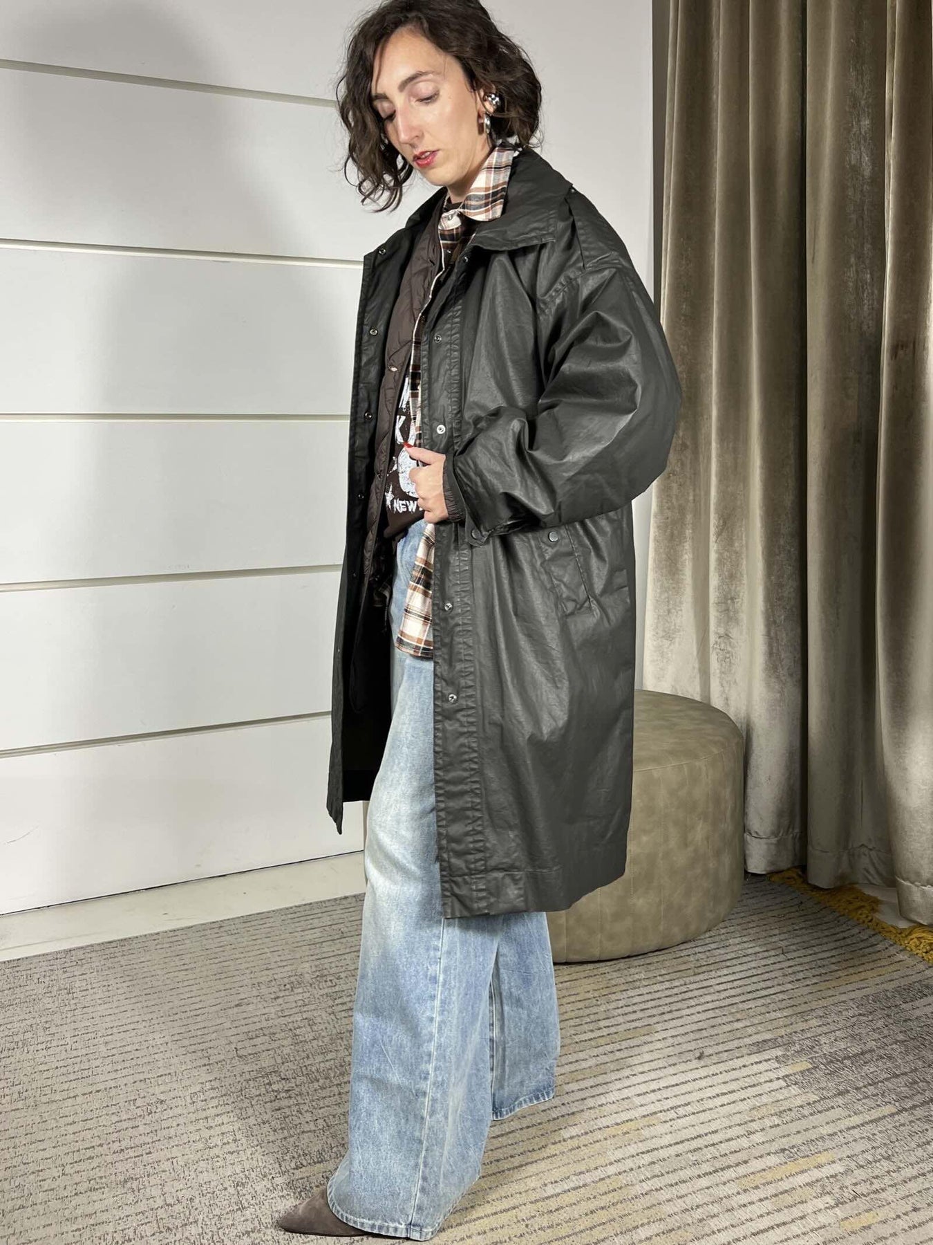 trench cerato Vicolo verde militare, con interno staccabile, 2 giubbotti in uno, La modella indossa la s ed è alta 172cm, veste abbondante. Composizione 100% polyurethane back 100%co inner 100%ny padding 100%pl