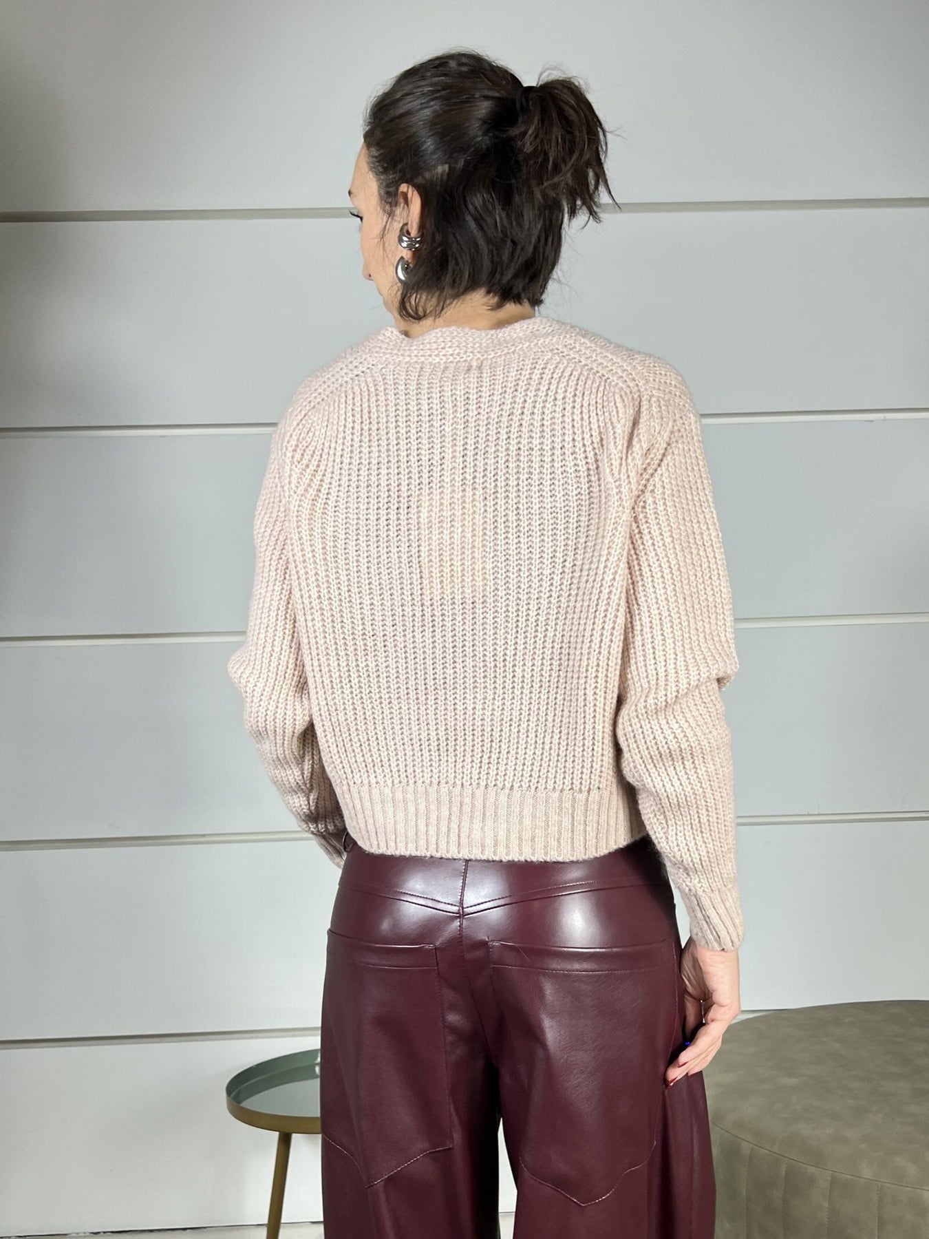 cardigan Susy Mix con fiocchi rosa cipria, in misto lana, la modella è una 40 ed è alta 172cm, veste da una 38 a una 44. Composizione %pc 29%pa 7%vi 7%