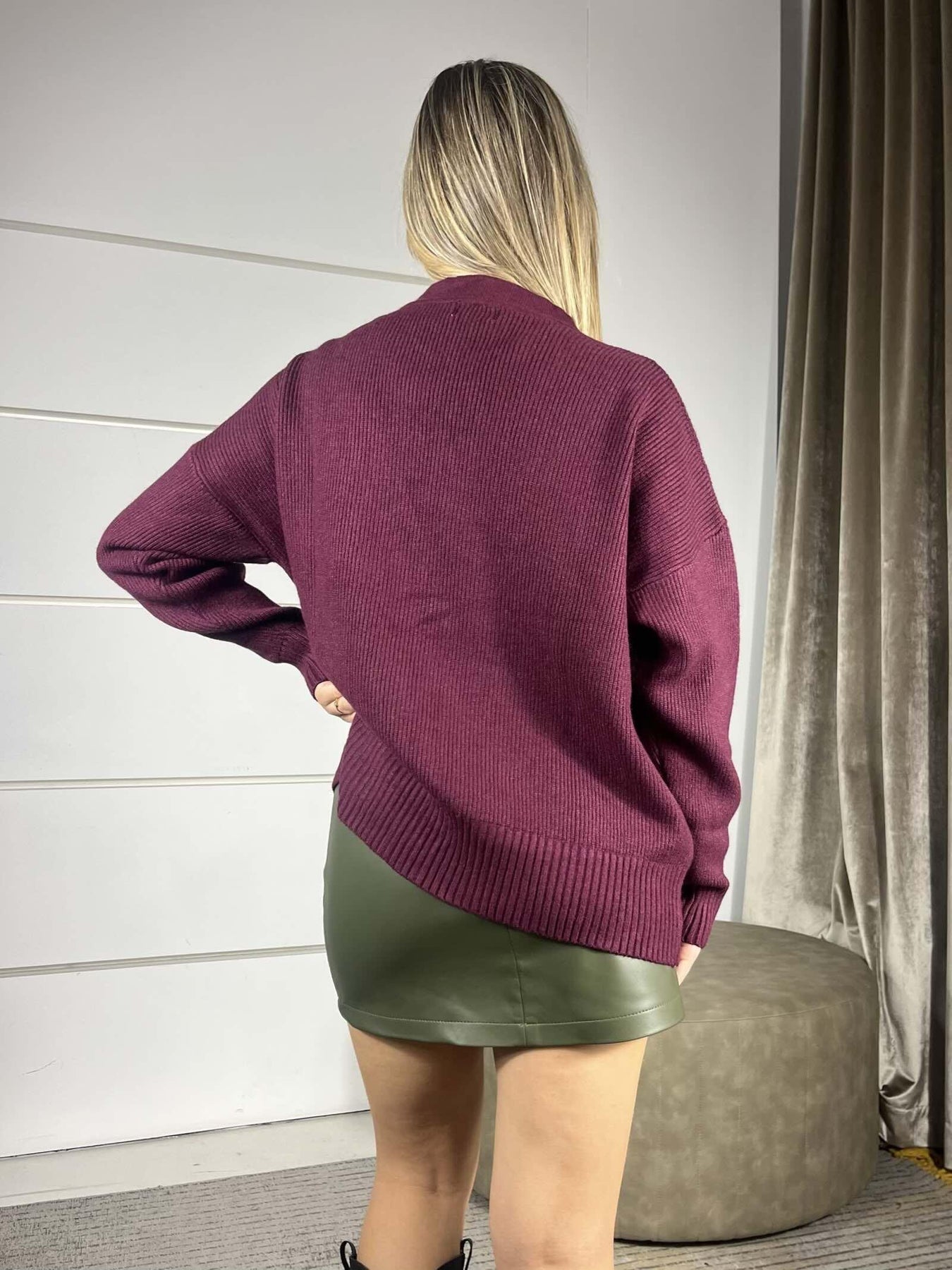 cardigan Susy Mix bordeaux a costa inglese , scollo a v , la modella è una 40 ed è alta 165cm. Composizione 50%vi 28%pl 22%pa