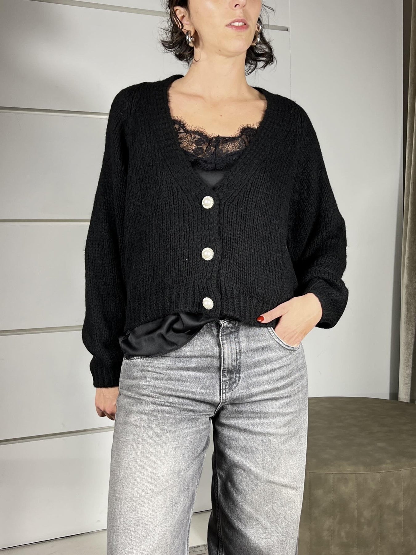 cardigan nero scollo a v con bottone gioiello