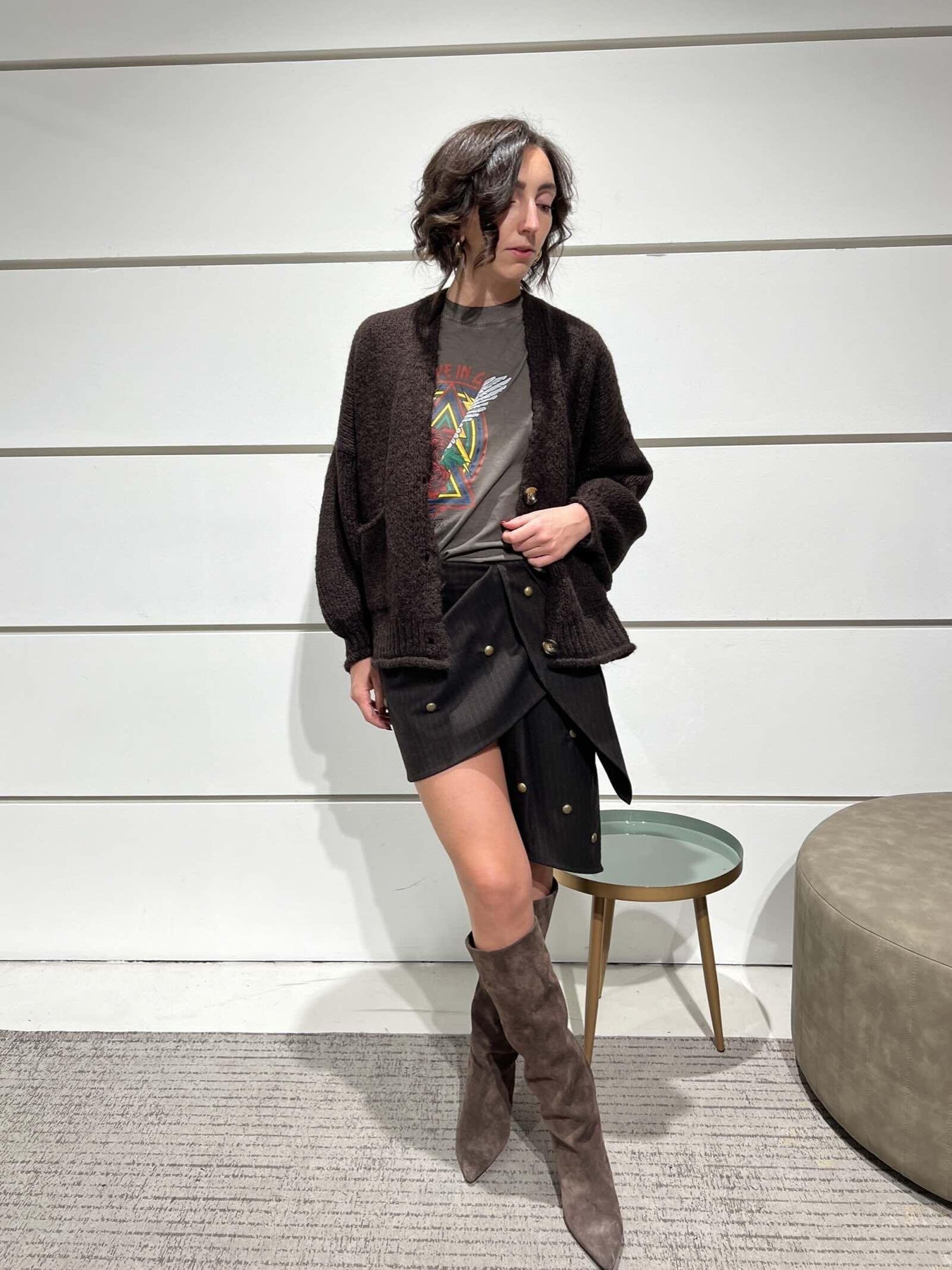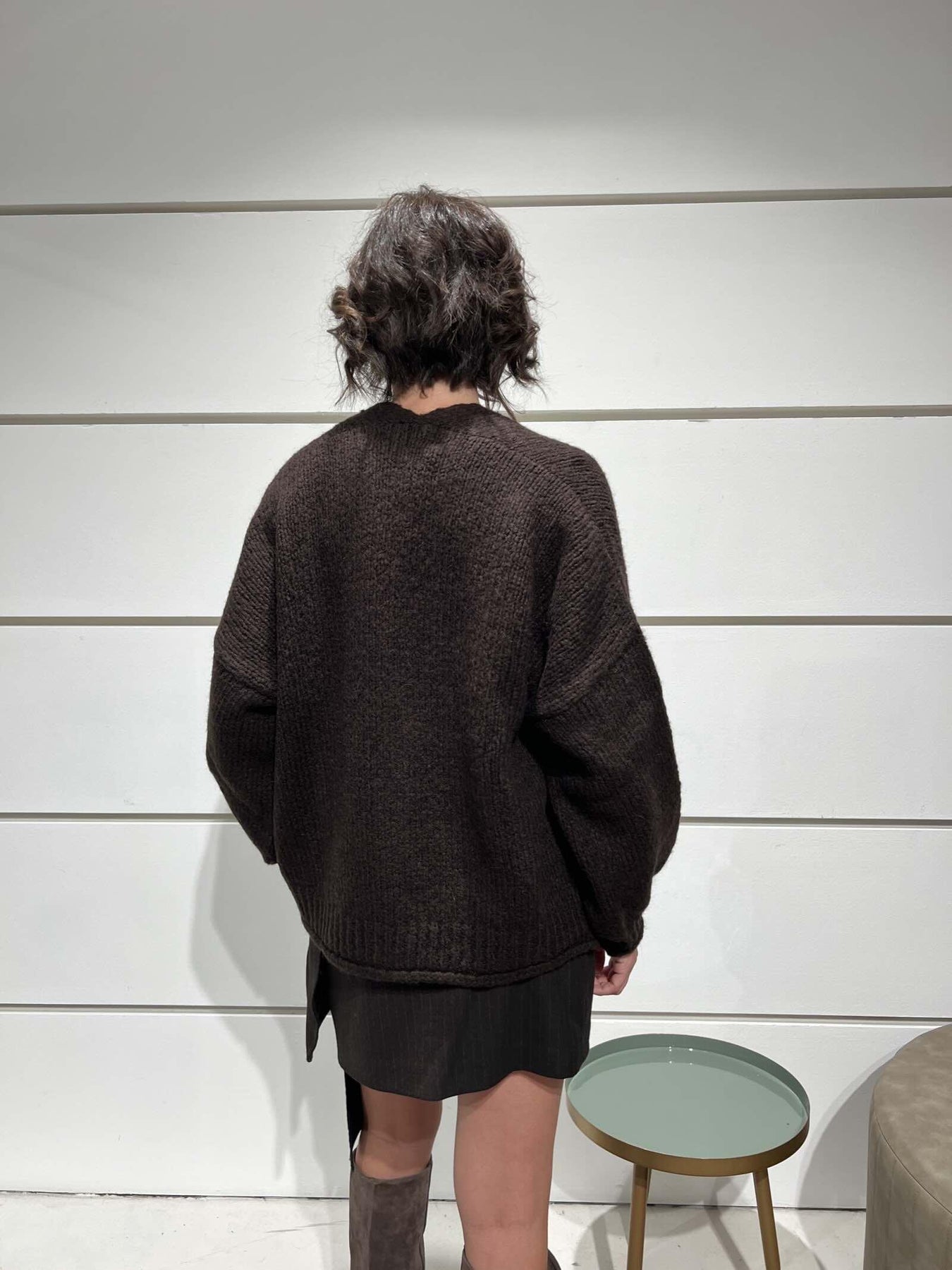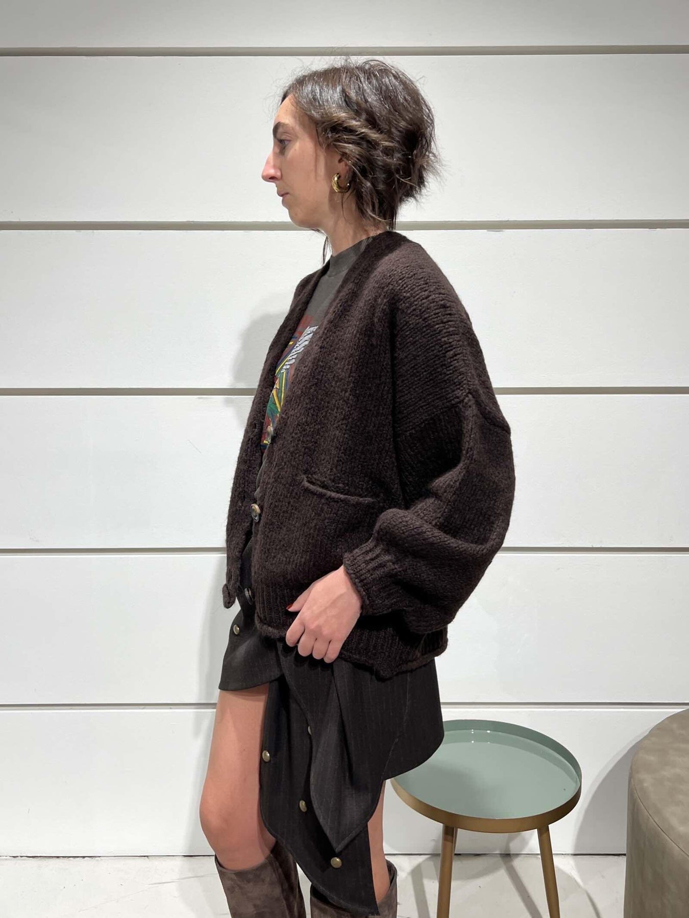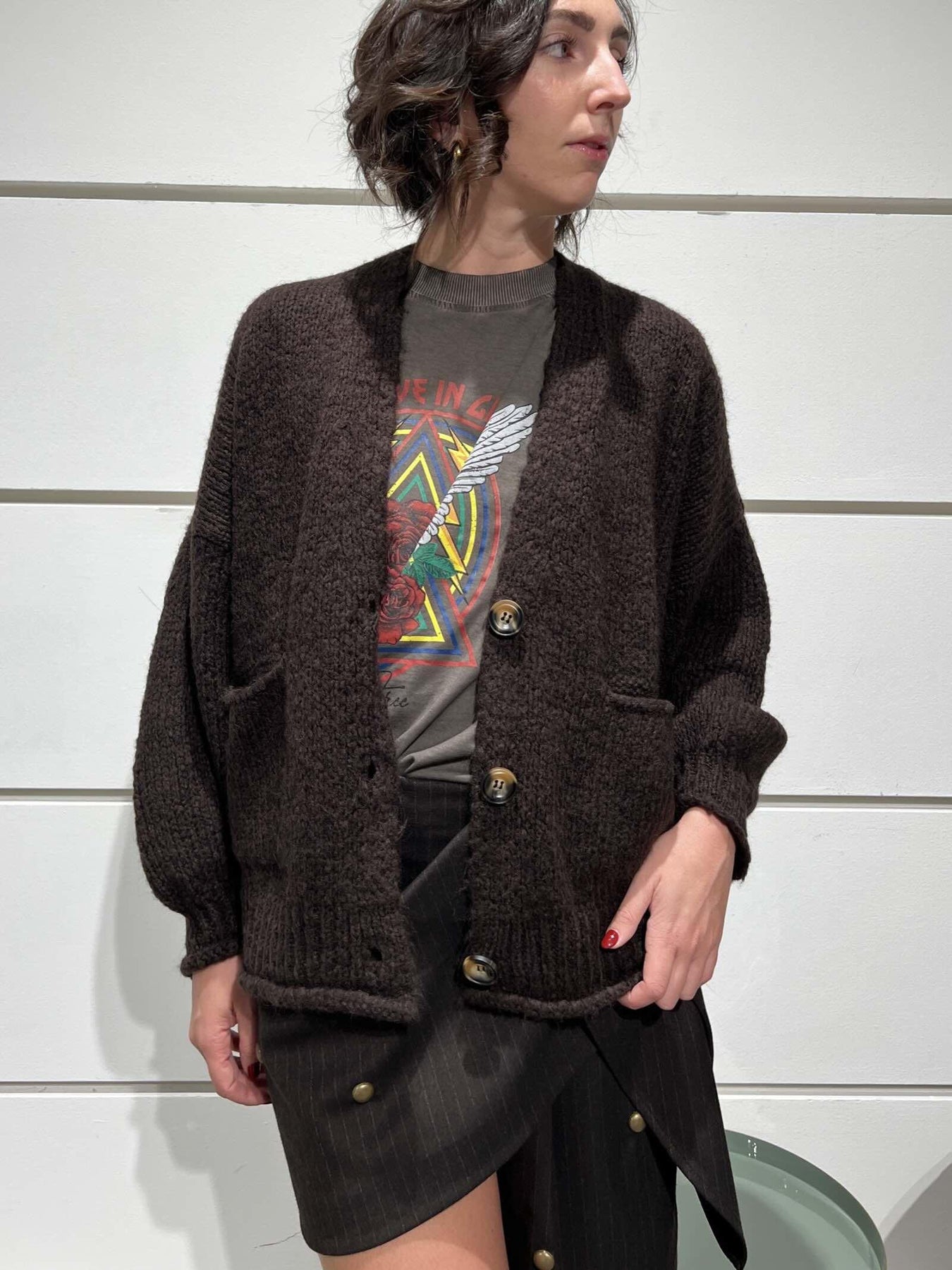 Cardigan HaveOne moro over 3 bottoni, misto lana. La modella è una 40 ed è alta 172cm, veste da una 38 a una 46. Composizione 62%pc 18%pl 8%wo 8%vi 4%wp