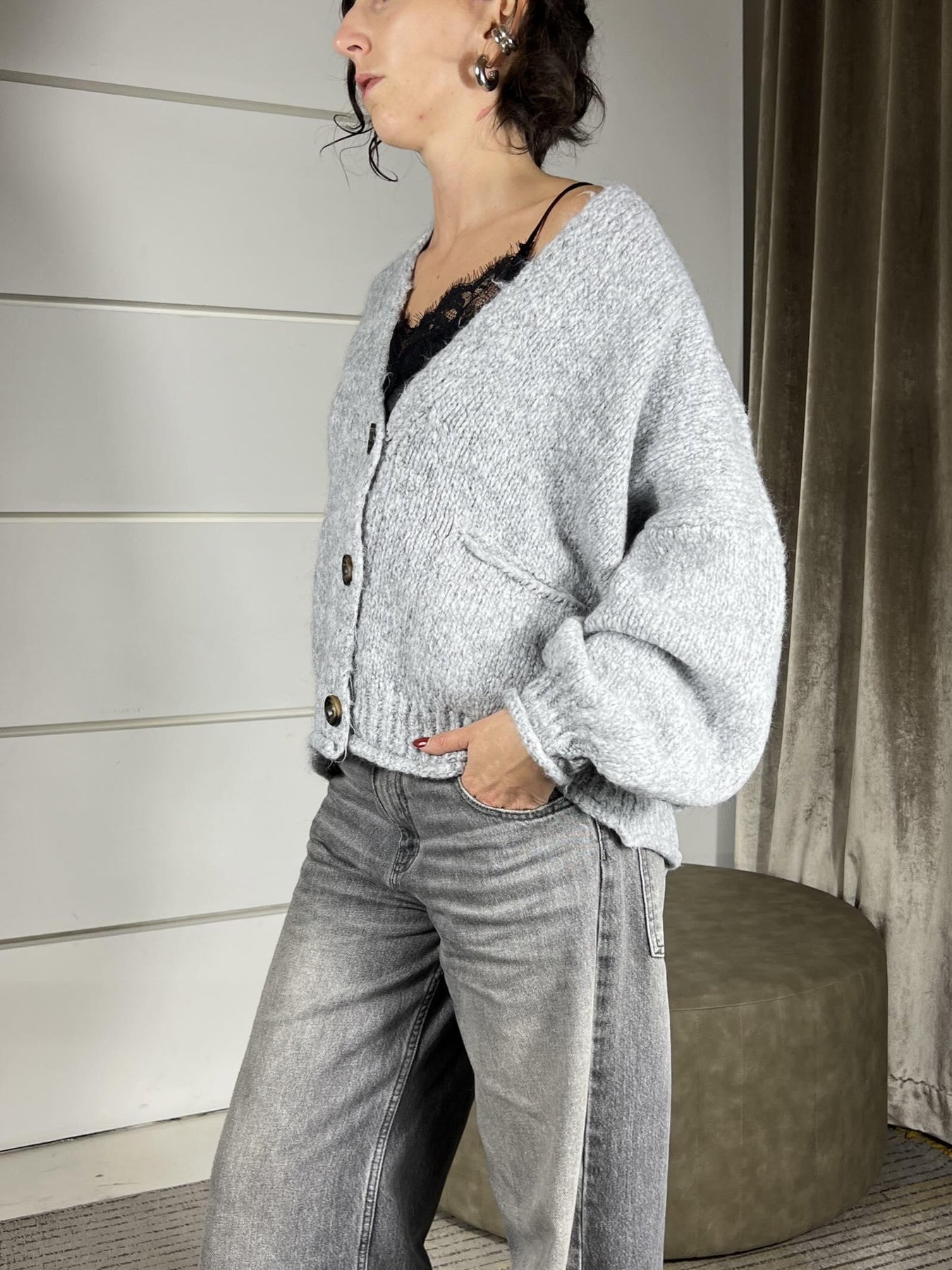 Cardigan HaveOne perla over 3 bottoni, misto lana. La modella è una 40 ed è alta 172cm, veste da una 38 a una 46. Composizione 62%pc 18%pl 8%wo 8%vi 4%wp