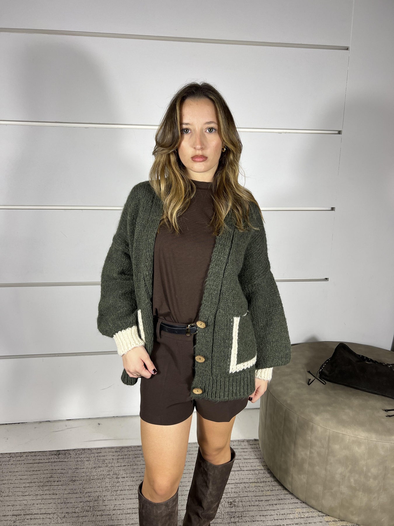 cardigan HaveOne militare over, scollo a v, in misto lana, con tasche bicolore burro . La modella è una 38 ed è alta 162cm. Composizione 62%pc 18%pl 8%wo 8%vi 4%wp