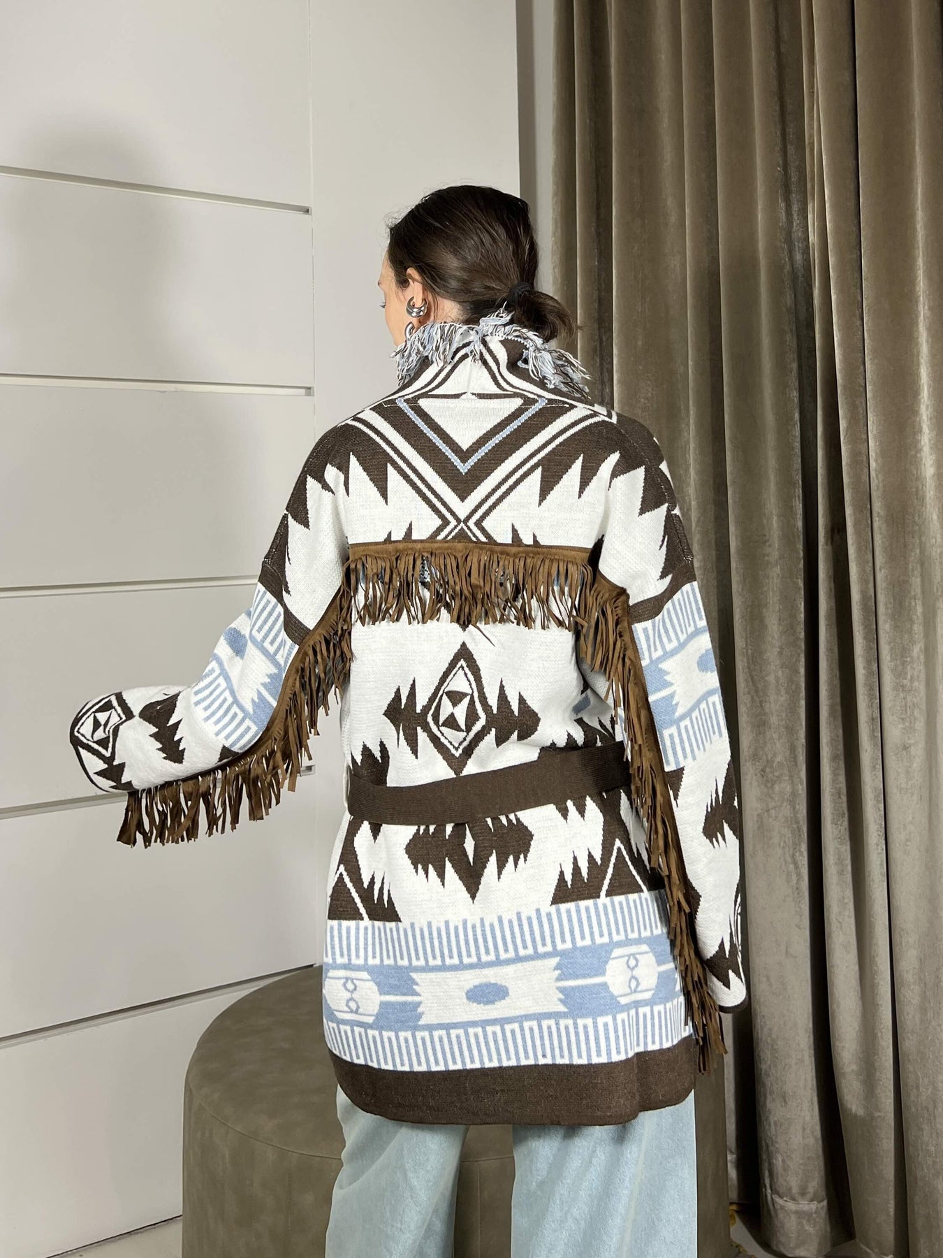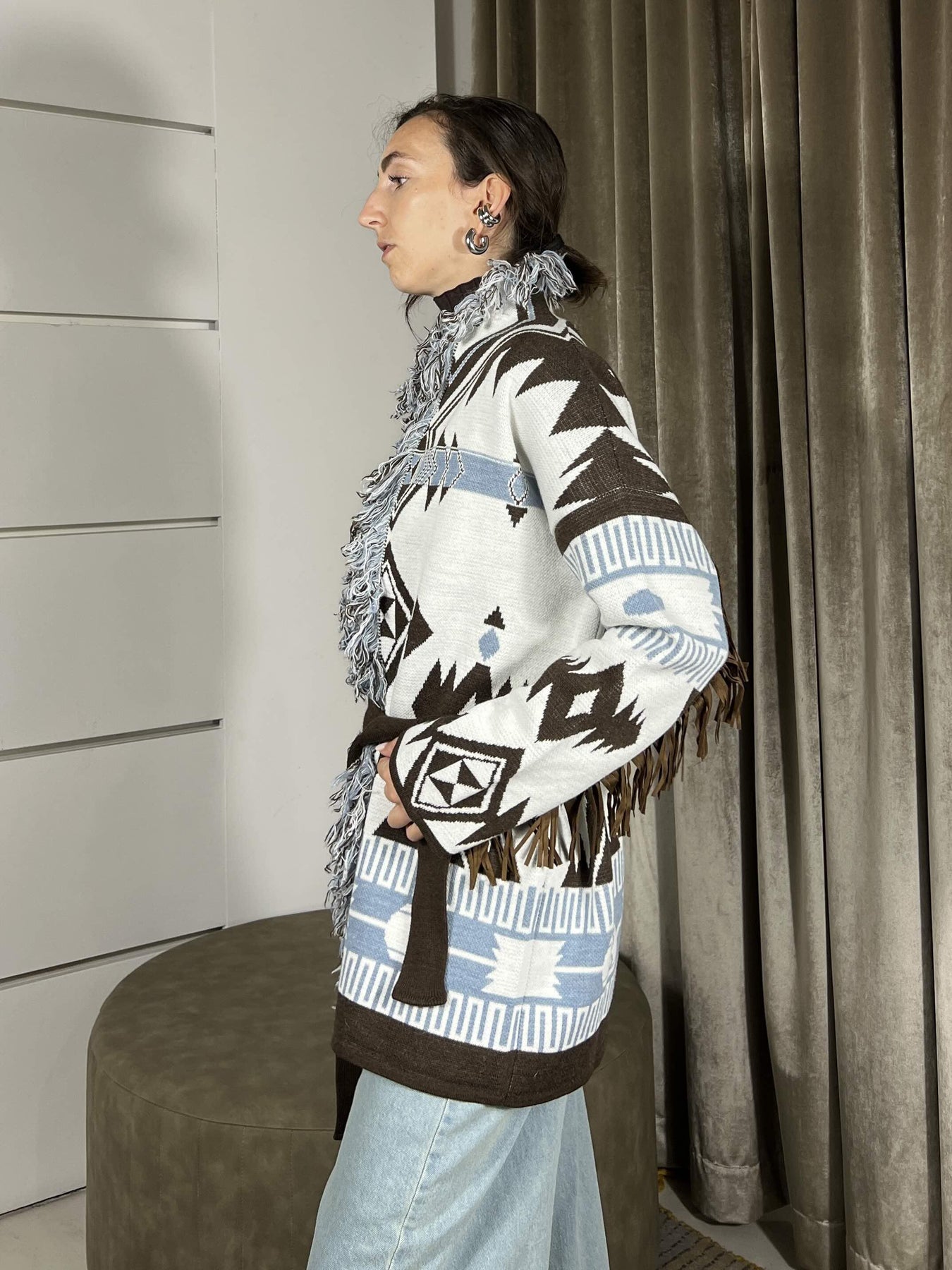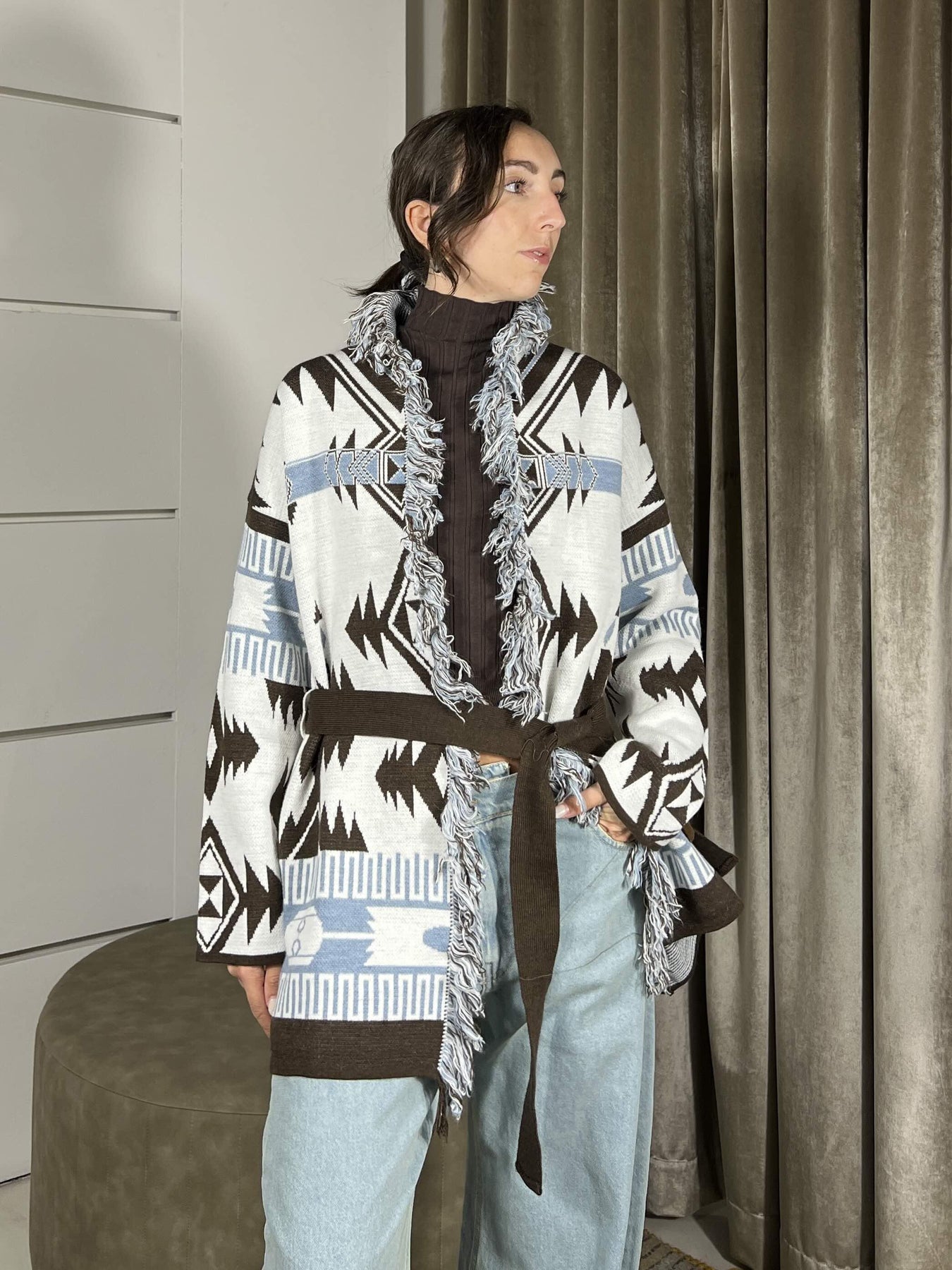 Cardigan Vicolo astampa etnica con cinta e frange. La modella è una 40 ed è alta 172cm, veste da una 38 a una 44. Composizione 75%pc 10%wo 10%vi 5%wp