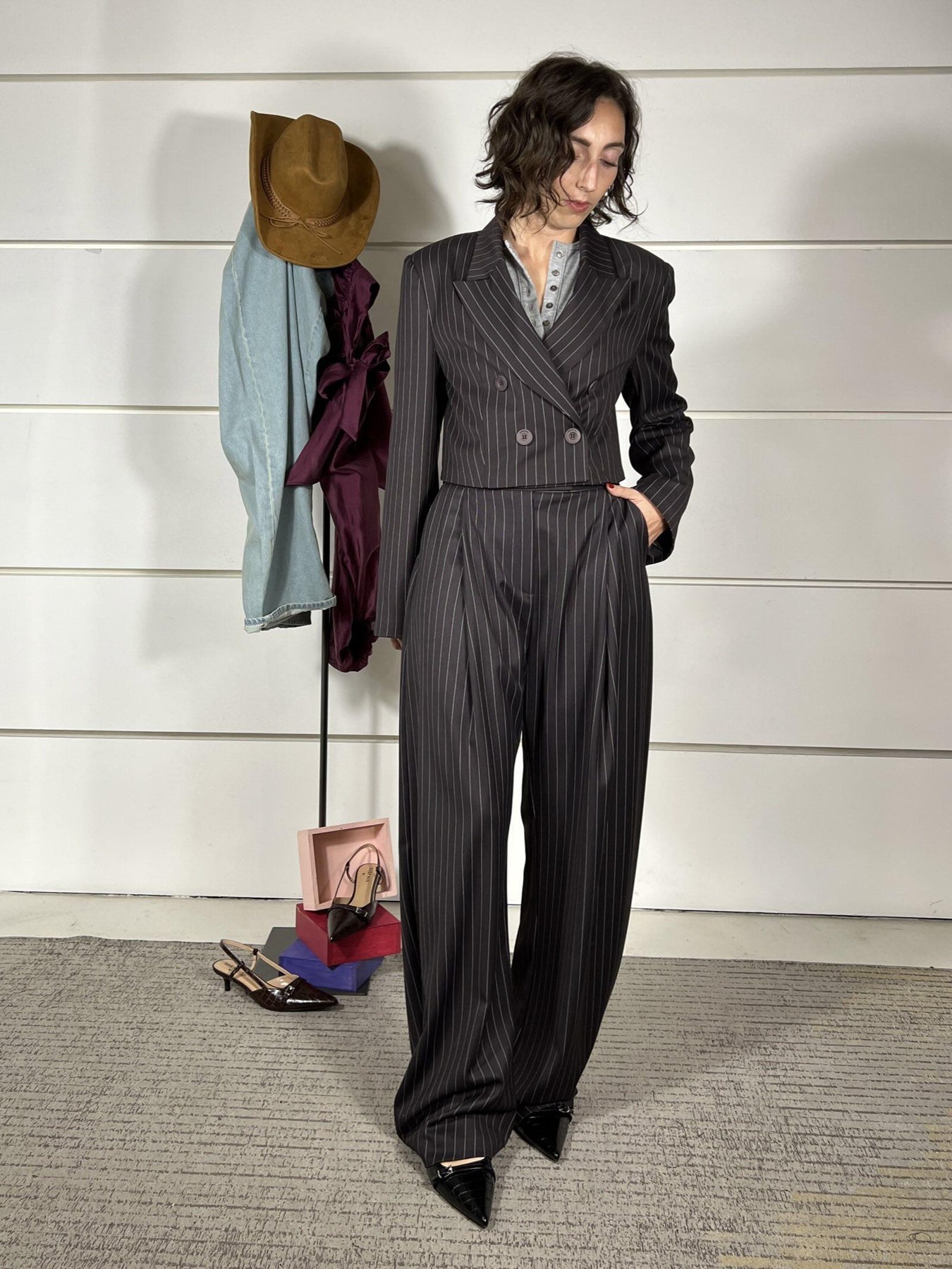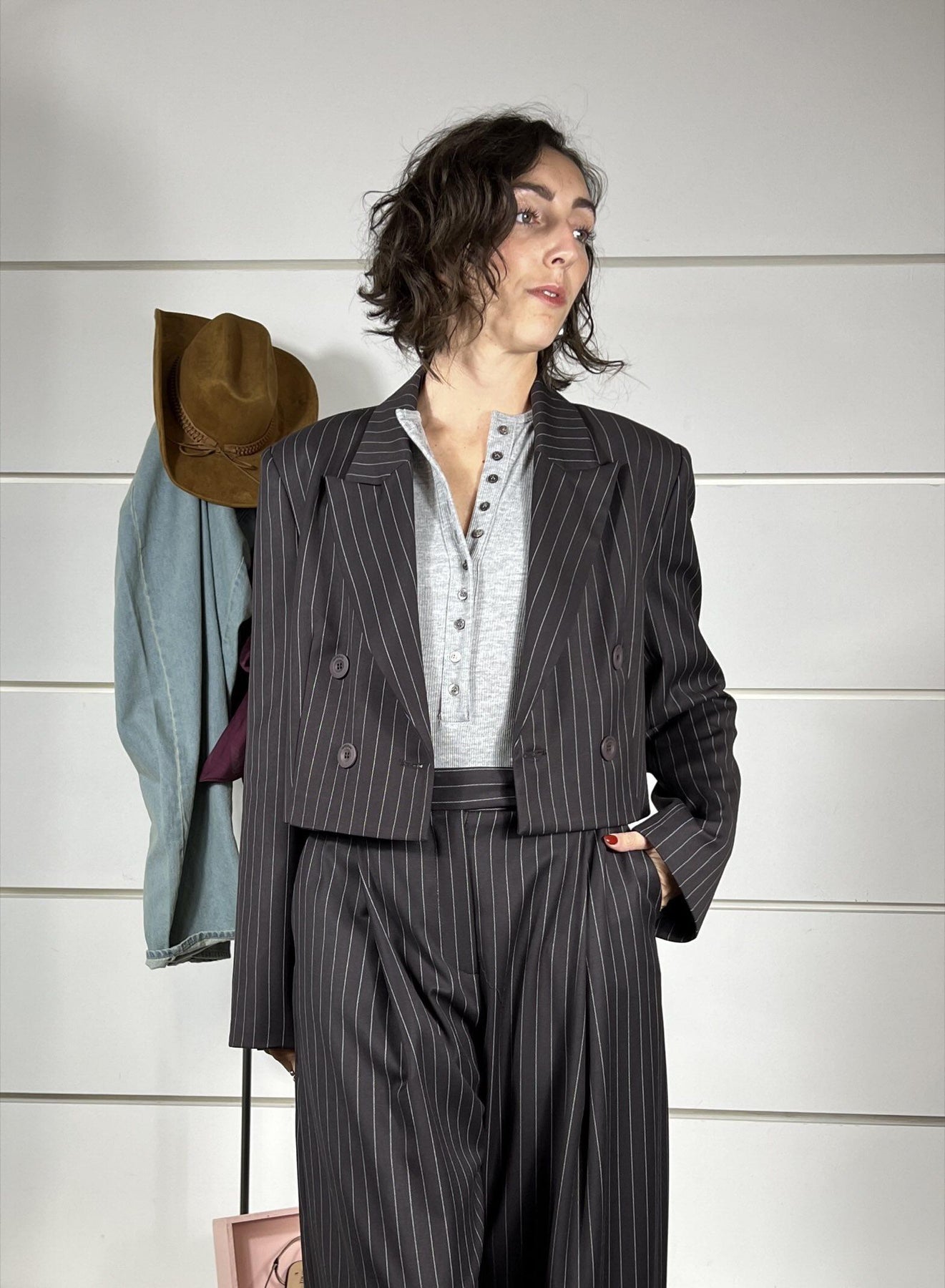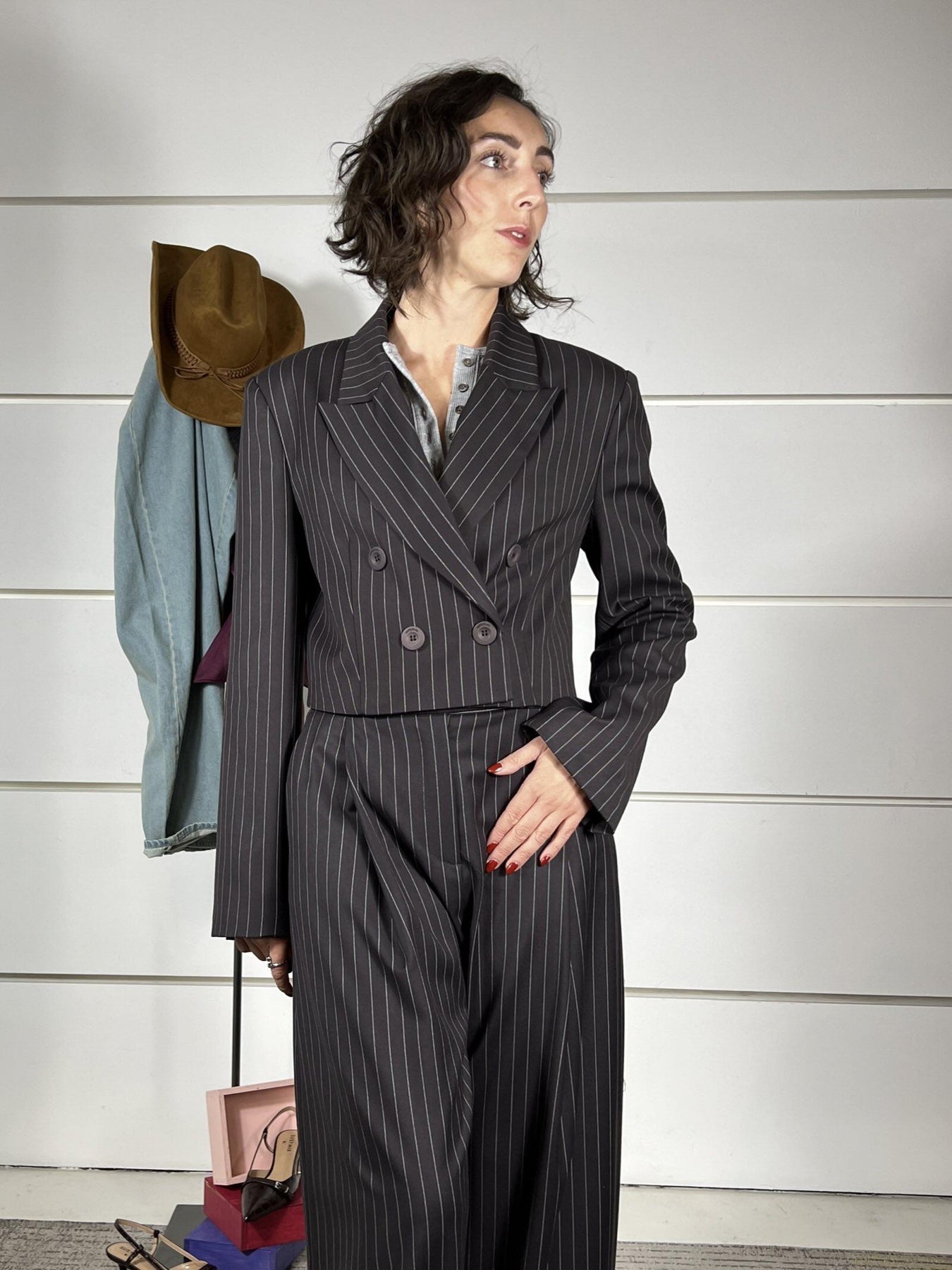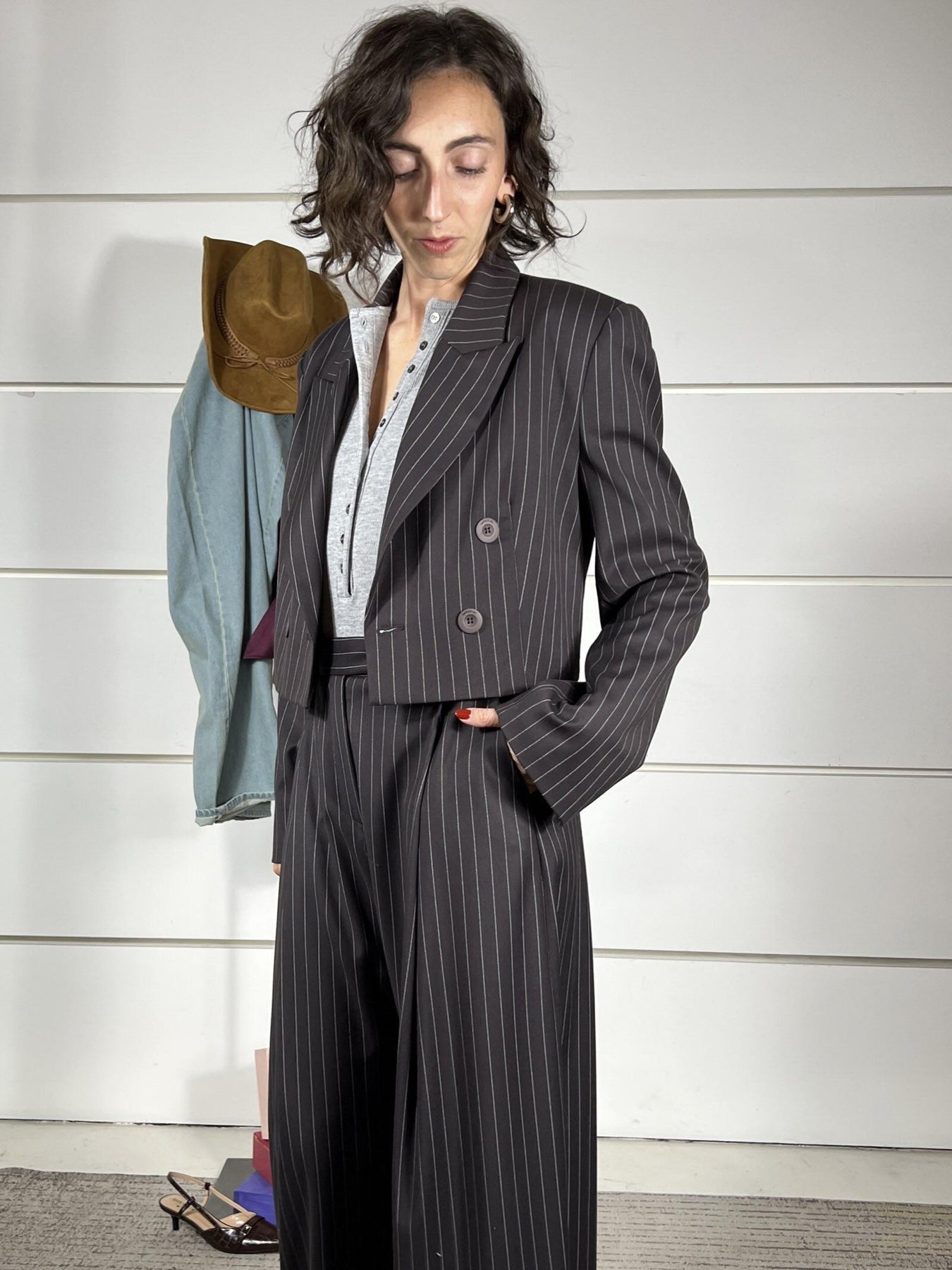 giacca Imperial moro gessata, crop, volendo si abbin al pantalone. La modella indossa la s ed è alta 172cm