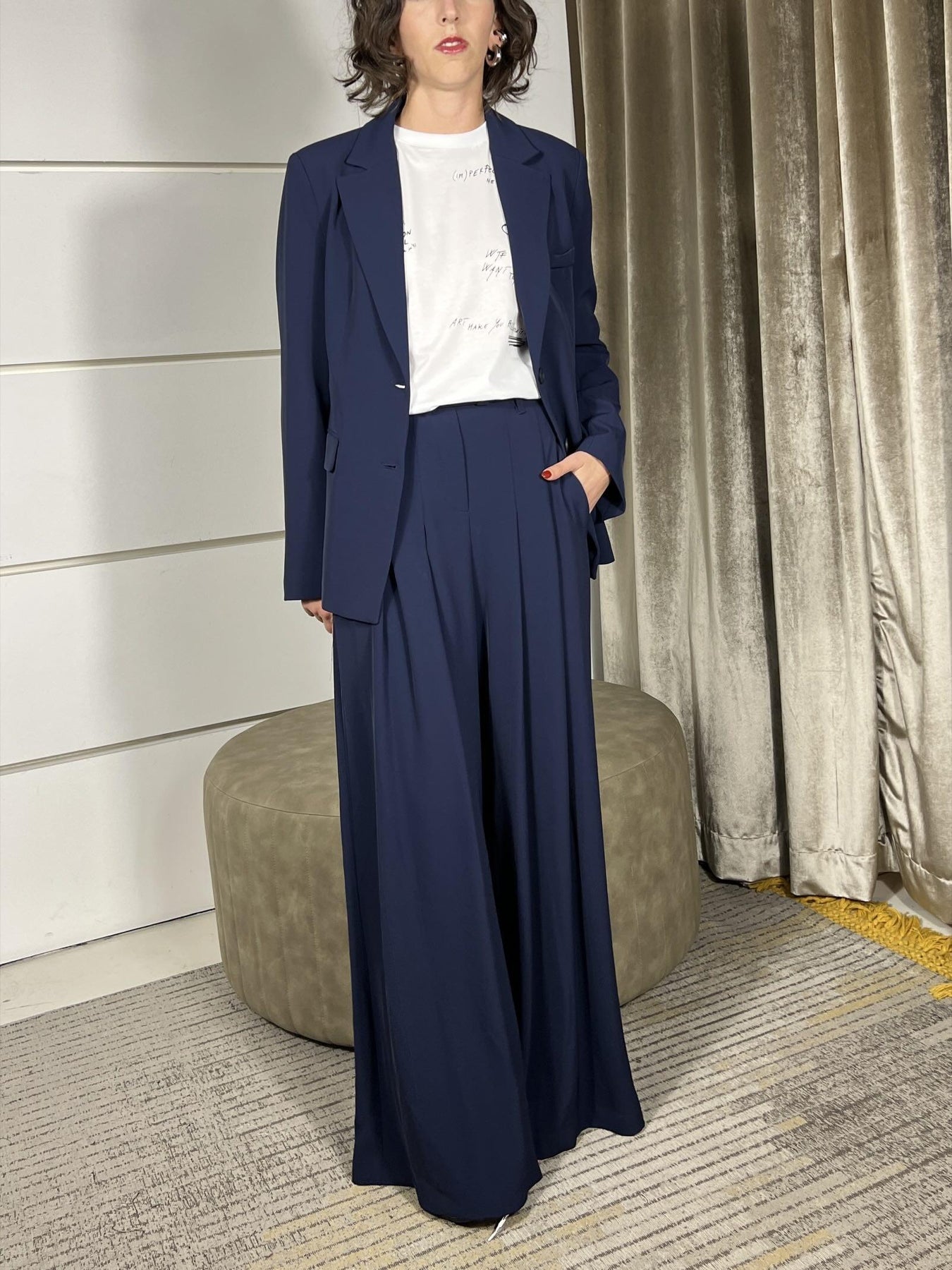 giacca Imperila blu due bottoni con spacchi a lato, tasche a patta , la modella indossa la s ed è alta 172cm. Composizione 96%pl 4%ea