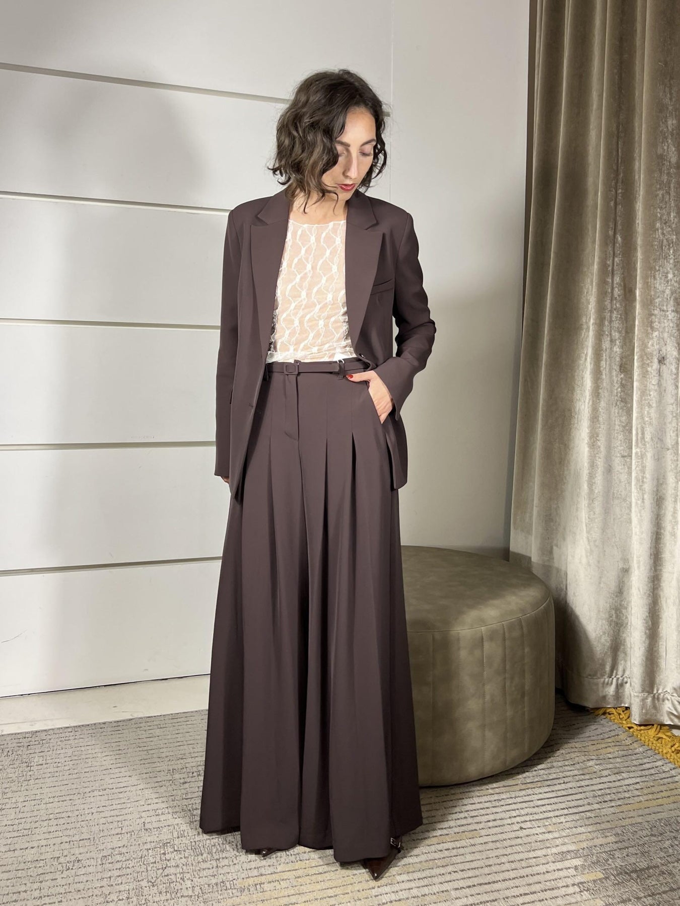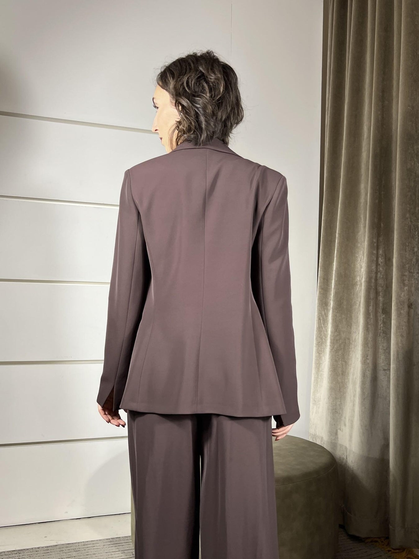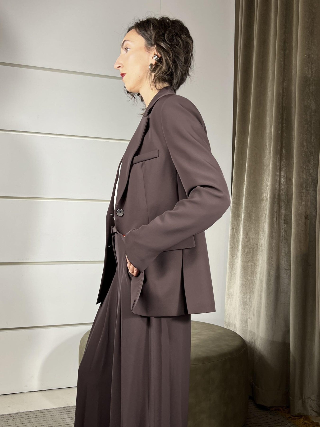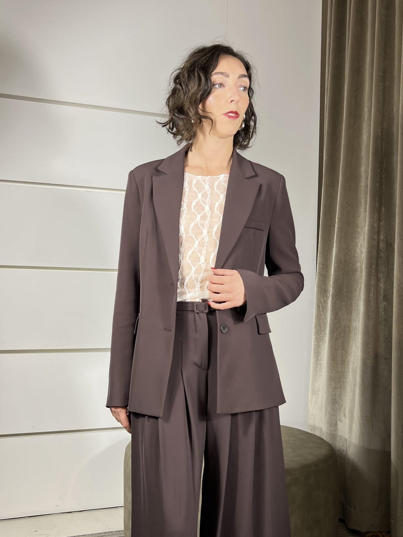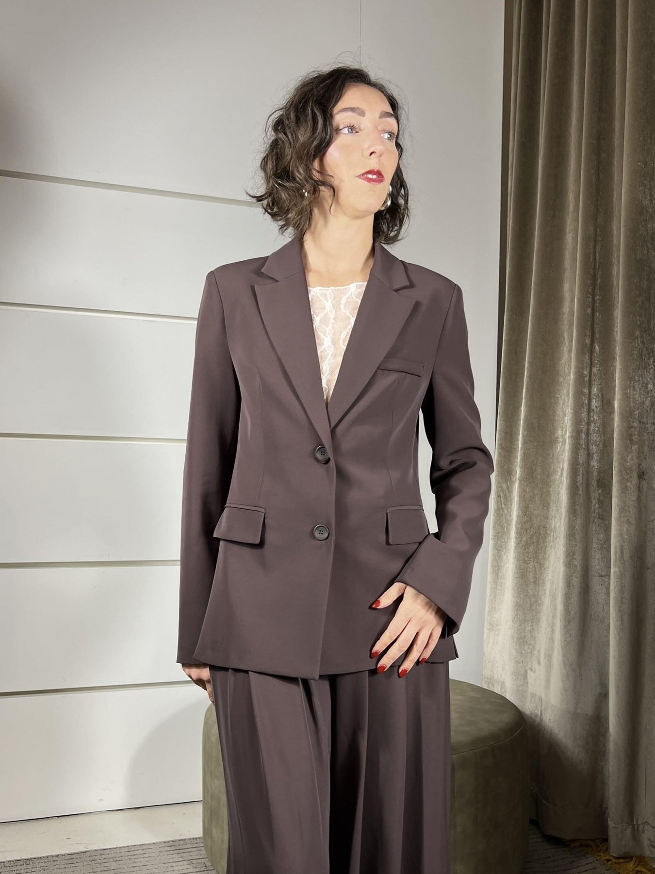 giacca Imperila moro due bottoni con spacchi a lato, tasche a patta , la modella indossa la s ed è alta 172cm. Composizione 96%pl 4%ea