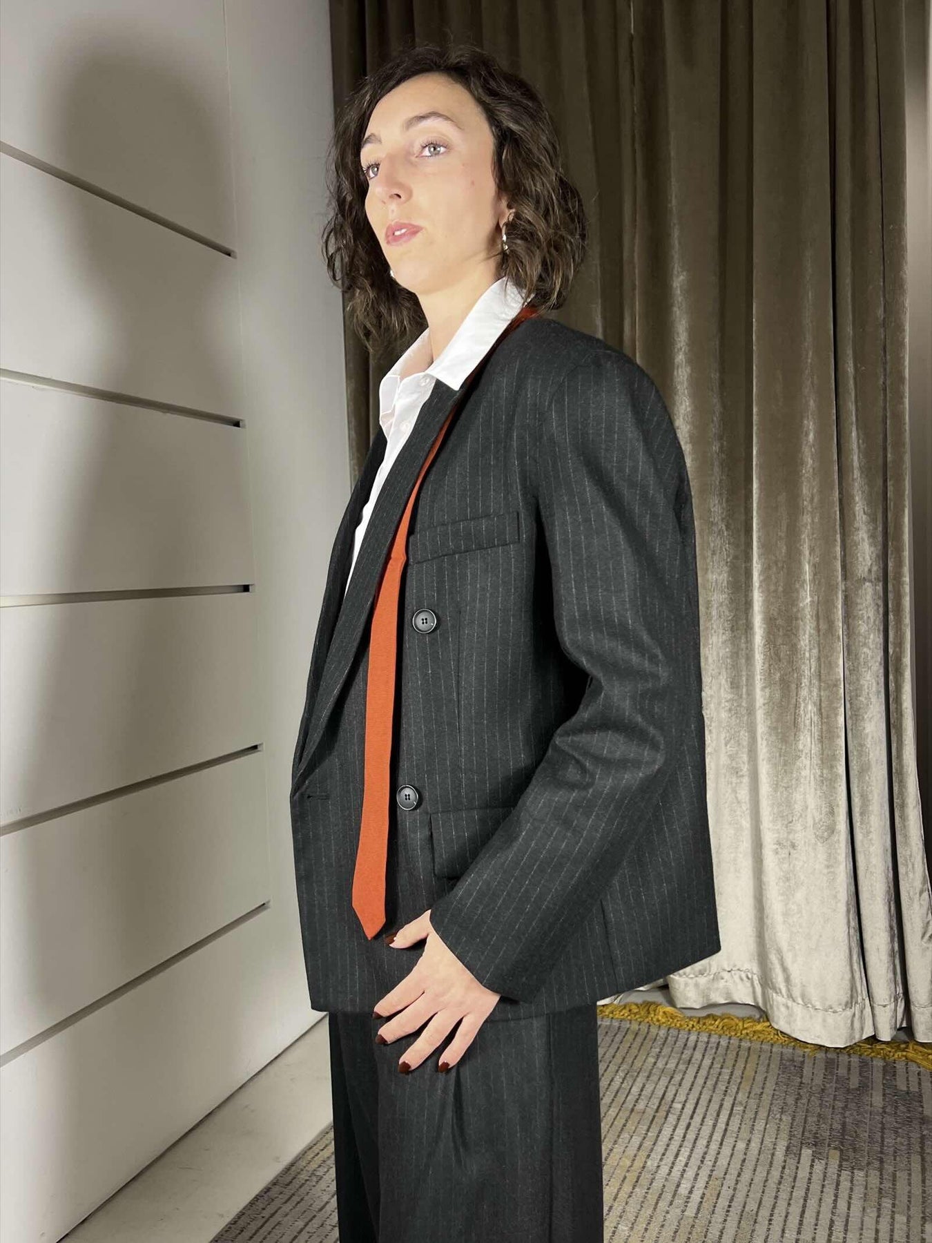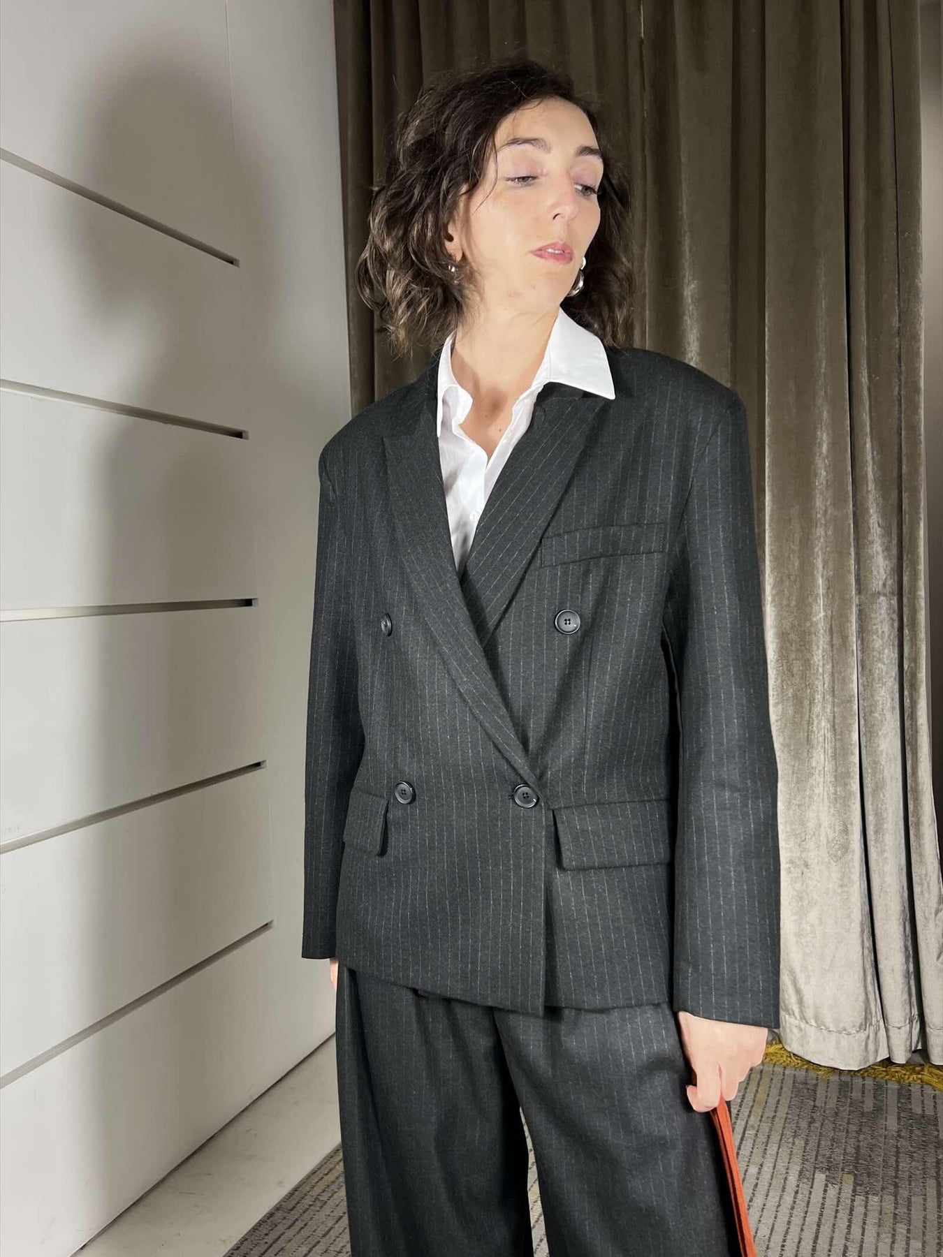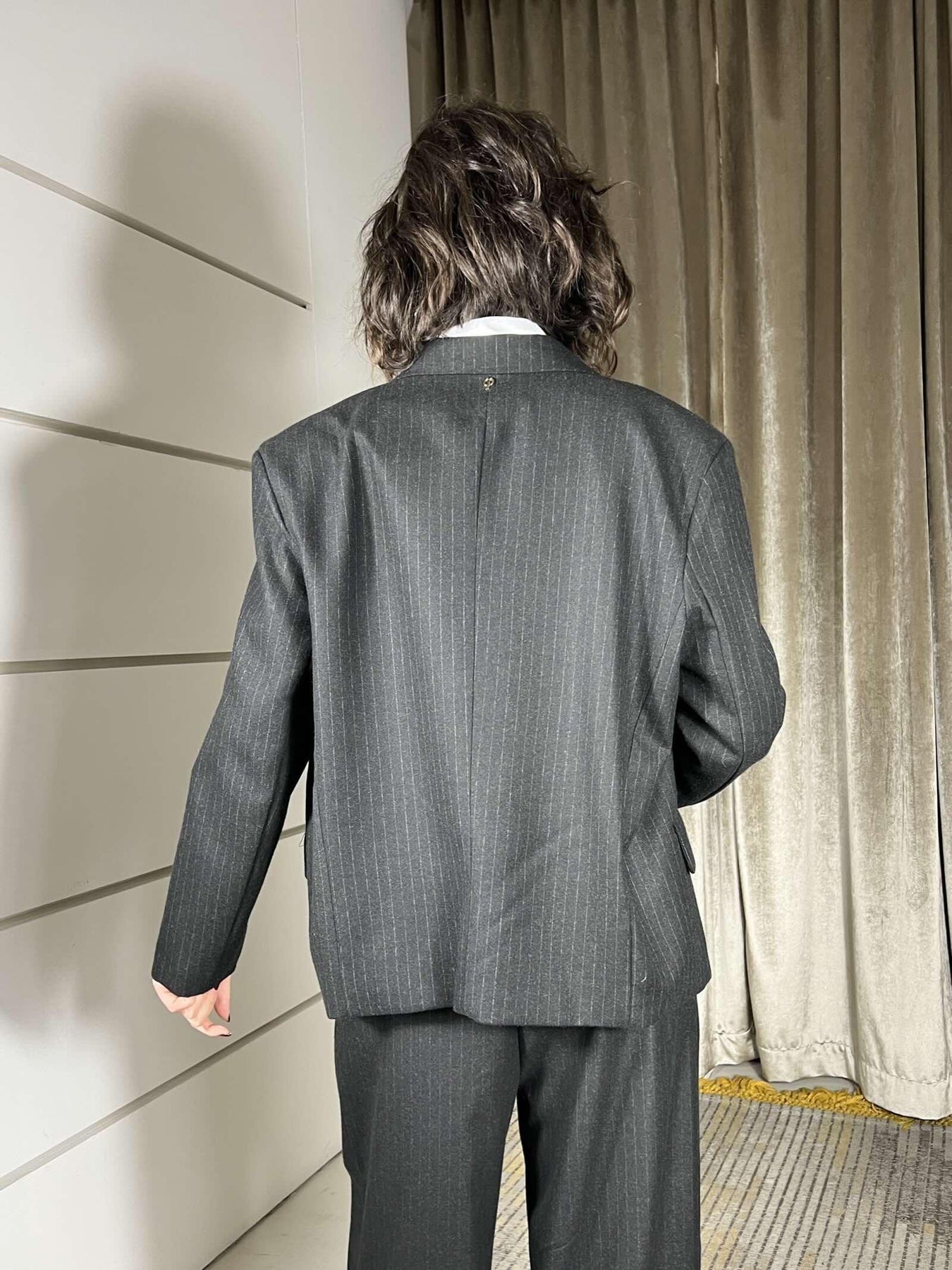 giacca Philia Loft nera gessata doppiopetto, volendo si abbina al pantalone , in calda viscosa, la modella indossa la s ed è alta 172cm. Composizione 65%pl 33%vi 2%ea