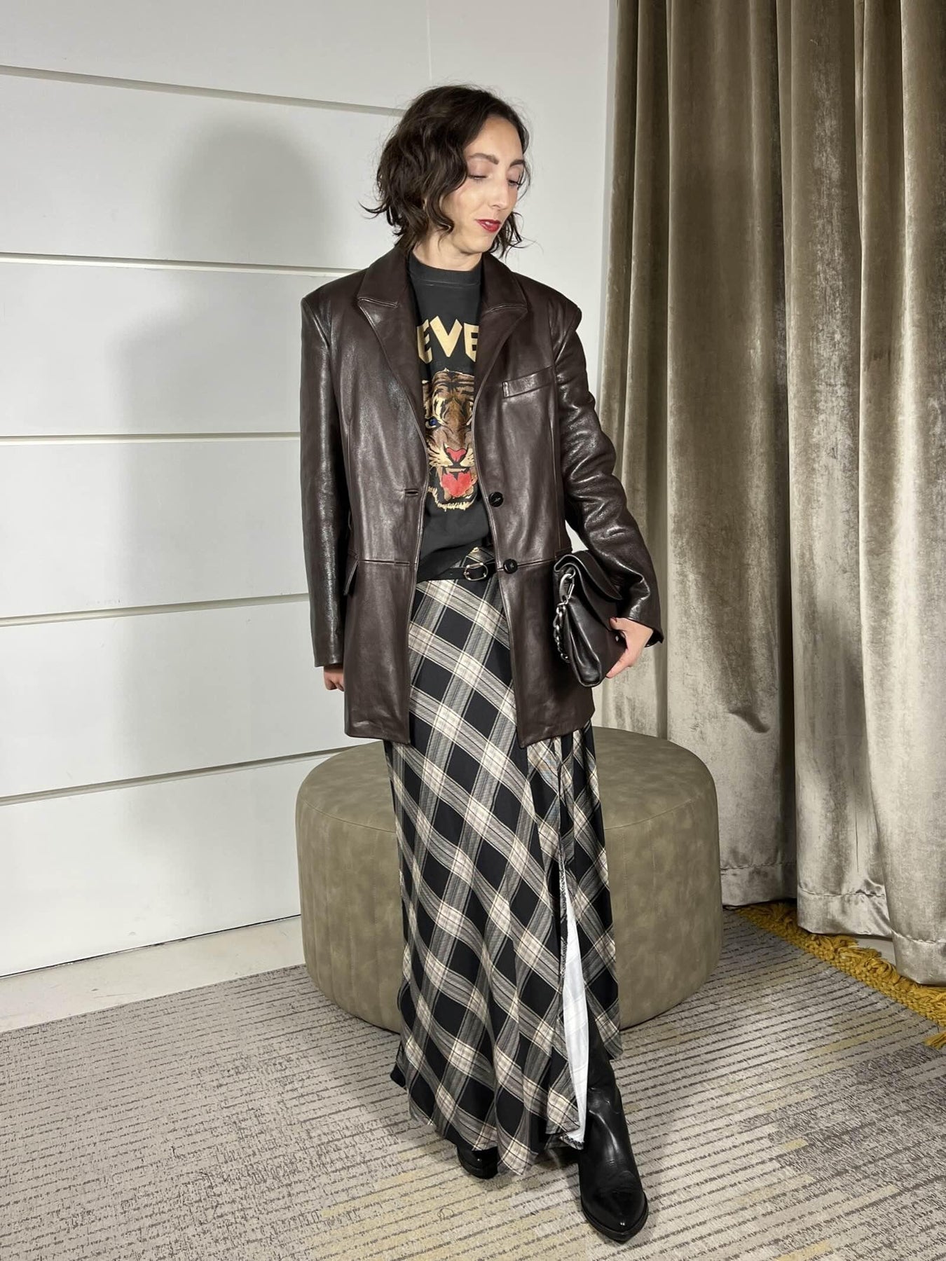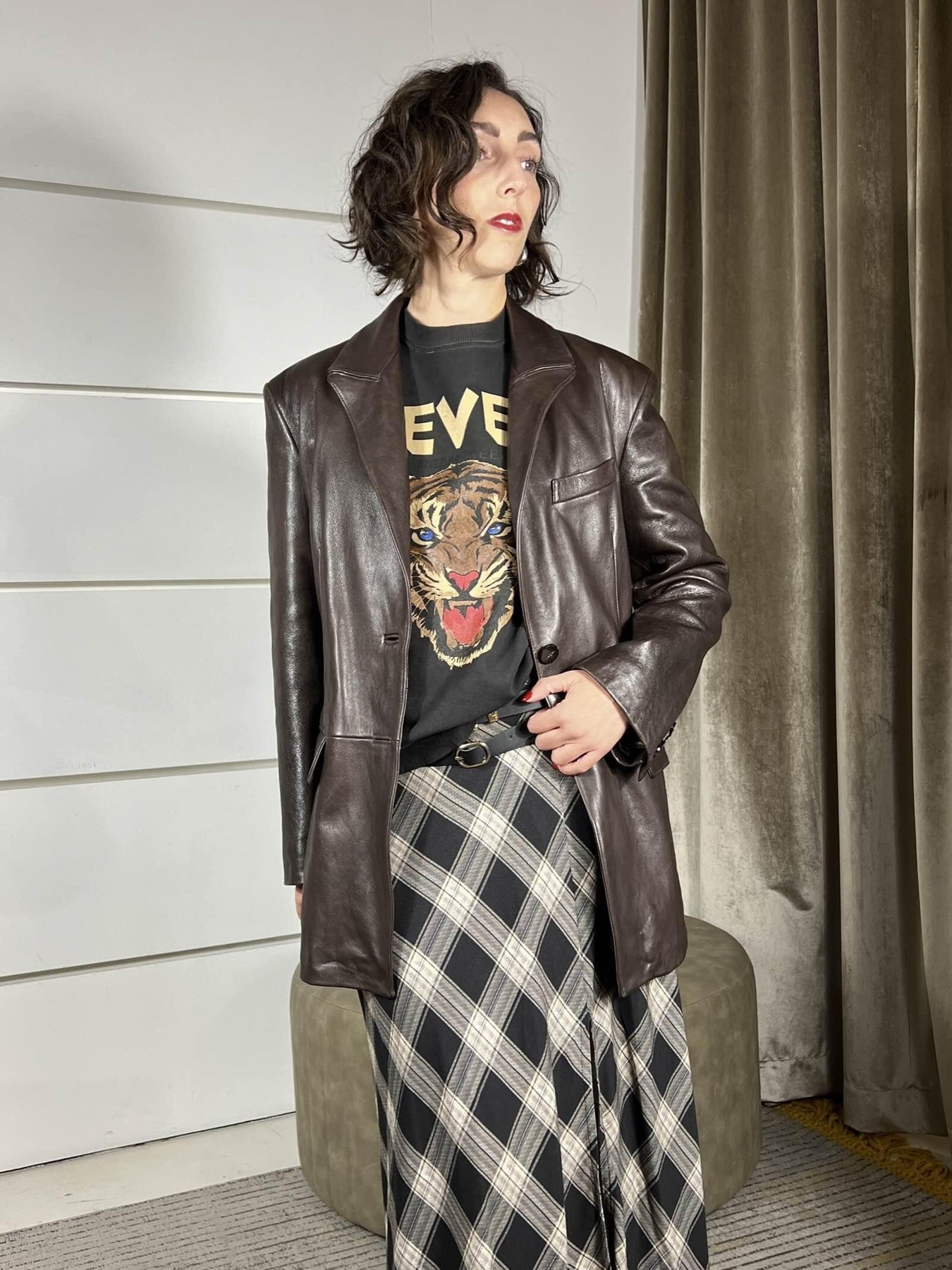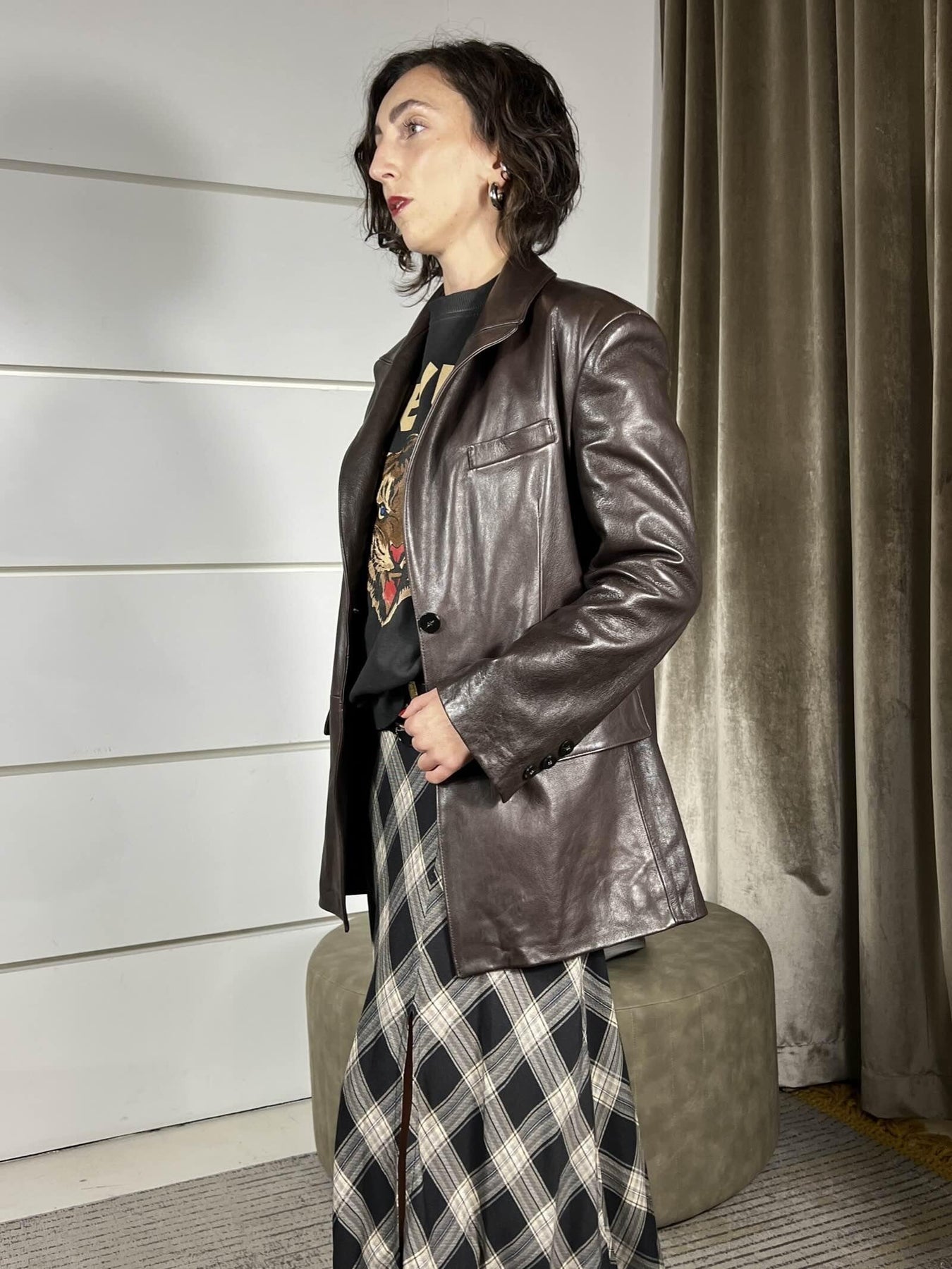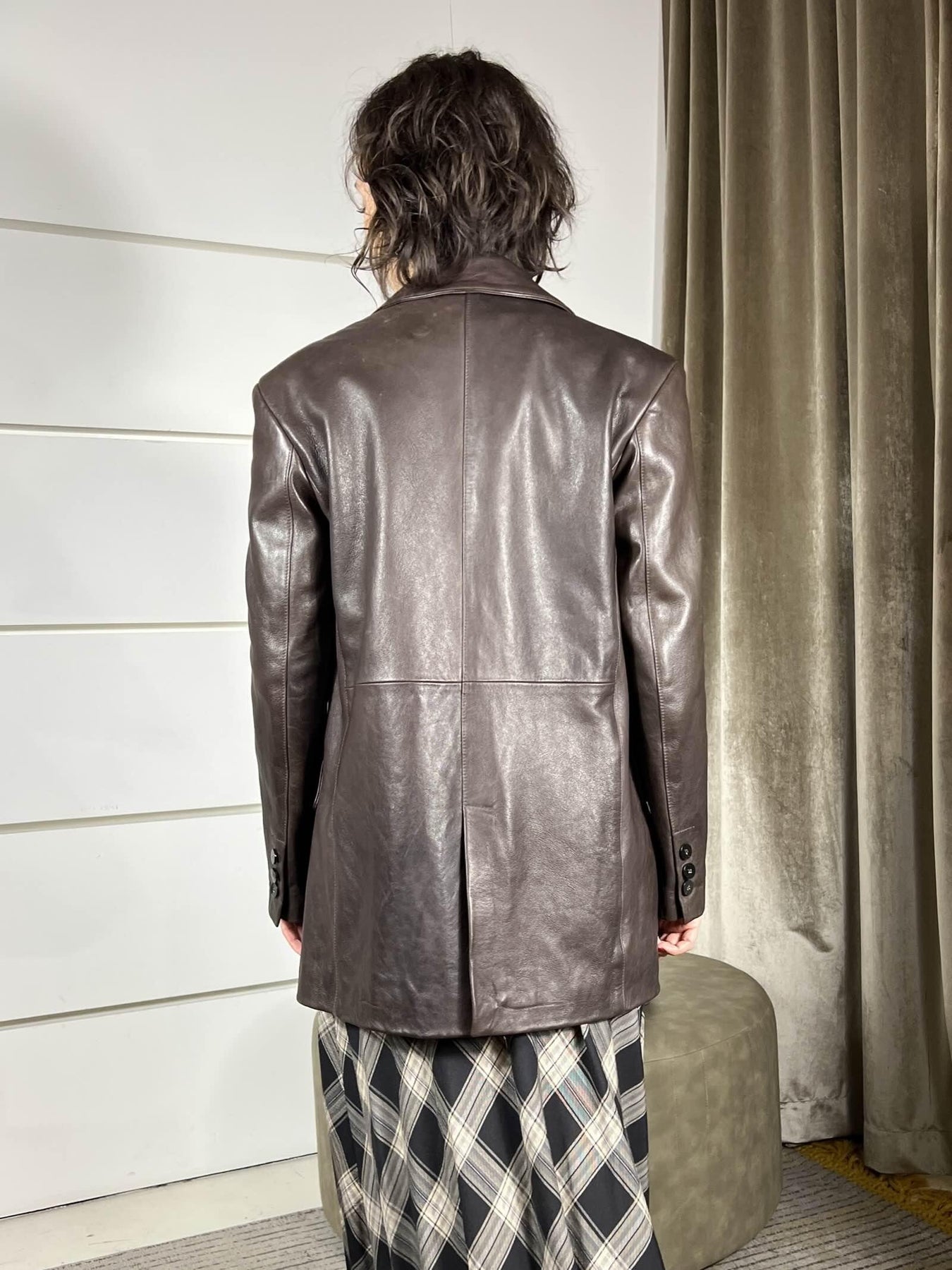 Giacca Simona Corsellini in vera pelle, fondant, over un bottone, con splla imbottita, la modella indossa la 40 ed è alta 172cm