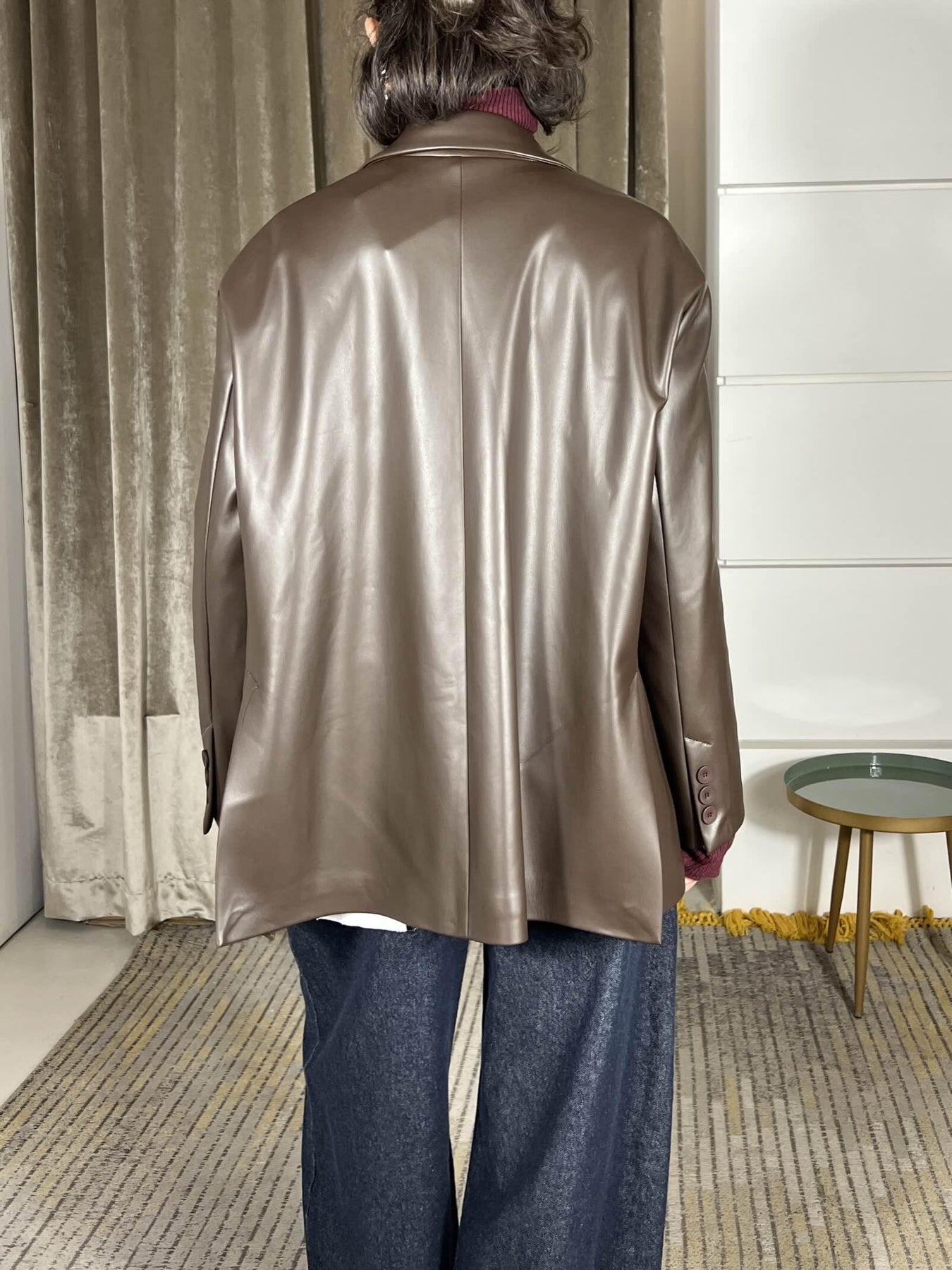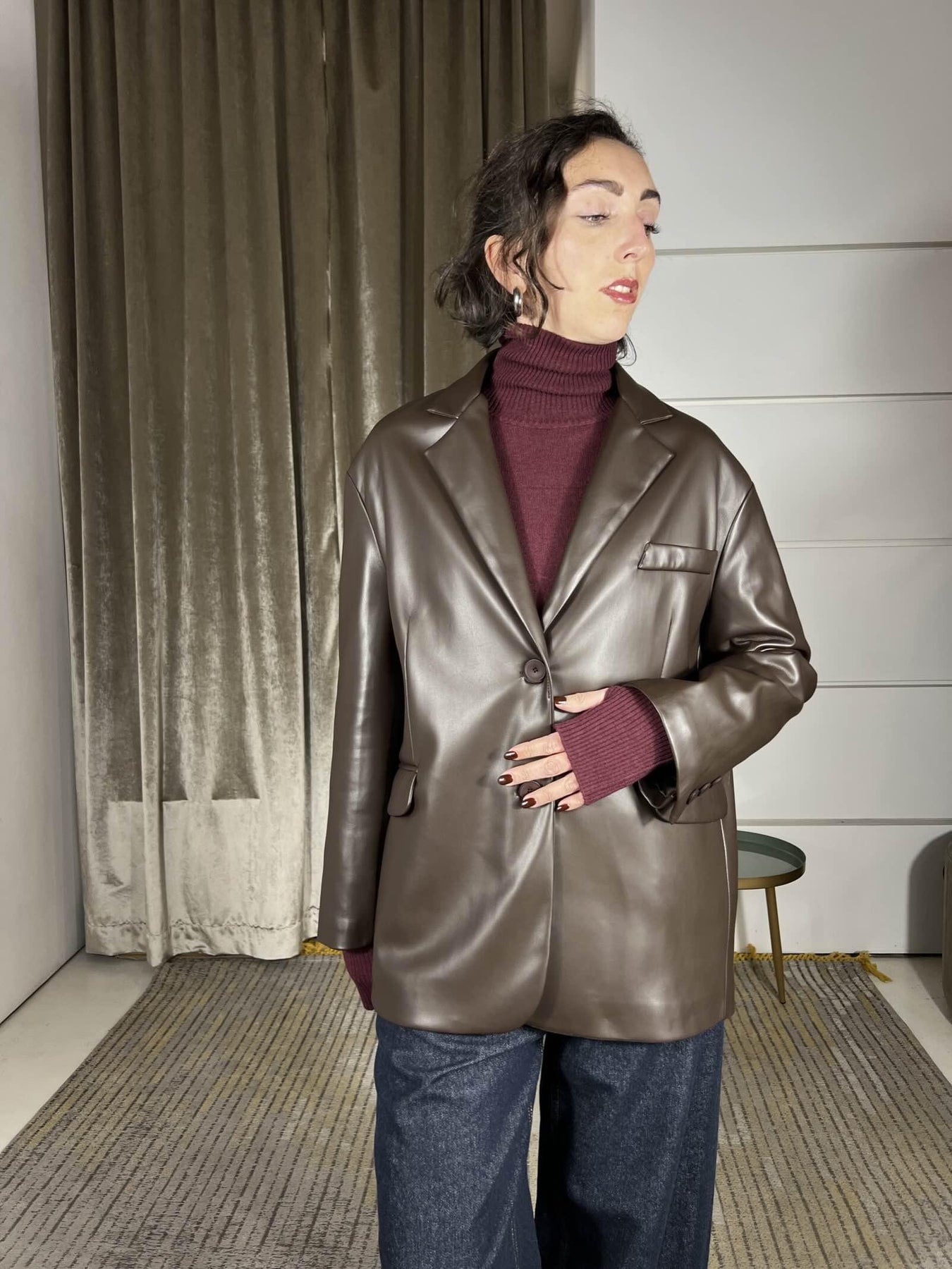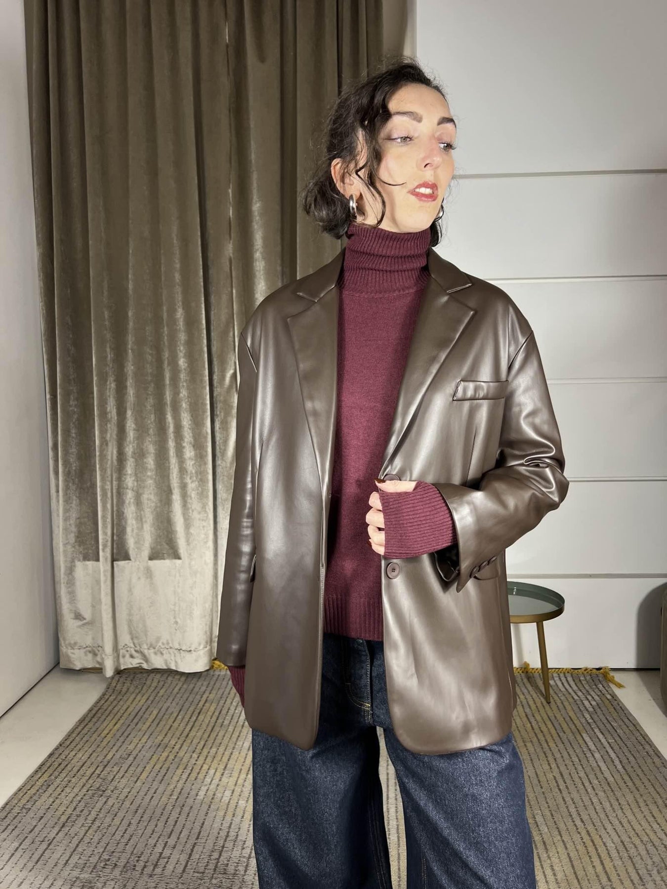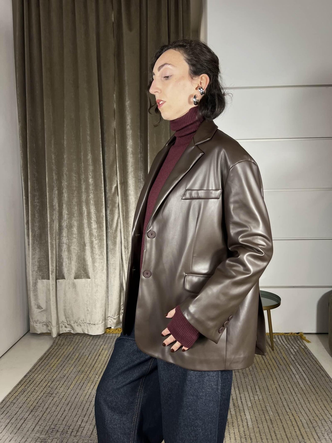 Giacca Tensione In nera in ecopelle, modello over con spacchi a alto, la modella è una 40 ed è alta 172cm, veste da una 38 a una 46.