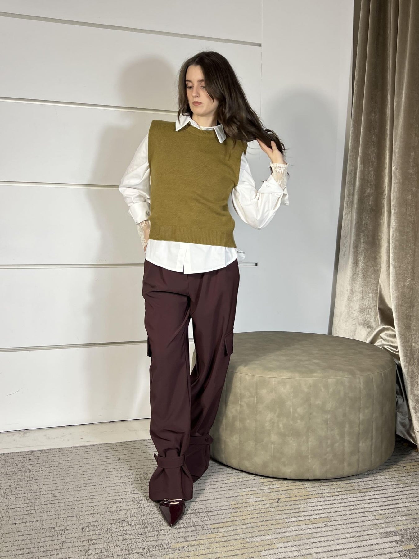 gilet Tensione In olio girocollo con spallina , in m.viscosa, la modella è una 40 ed è alta 165cm, veste da una 38 a una 44