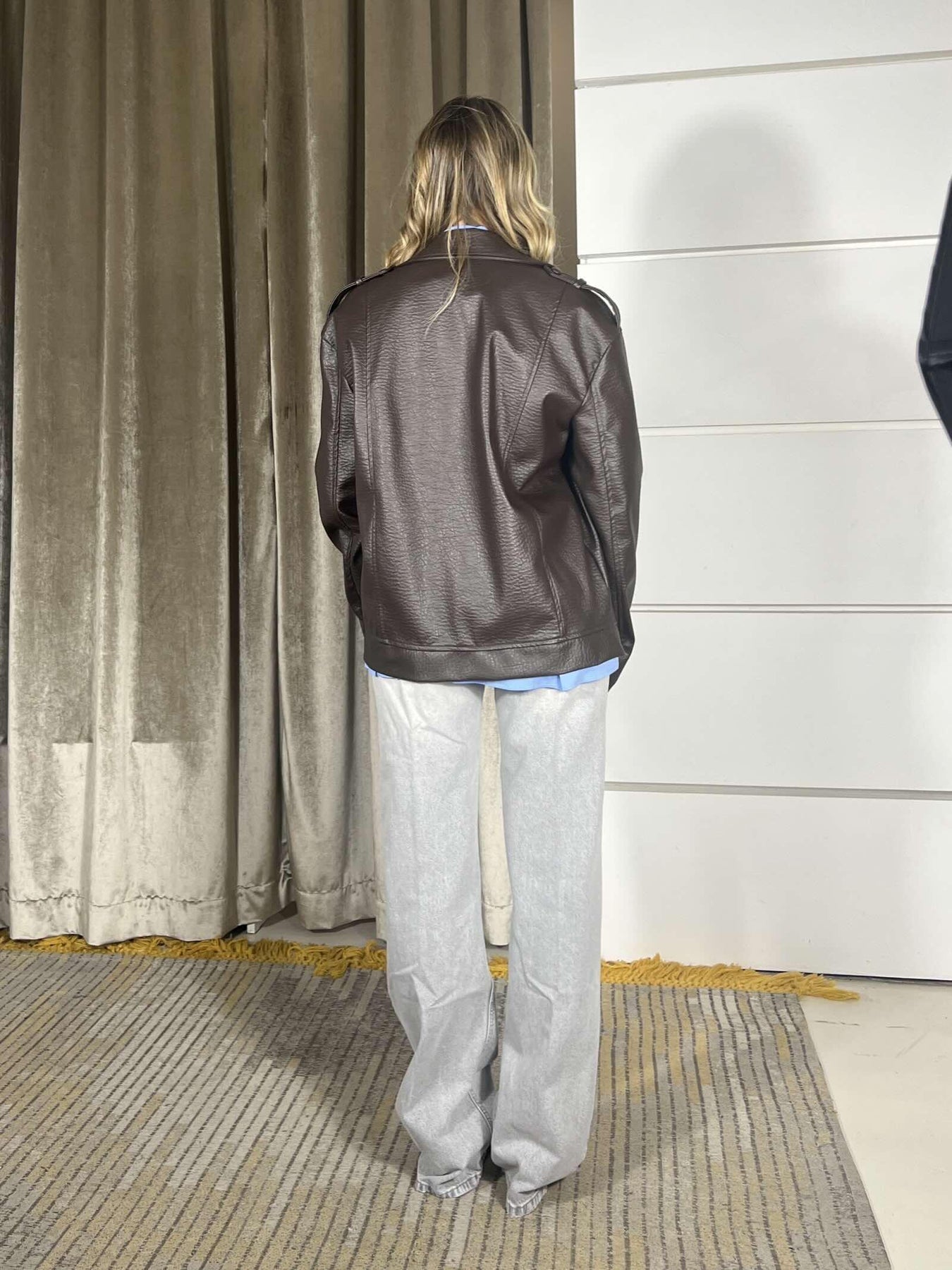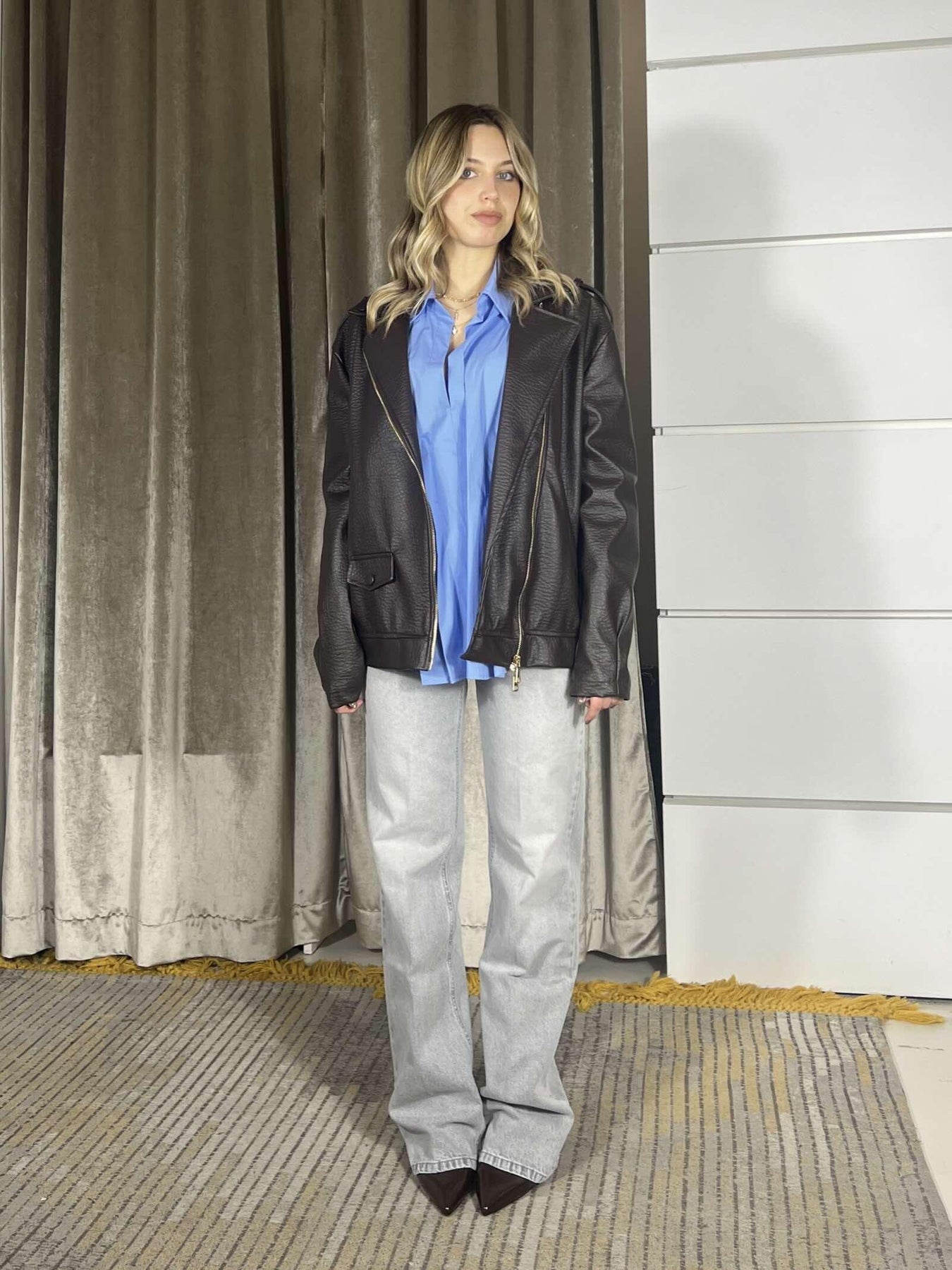 Chiodo HaveOne modello over in ecopelle, la modella indossa la s ed è alta 170cm. Composizione 75%pl 25%co + 100%pl