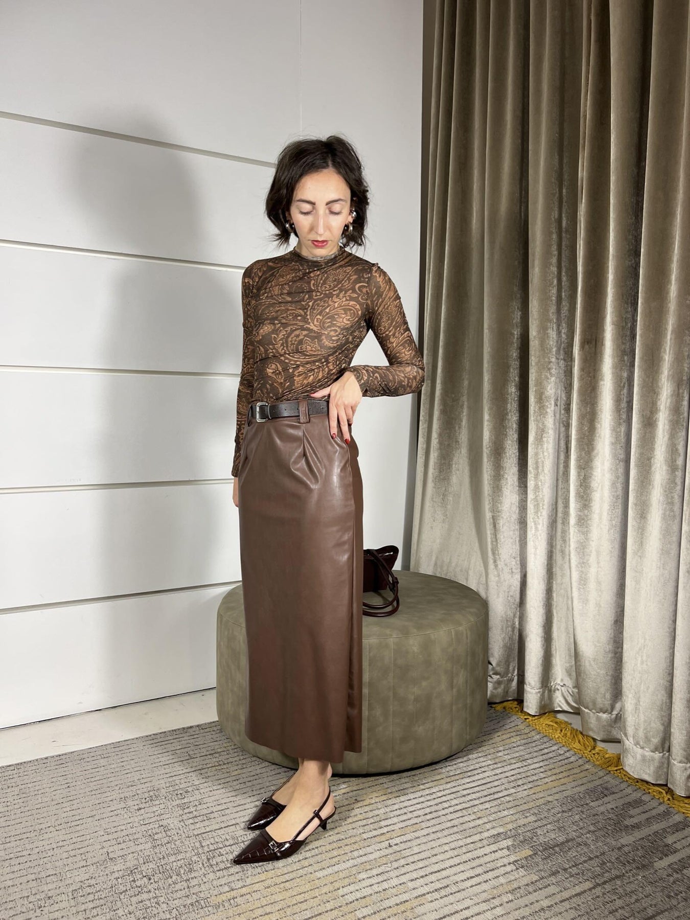 gonna HaveOne moro in ecopelle lunga con cintura , la modella è una 40 ed è alta 172cm e indossa la s, composizione 50%pl 50%pu