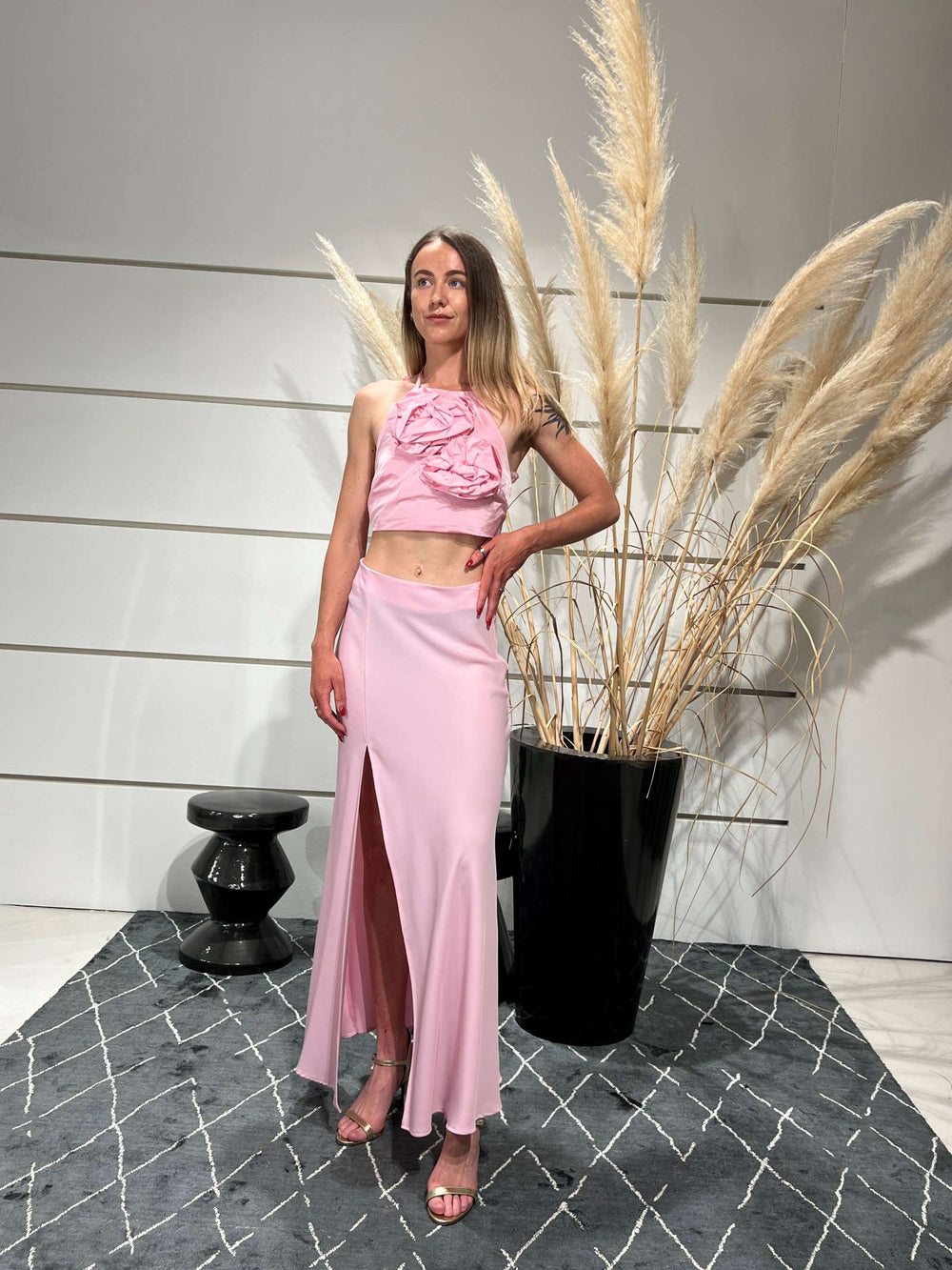 Gonna lunga con spacco laretale Have One, colore rosa, modello fluido con zip. La modella è alta 175 cm e indossa la taglia XS. Abbinata al top con fiori. Composizione: 95% pl 58% ea-100% pl.