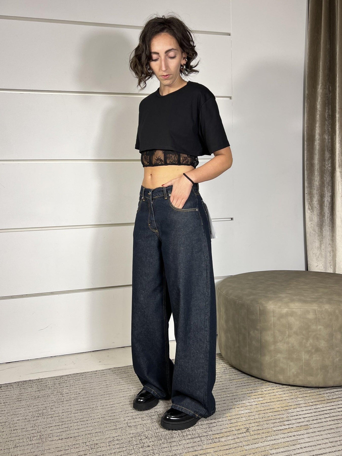 jeans HaveOne modello bella denim scuro con impuntura a contrasto. La modella indossa la xs ed è alta 172cm. Composizione 100%co