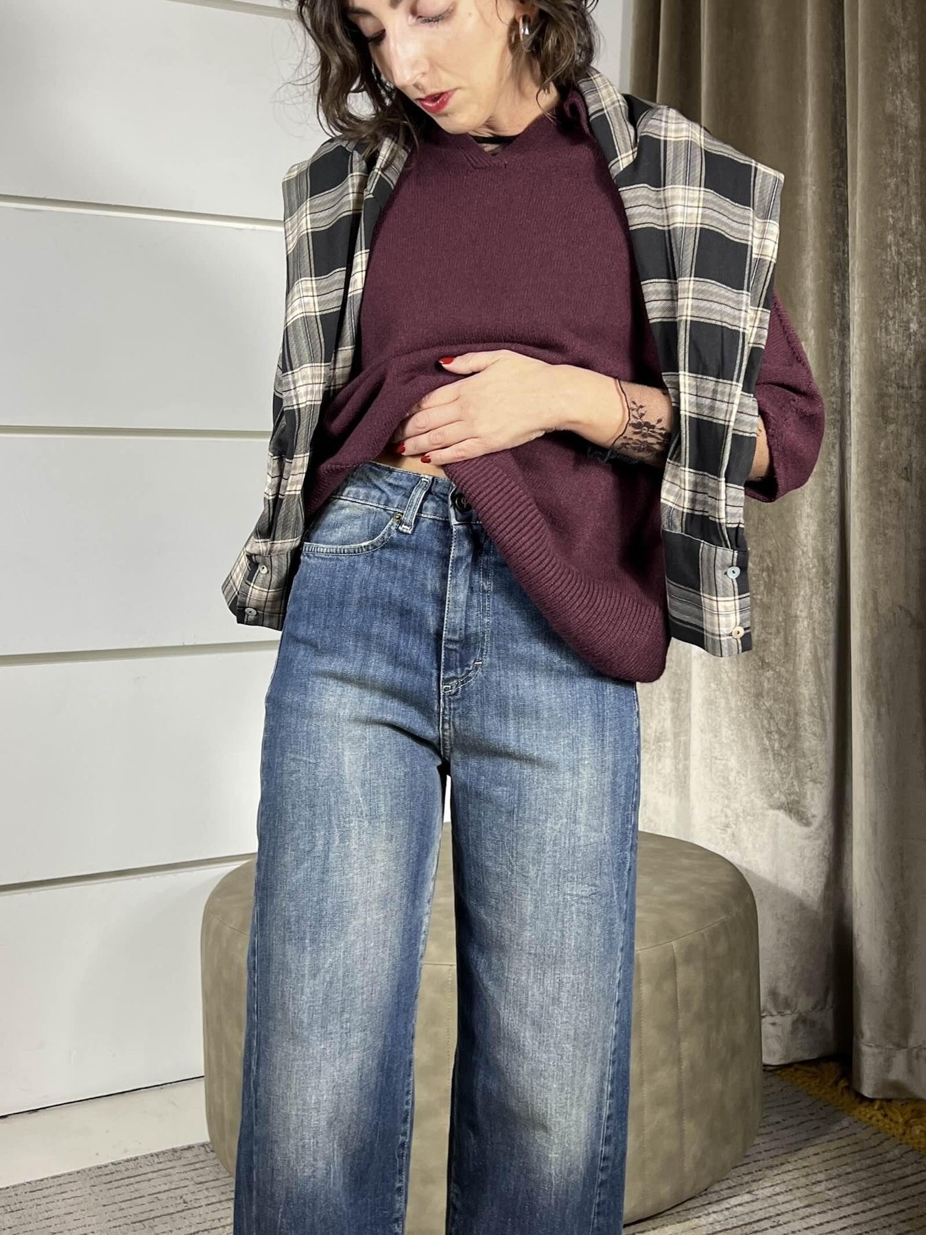 jeans Philia Loft denim medio, vita alta. gamba dritta, leggermente elasticizzato. La modella indossa la s ed è alta 172cm. Composizione 98%co 02%ea
