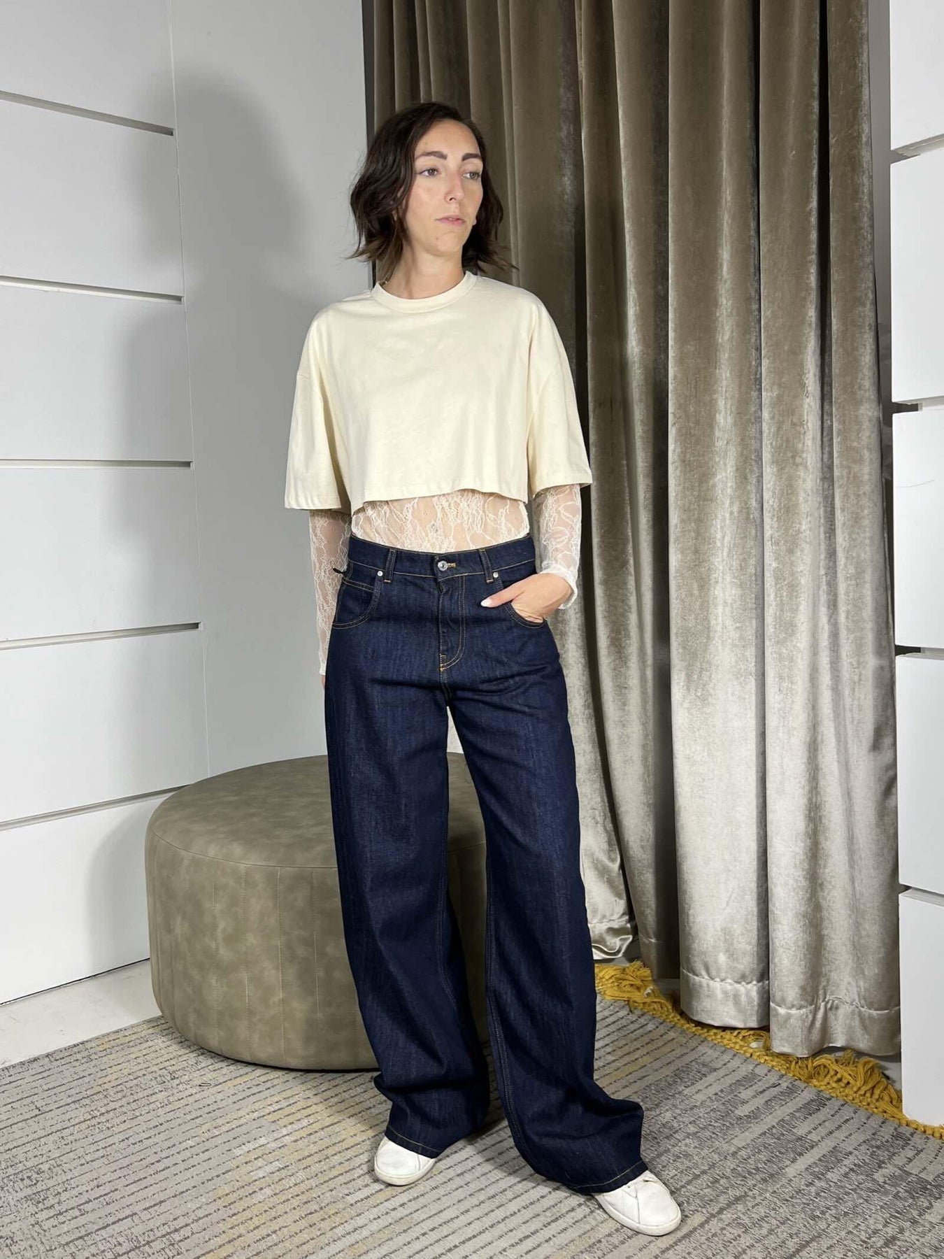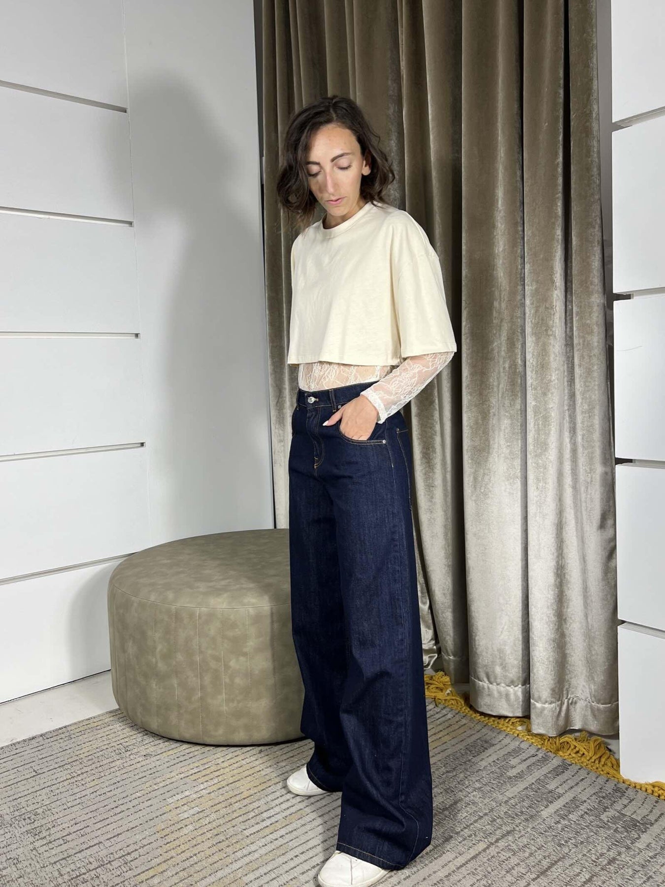 Jeans Vicolo modello Mia, denim scuro con impunture a contrasto, modello baggy, vita bassa, veste abbondante si consiglia una taglia in meno. La modella indossa la xs ed è alta 172cm. Composizione 100%co