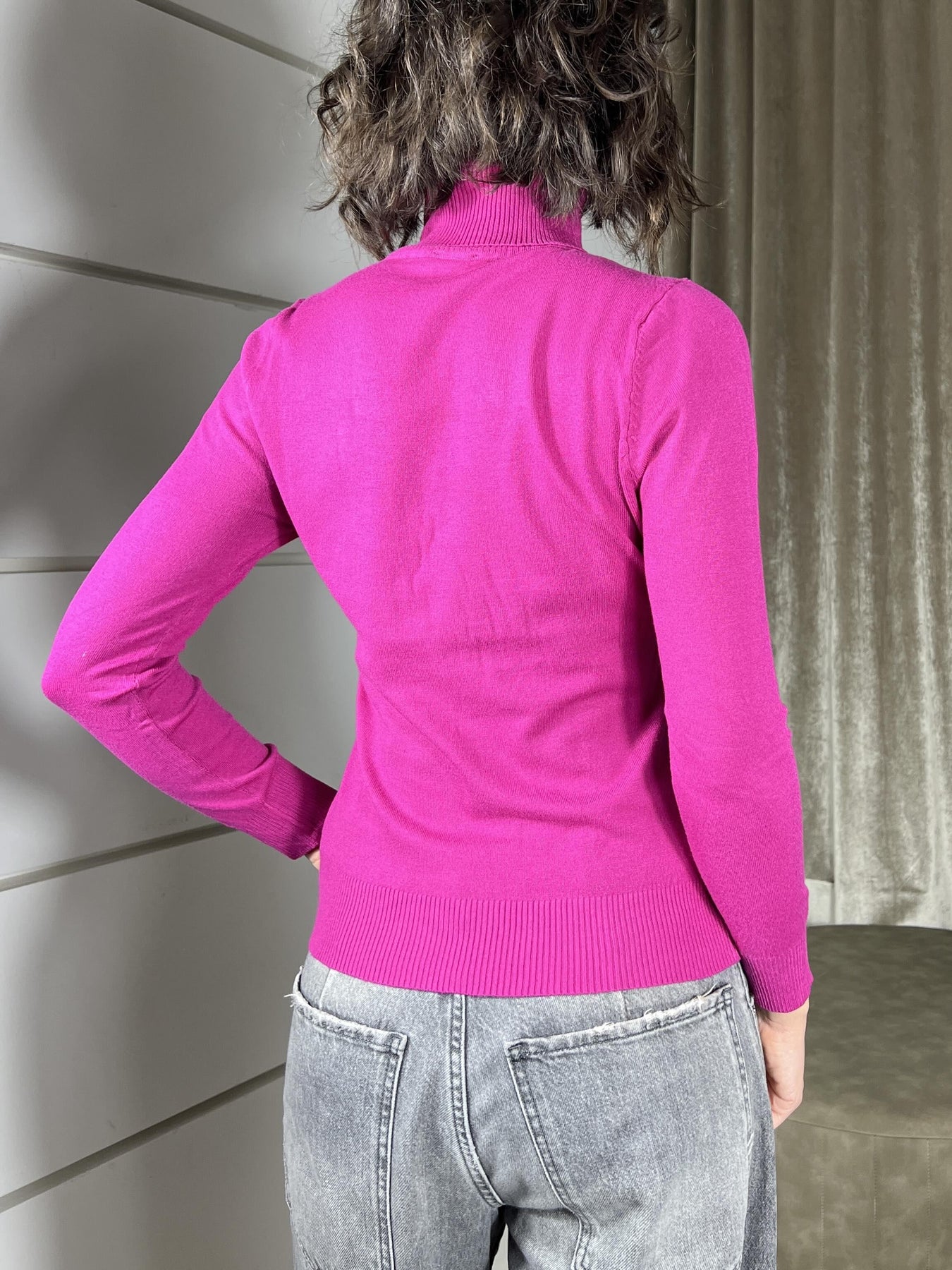 Dolcevita Susy Mix malva ciclista in viscosa, manica lunga, la modella è una 40 ed è alta 172cm. Veste da una 38 a una 46. Composizione 55%vi 45%ny