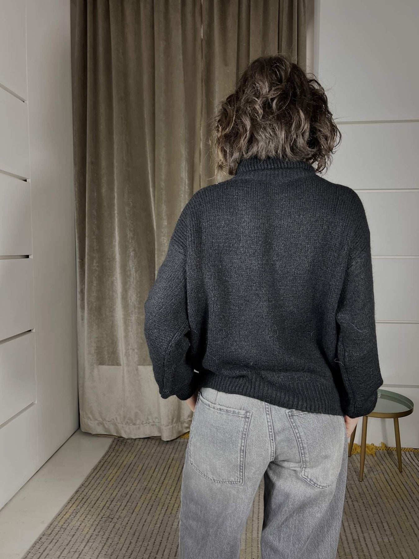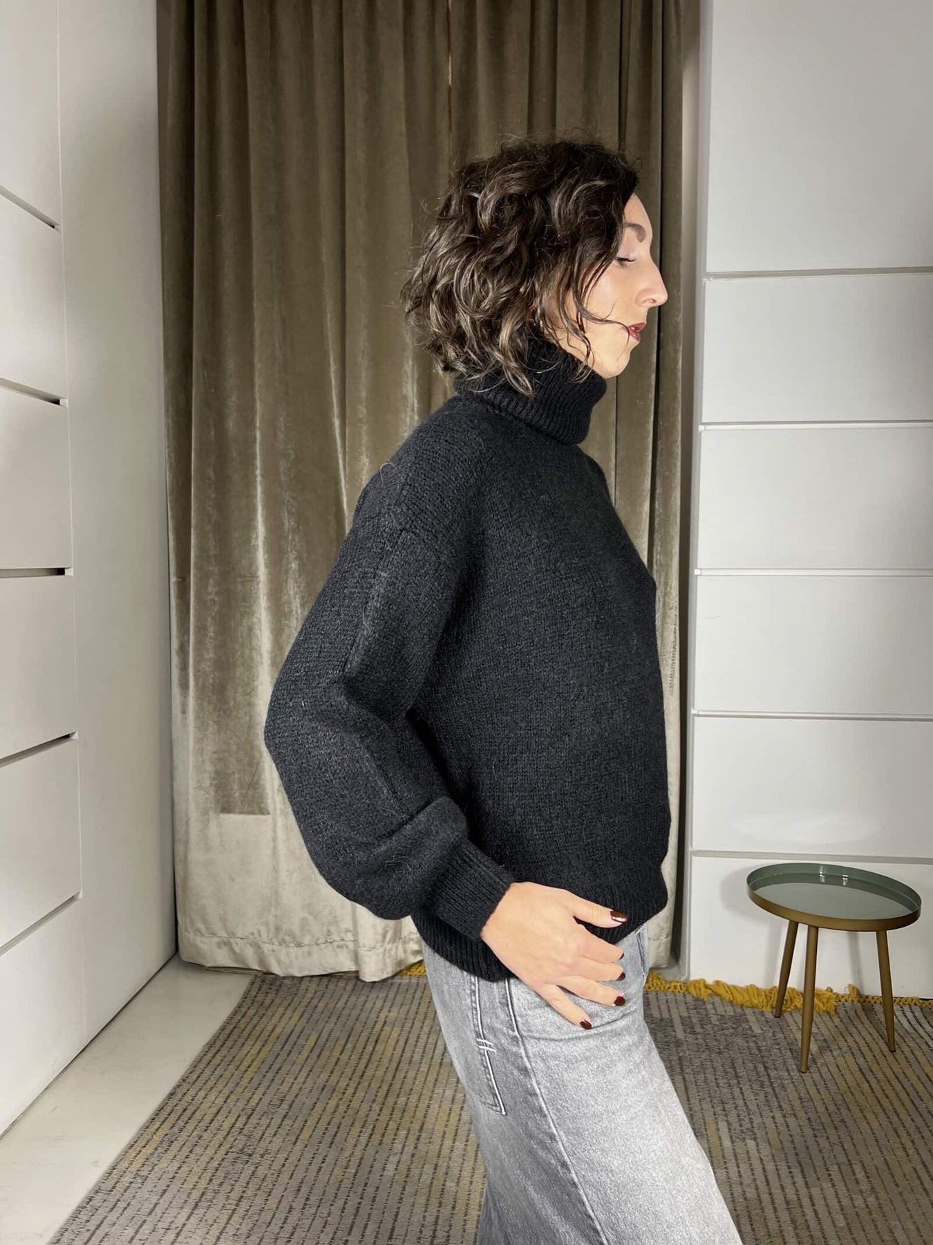 Maglione Susy Mix nrero dolcevita, in misto lana, la modella è una 40 ed è alta 172cm, veste da una 38a una 4. Composizione 45%ac 36%pa 8%wp 7%wo 3%ea